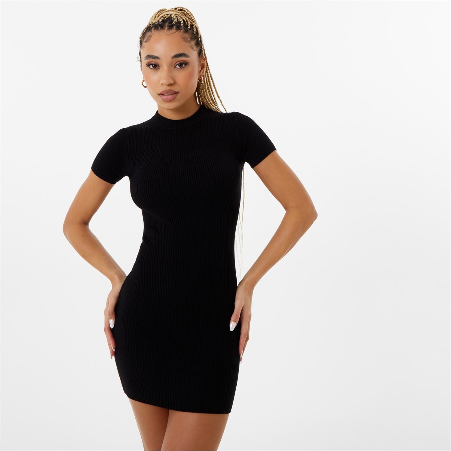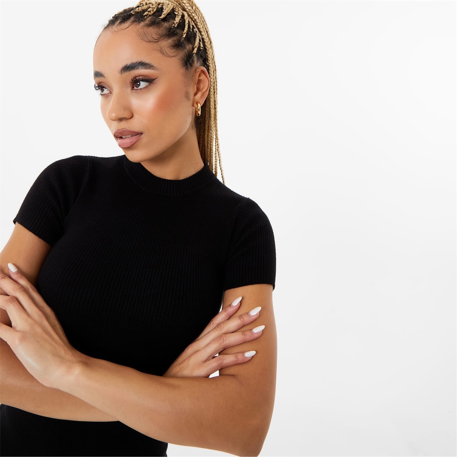 This bodycon mini knit dress features mock neck, short sleeve,solid color.