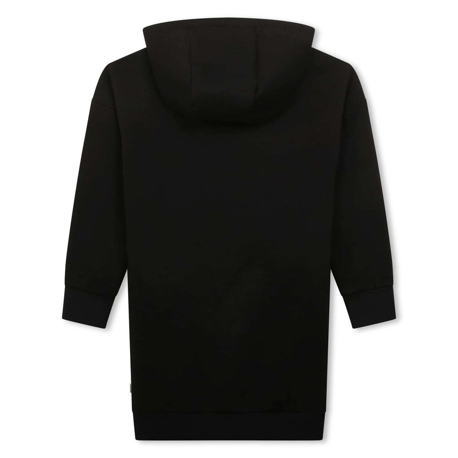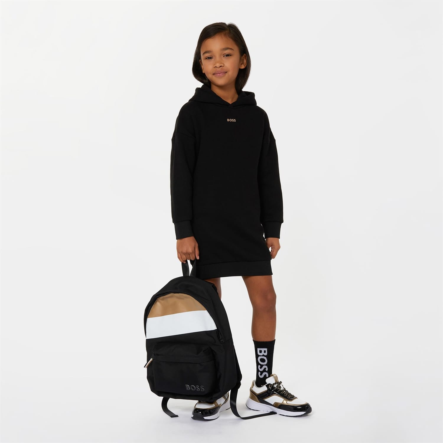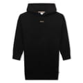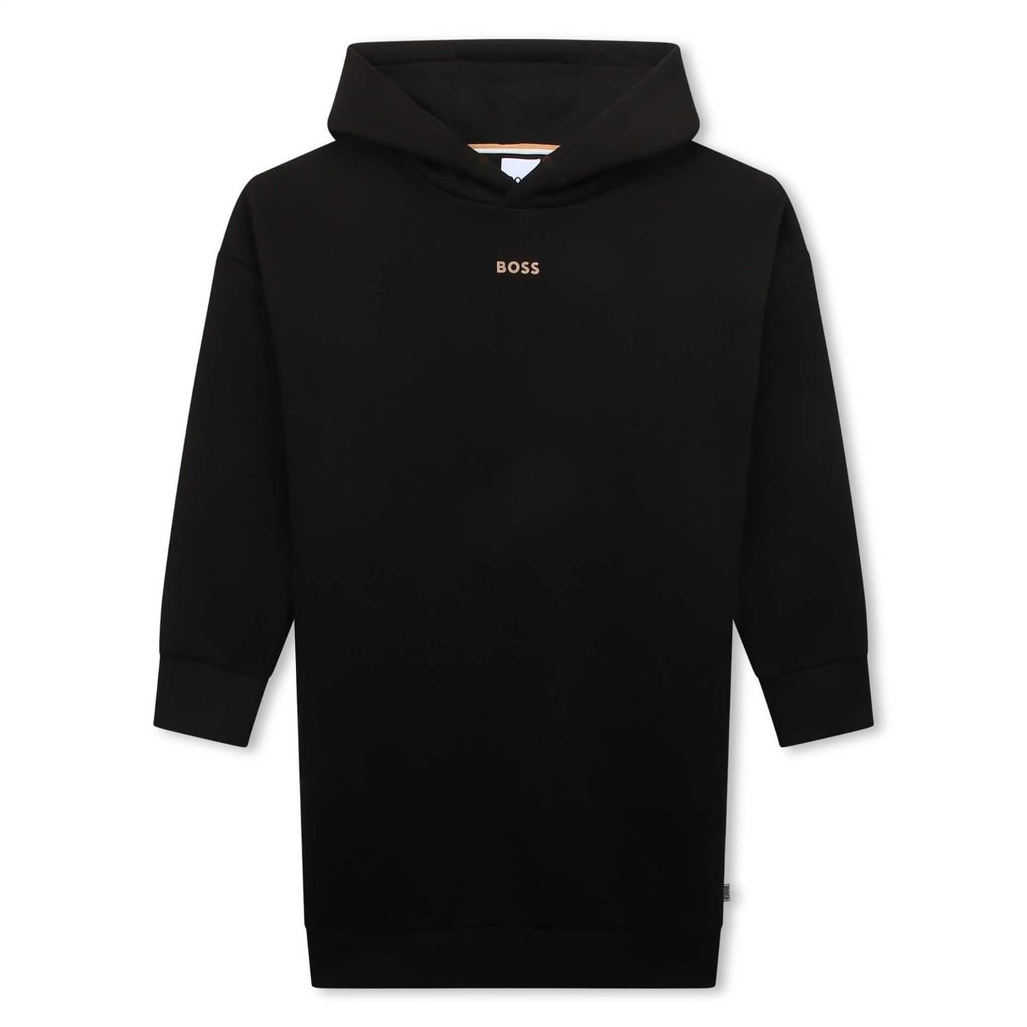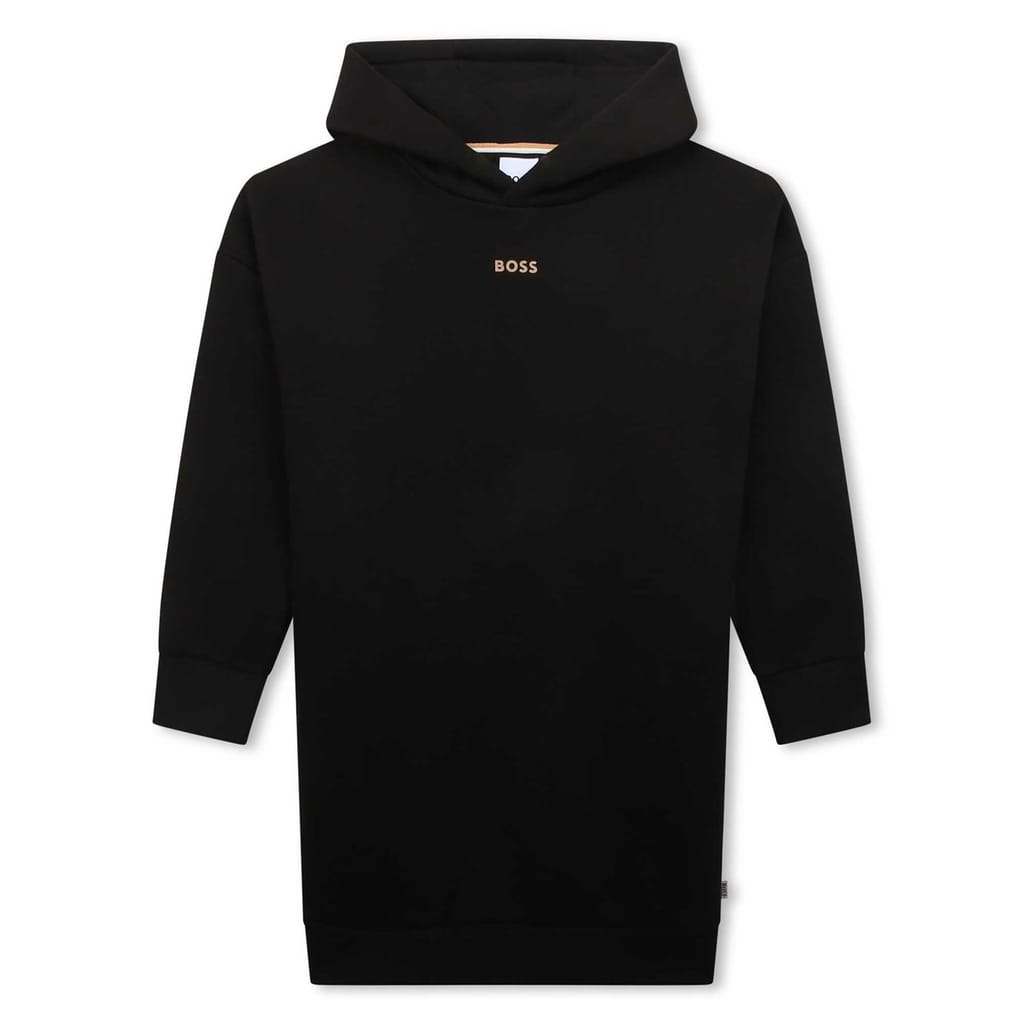 This mini sweatshirt dress from Boss combines sporty and stylish elements. Featuring a hooded neckline and long sleeves, it provides both comfort and coverage. The solid pattern and straight hemline add a clean, contemporary look. The dress is adorned with a subtle logo for a touch of brand recognition. -