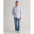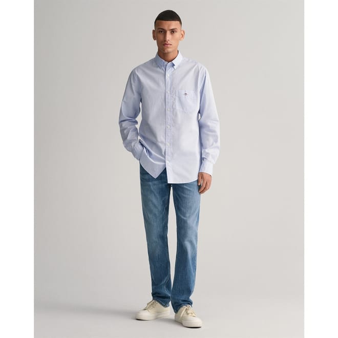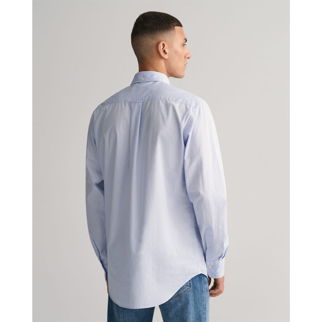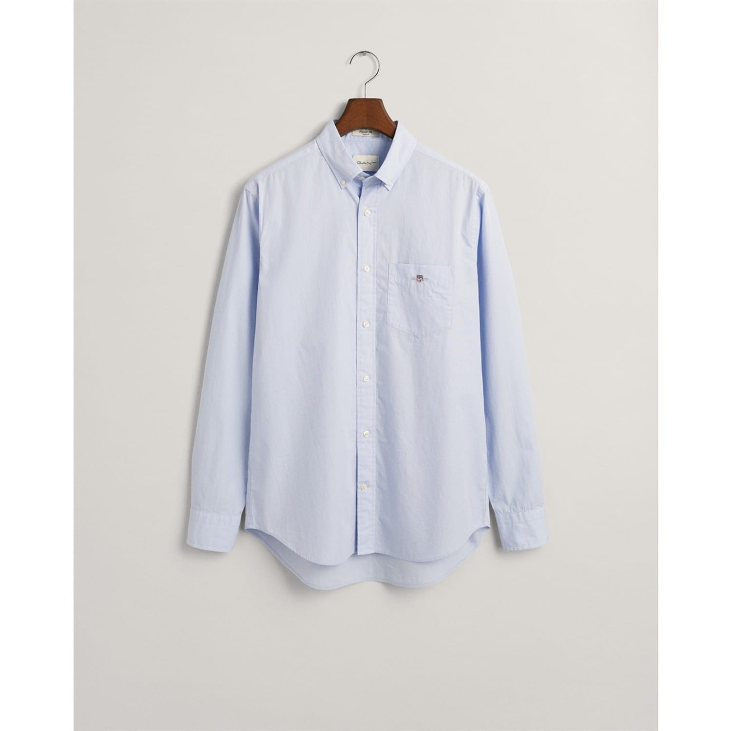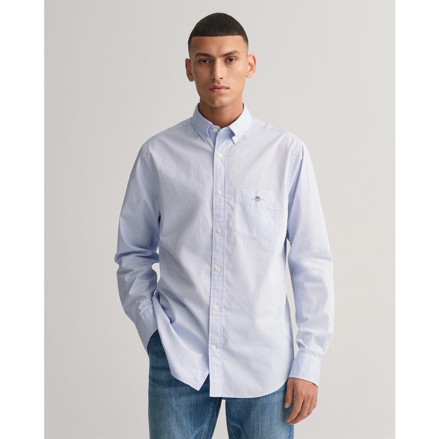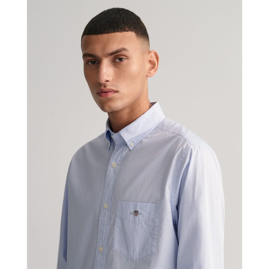 Crafted in a durable poplin weave, this classic shirt is essential to any preppy wardrobe. Featuring an '80s-inspired GANT shield graphic embroidered at the chest pocket and a curved hem, wear it with tailored pants and an upscale shoe for an elevated look. -