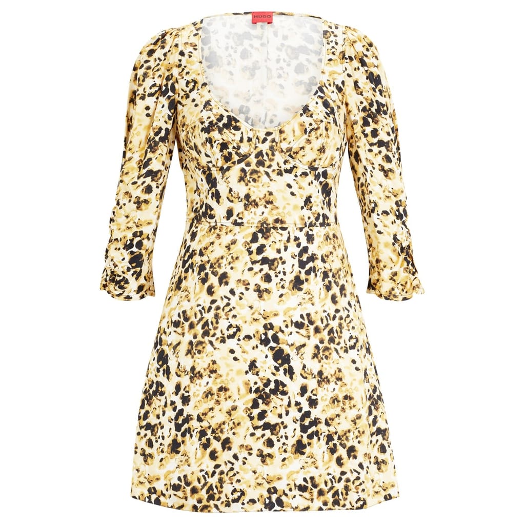 Designed to transition from day to evening seamlessly, the Hugo Kindra Corset Dress is a must-have addition to any refined wardrobe. With a concealed zip closure ensuring a seamless silhouette, this mini dress offers both style and ease. Whether you're off to a garden party or drinks with friends, this skater dress embodies refined sophistication for any occasion.