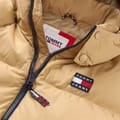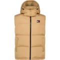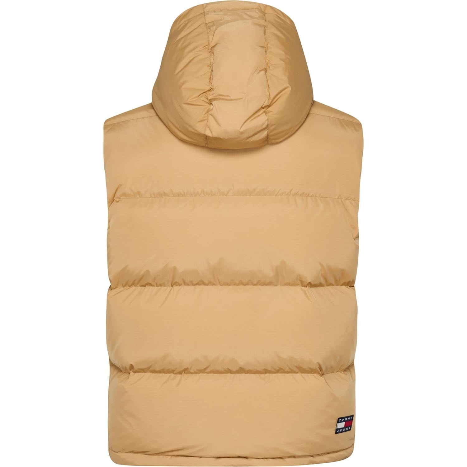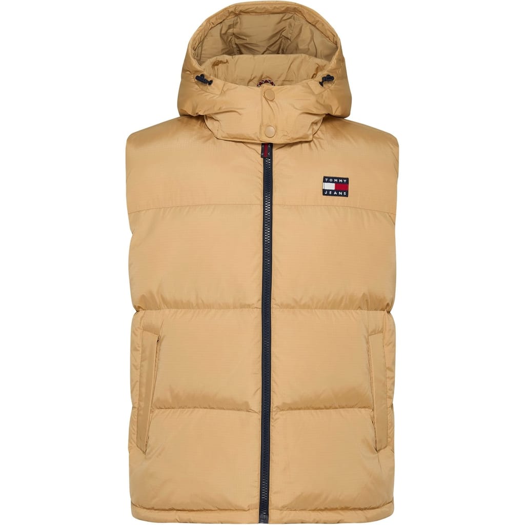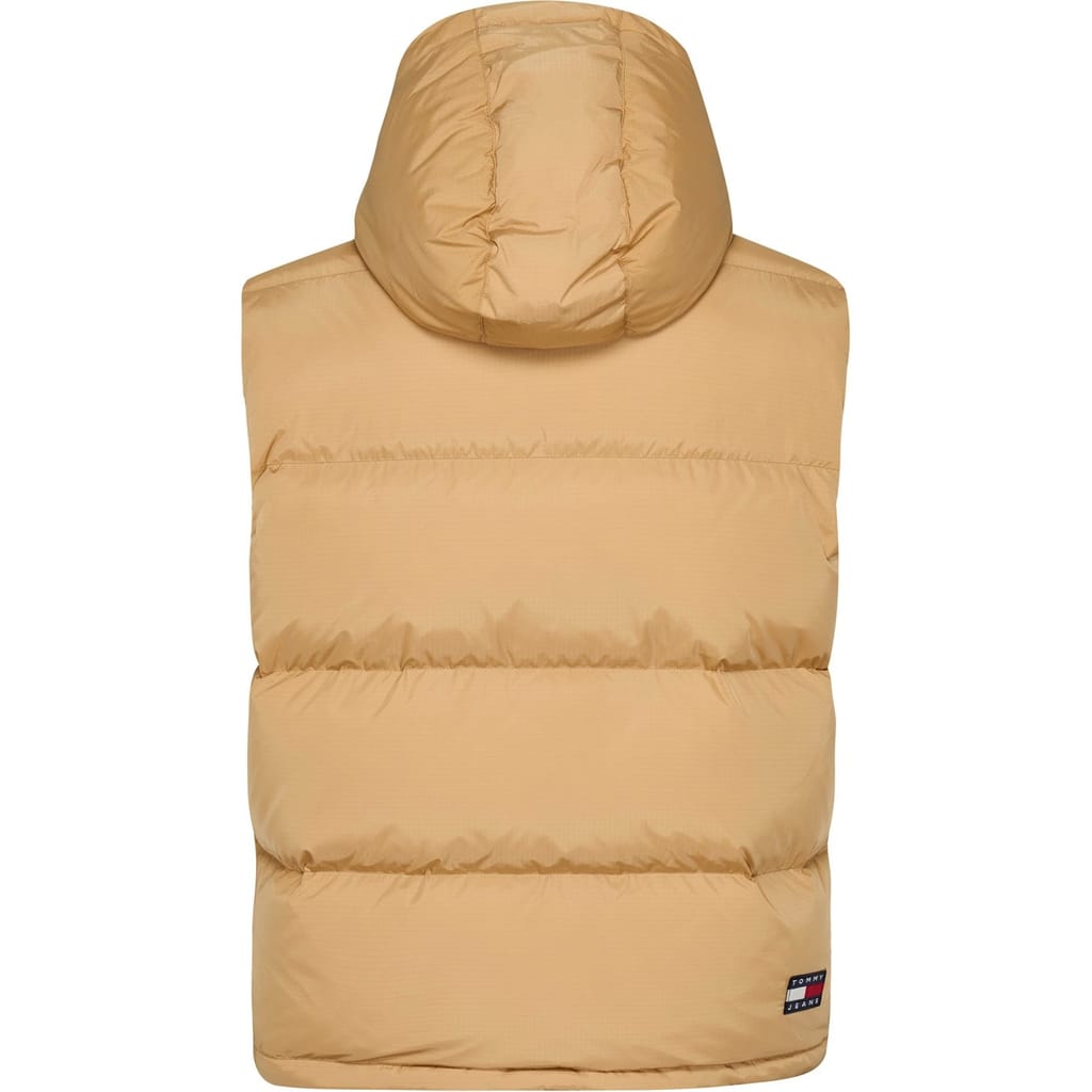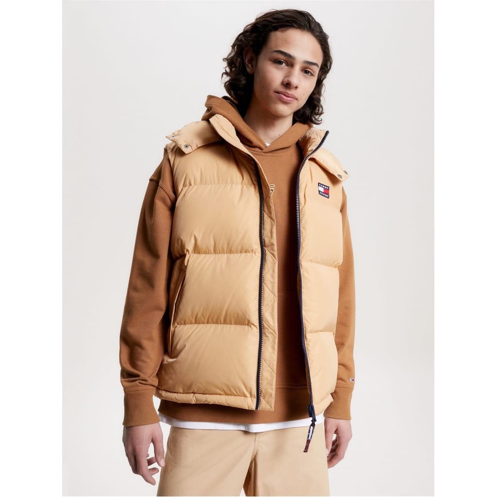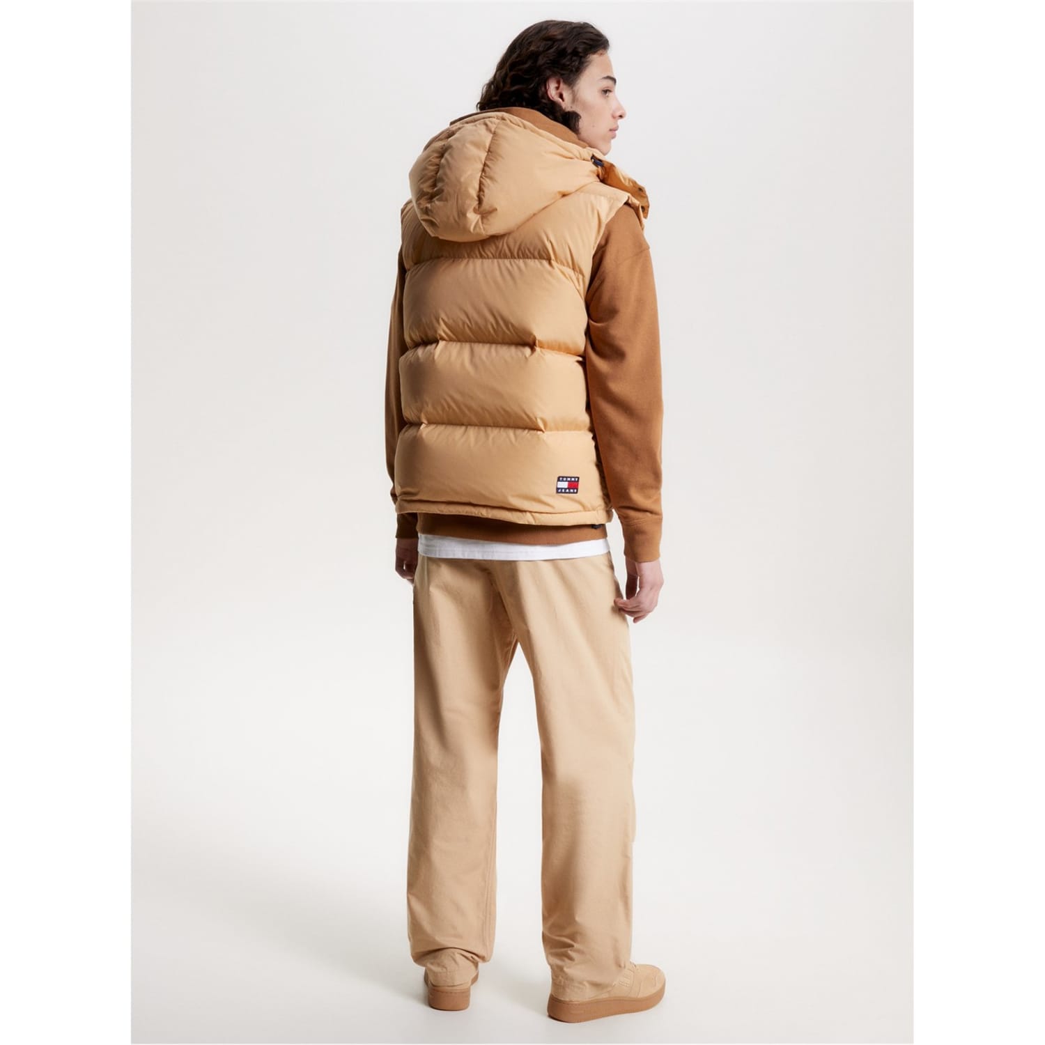 Stay warm with the Tommy Jeans Alaska vest. This heavy-weight gilet from the outerwear collection features a relaxed fit and a straight hem. It boasts a solid pattern and a hooded neckline for extra coverage. The short length design includes a zipper and snap button closure, complemented by front zipper pockets and a logo embellishment for added style. -