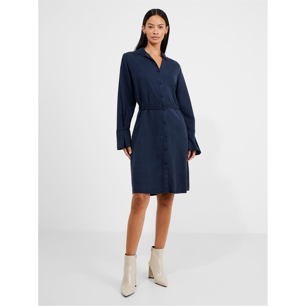 This French Connection shirtdress perfectly balances style and comfort. Featuring a collared neckline and shirt collar, this knee-length dress comes with long cuff sleeves and a button-down closure. The regular fit ensures ease of movement, while the solid pattern and straight hemline offer a sleek look. The added pockets enhance functionality, making it an excellent addition to your wardrobe. -