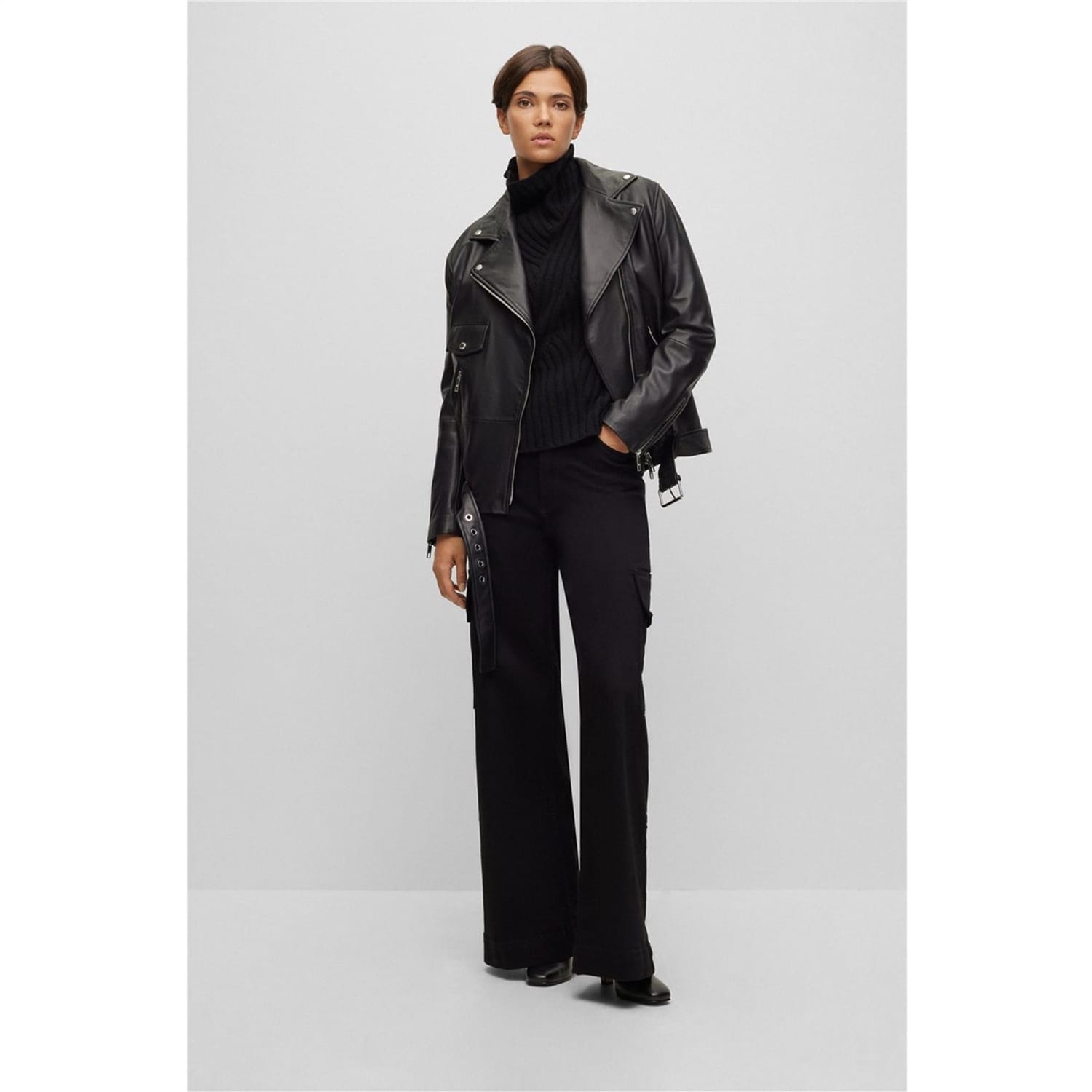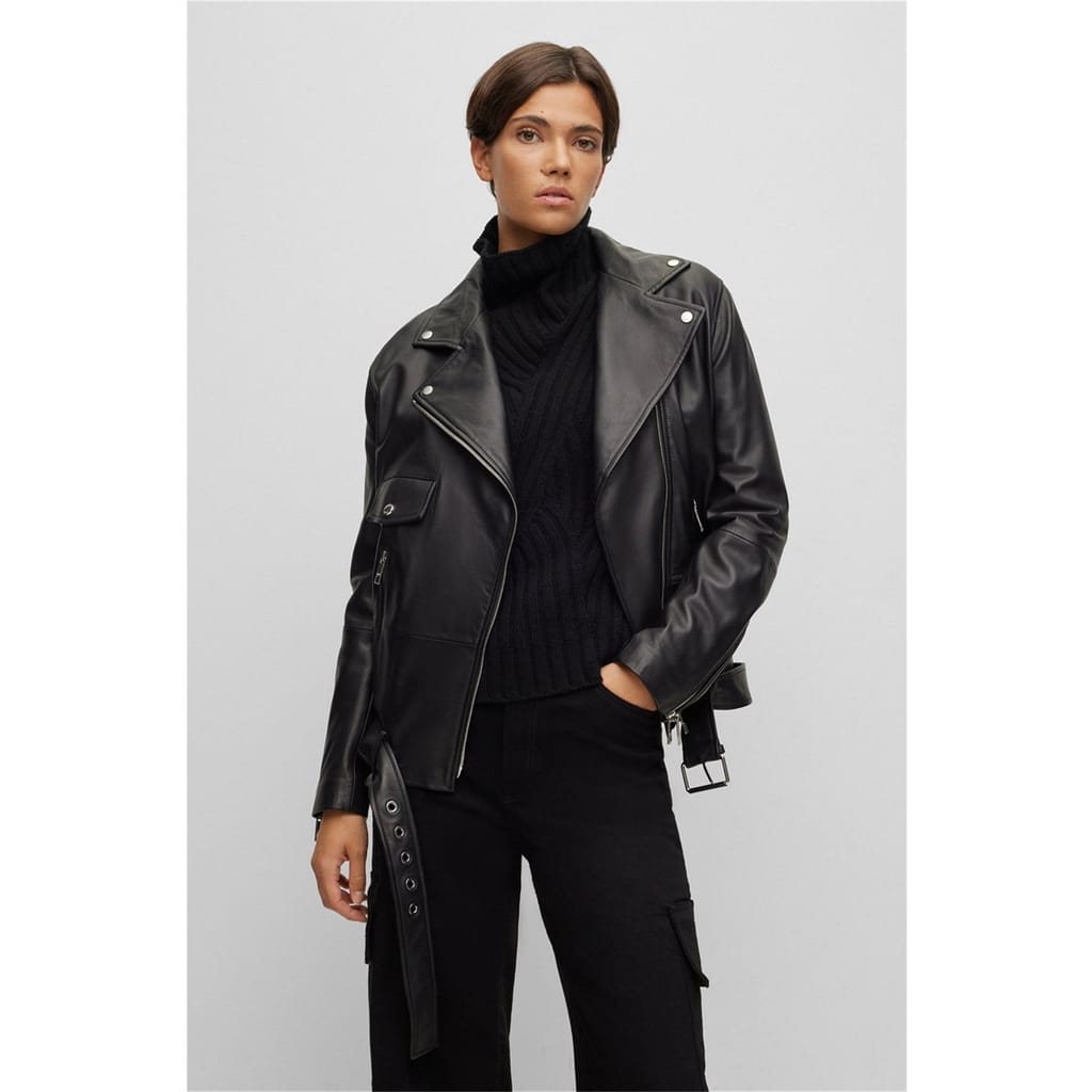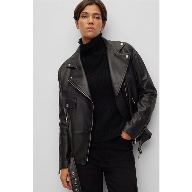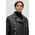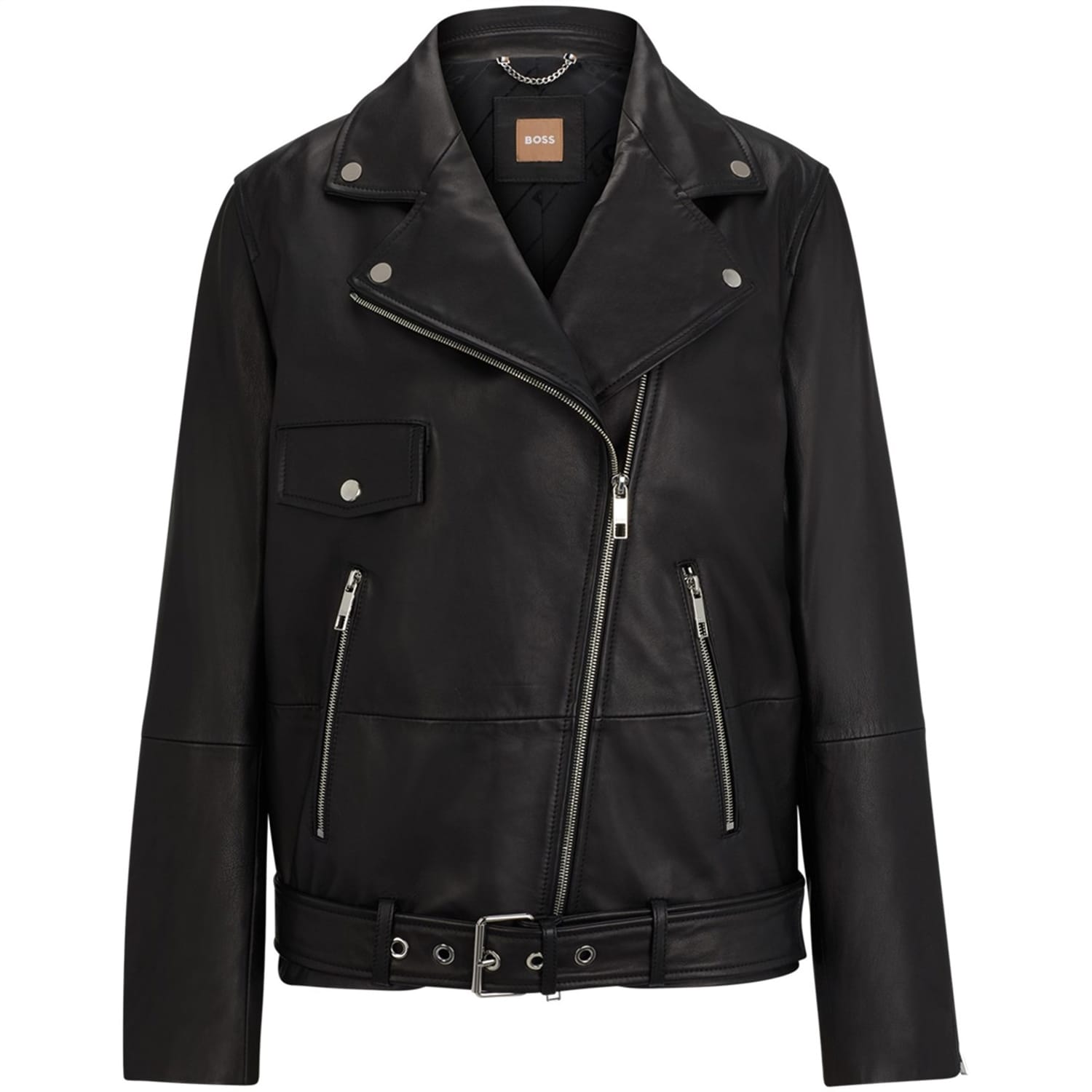 This Boss moto jacket from the outerwear collection is designed for a regular fit. It features a collared neck and long sleeves, offering a classic look. The jacket includes a zipper closure and snap buttons, along with pockets for added functionality. The solid pattern adds to the overall sleek design, making it a versatile addition to your wardrobe. -