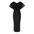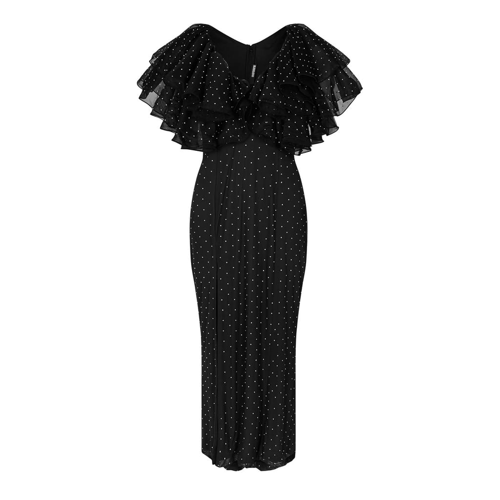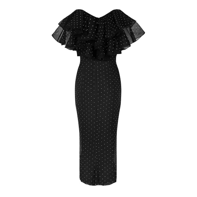 - Crafted from a recycled polyester blend, this timeless creation embraces sustainability while exuding charm. The fully lined design ensures a flawless fit, enhancing the dress's luxurious appeal. With a rear zip fastening, slipping into this dress is an effortless experience, allowing you to immerse yourself in its splendour within seconds. The Carmen Midi Dress features a fitted waist that accentuates your figure, while the flirtatious loose skirt adds a touch of gracefulness to your movement. The low V-neck and short sleeves, adorned with delightful ruffle detailing, create a captivating silhouette that captures attention. Drawing inspiration from the allure of evenings spent under the stars, this dress boasts an all-over rhinestone embellishment, radiating an undeniable sparkle that guarantees to make you the centre of attention -