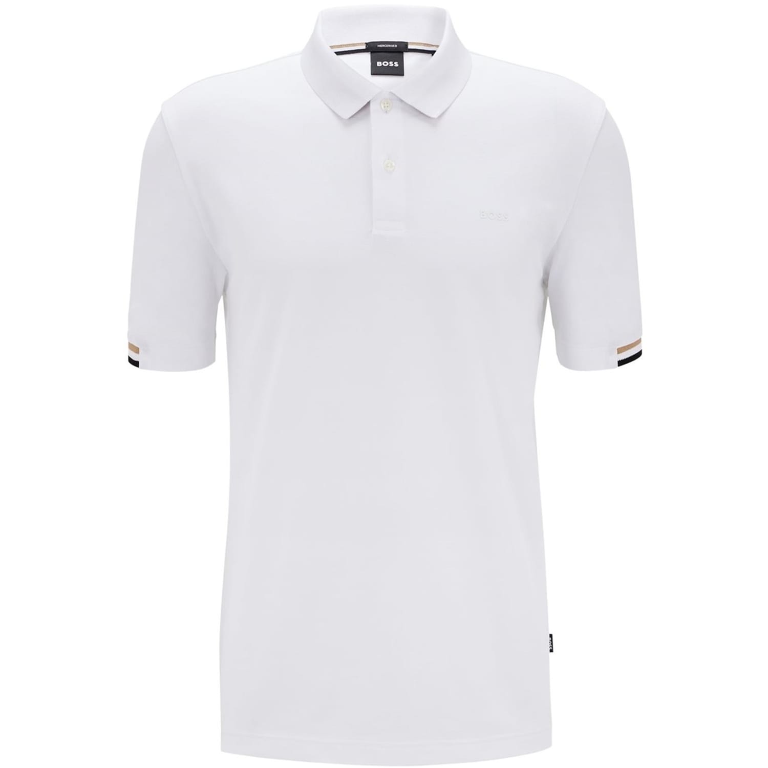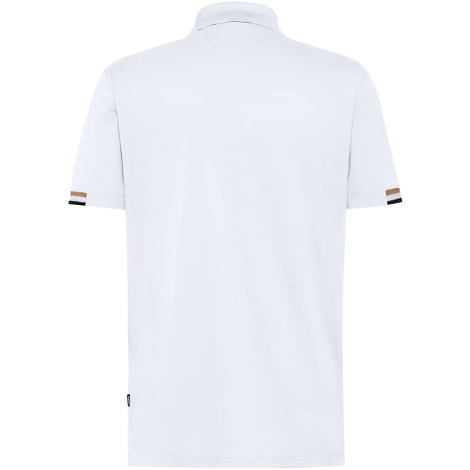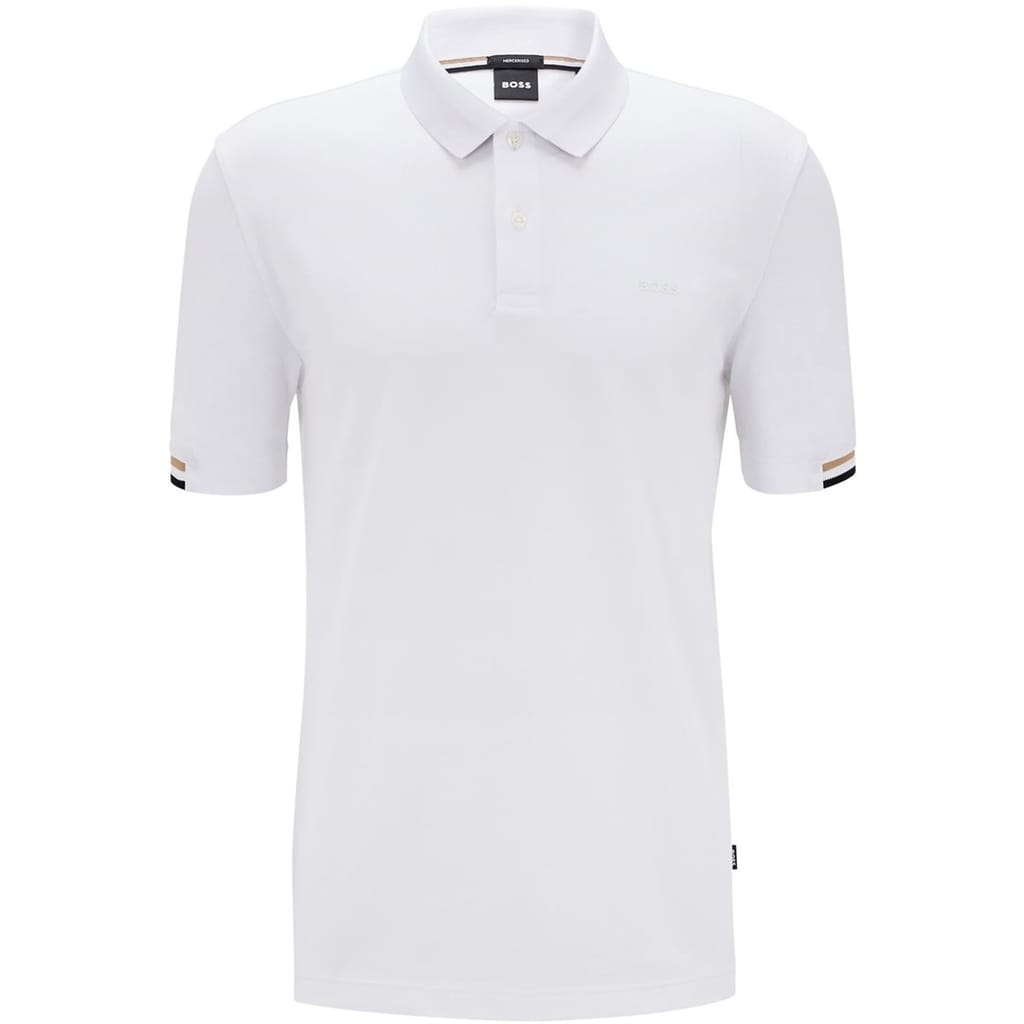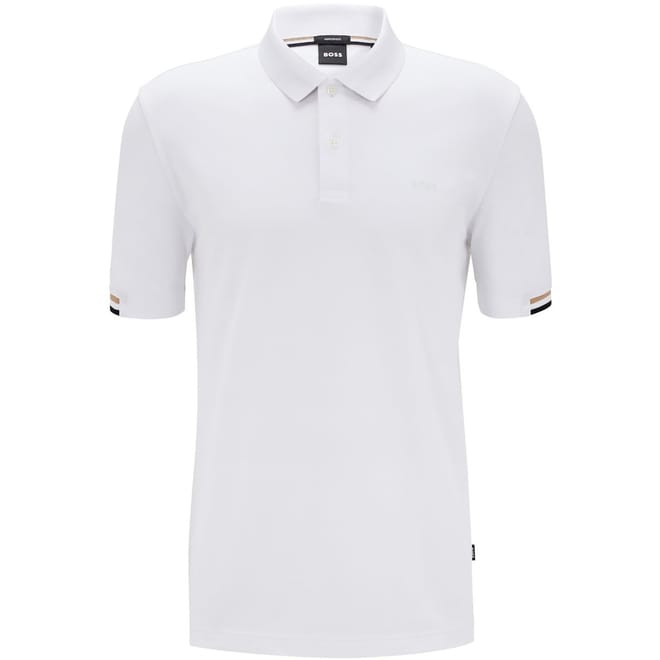 - Striped trim to the cuffs: Adding a contemporary but polished feel to the polo shirt.