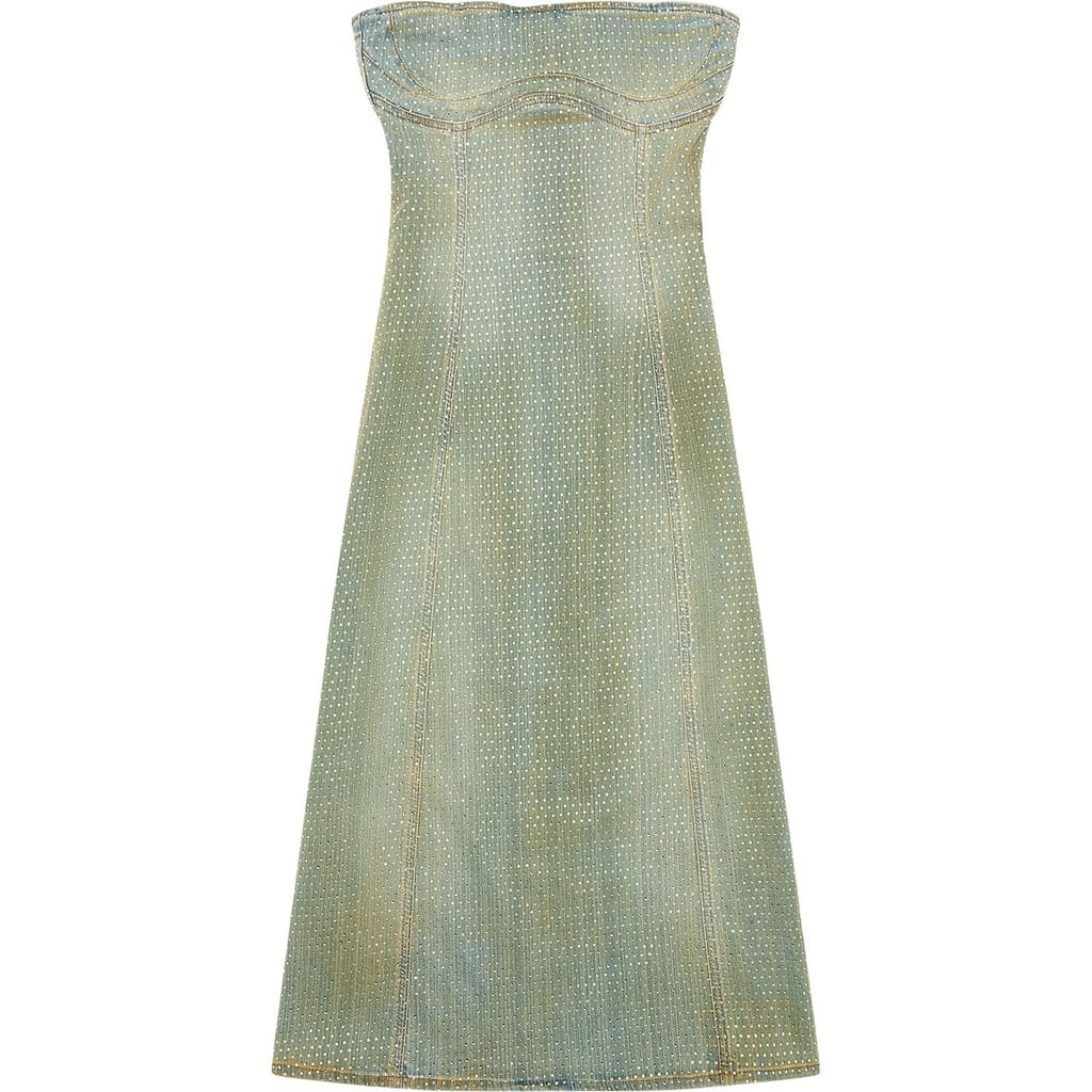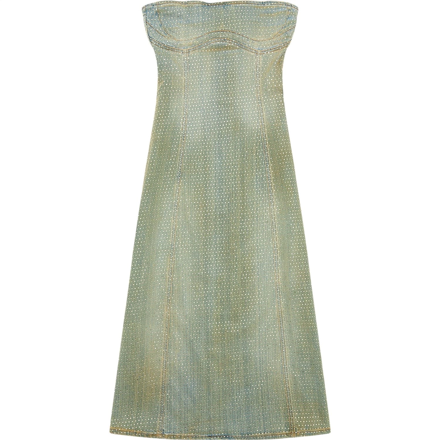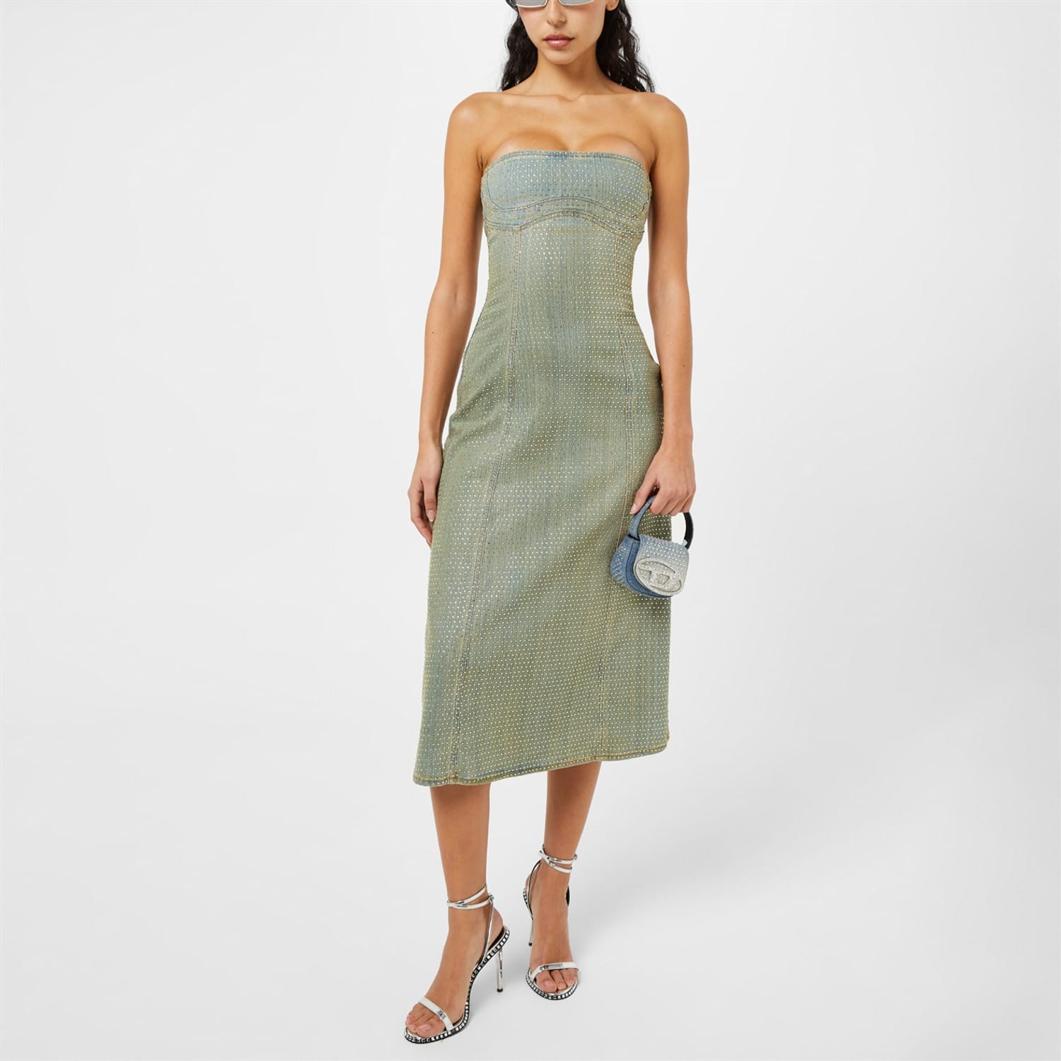 Elevate your wardrobe with this Diesel midi dress. Designed in a bodycon style, it features a straight hem and offers a slim fit for a flattering silhouette. The dress is adorned with rhinestones, adding a touch of sparkle to your ensemble. -