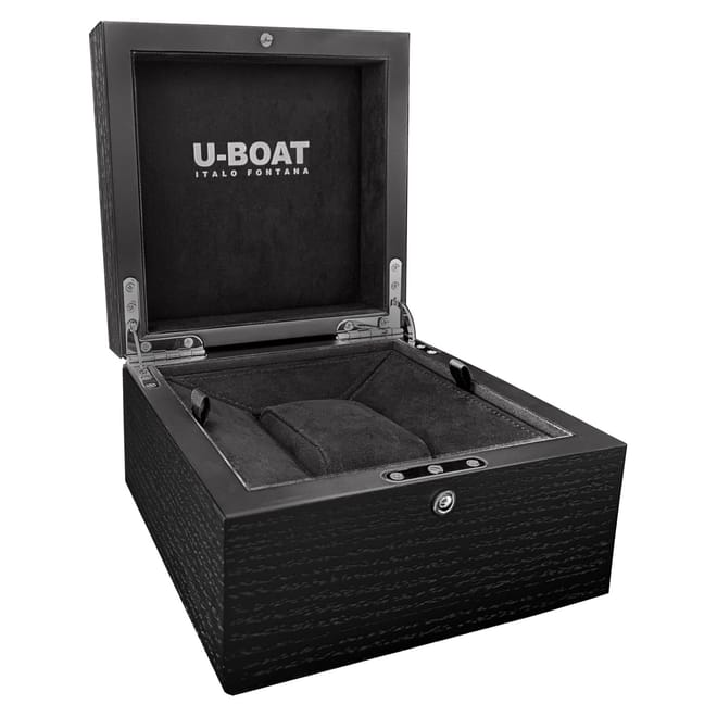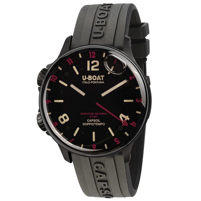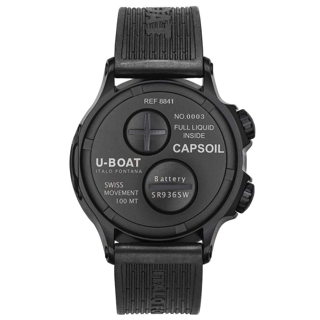 U-Boat Capsoil Doppiotempo goes beyond the boundaries of traditional design, combining innovative features with retro-style lines. The oily fluid flows into the dial making it black and deep which surprisingly amplifies the vision of the hands that seem to flow free as in absence of glass. -