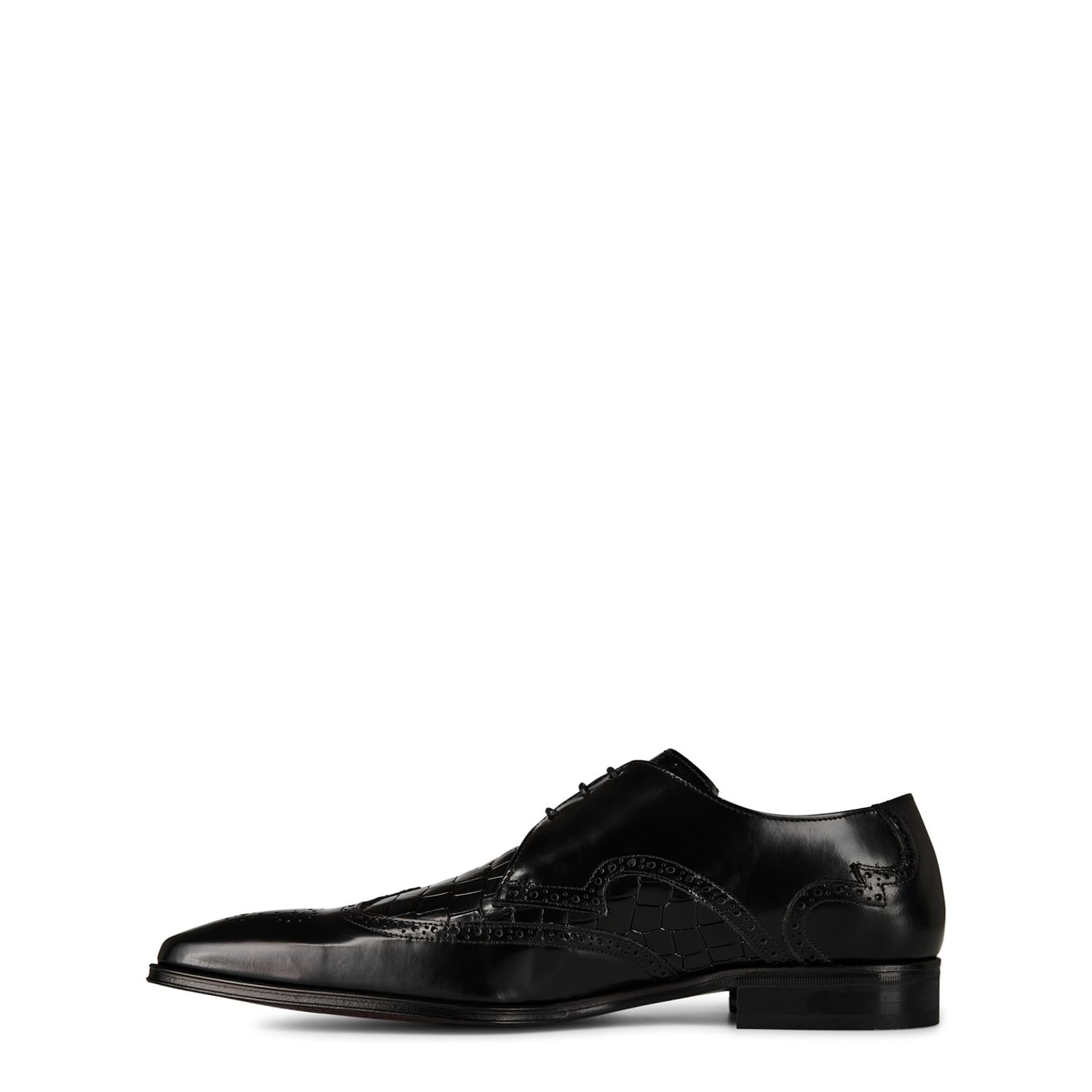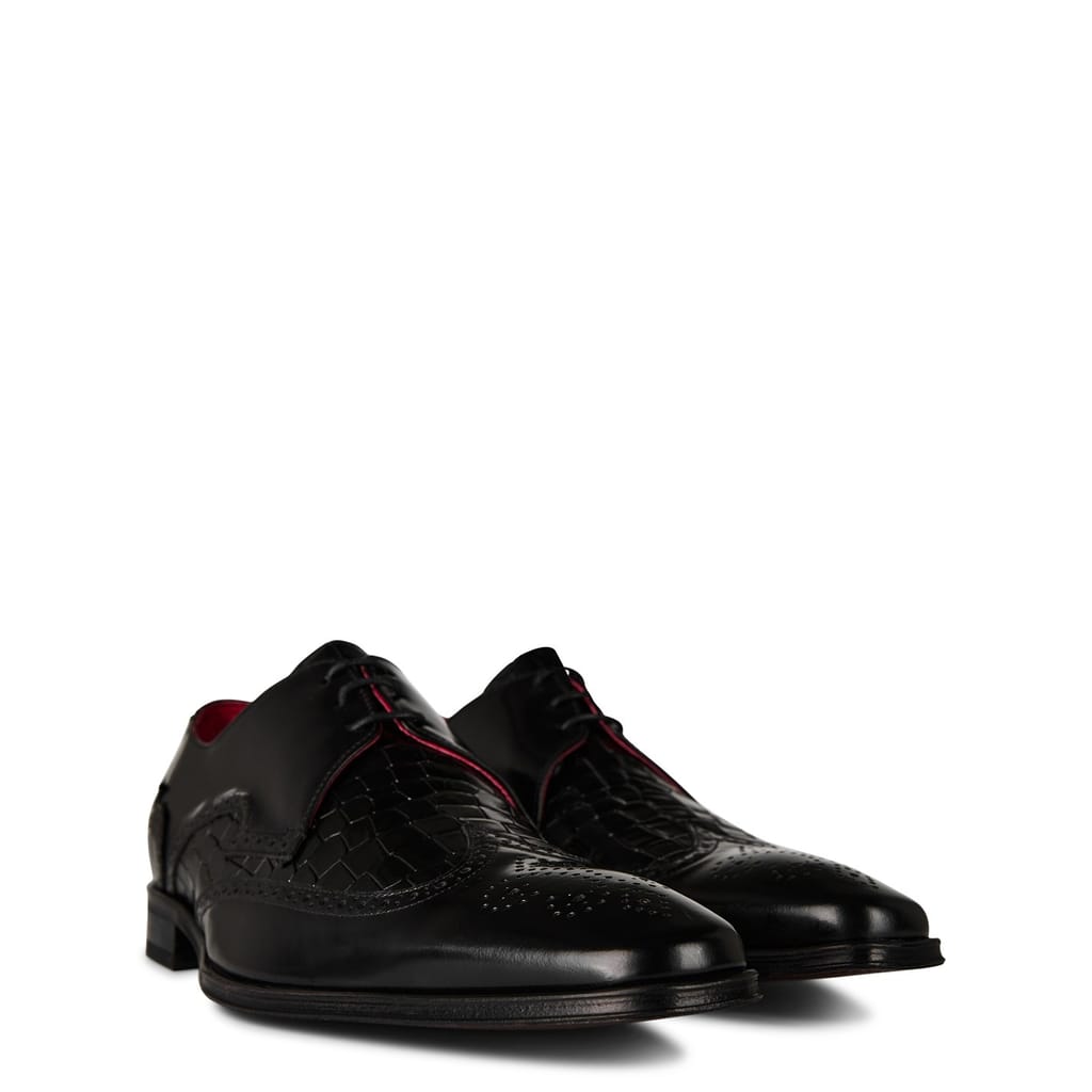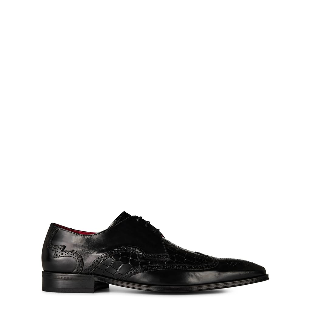 - The brand's commitment to quality craftsmanship and design is evident in these shoes, as the intricate punctured brogue detailing and red leather lining shows perfection down to the very last detail. The crocodile effect vamp front adds a unique touch not often found in traditional formal footwear, seamlessly blending tradition with an individual twist. The lace-up front ensures a secure and comfortable fit, while the classic colouring allows for endless versatility. These ox -