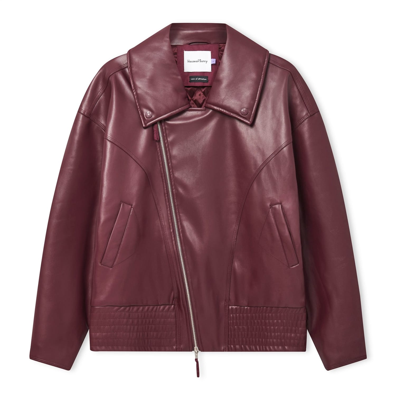 The House of Sunny hybrid moto jacket features a collared neck and a relaxed fit. This solid short jacket is designed with a zipper closure and snap buttons for added convenience. Embellished with pockets, it offers both style and functionality. -