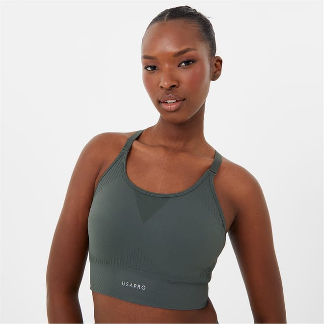 - Crafted from a blend of Nylon and Elastane for a stretchy fit, this cropped silhouette offers ultimate comfort during those intense workouts. Designed with seamless technology to ensure an irritation-free experience no matter your yoga position, the removable cups provide customisable support and shape, catering to your individual needs. Designed with the Pro Dry technology, this bra effectively wicks away sweat, keeping you dry and comfortable during intense workouts. Accompanied with adjustable cross-over straps to the rear for additional and customisable support, USA Pro branding showcases your dedication to performance and style.