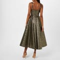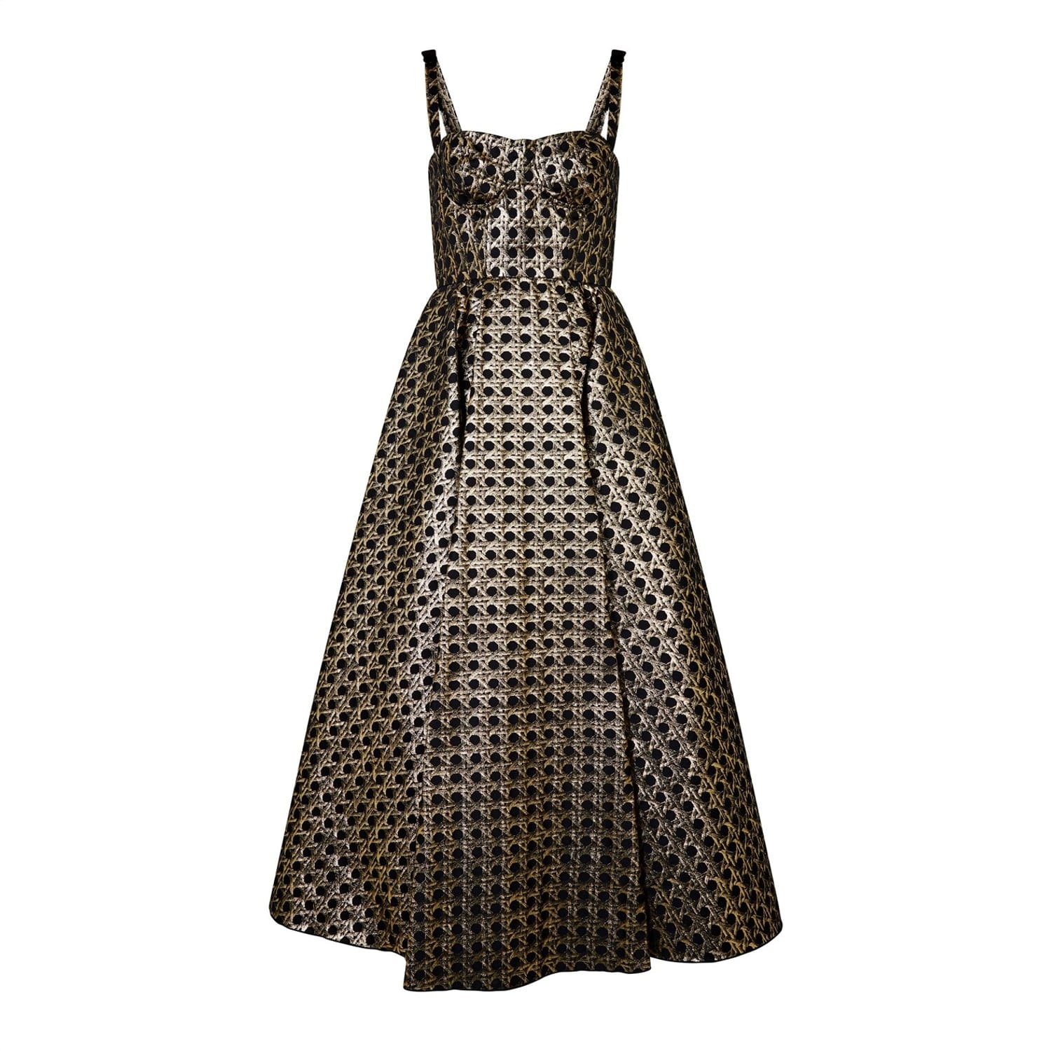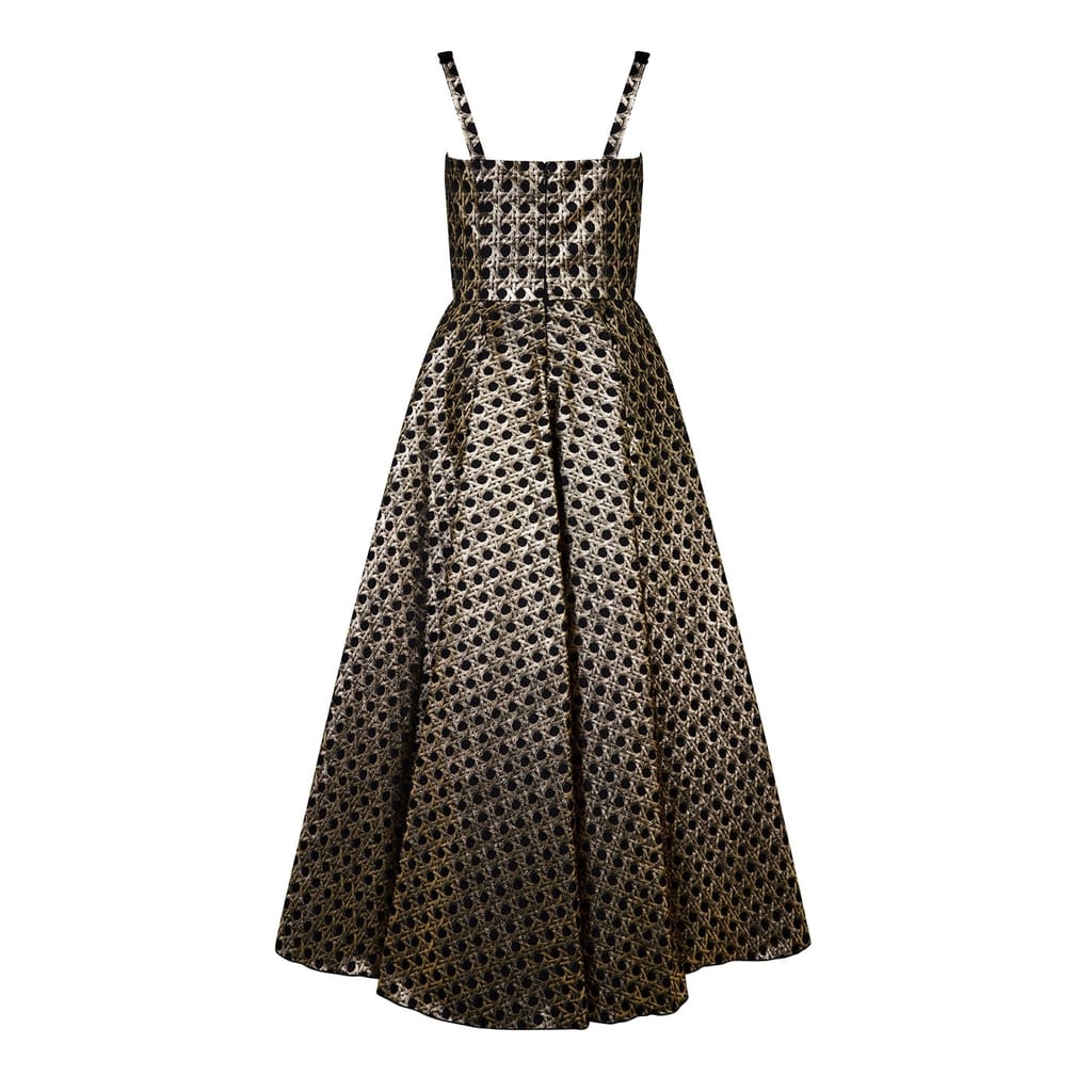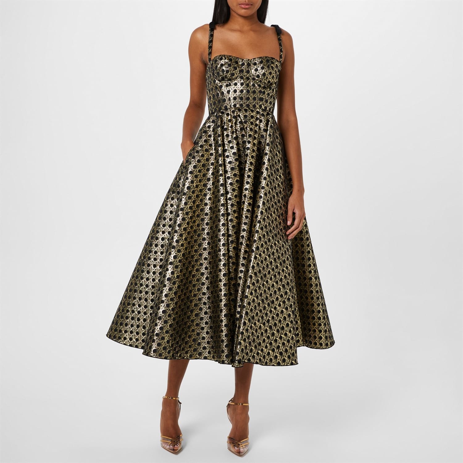 This Giambattista Valli midi dress features a striking geometric pattern and a flattering A-line silhouette. The sweetheart neckline and spaghetti straps add a touch of elegance, while the hi-lo hemline creates a dynamic look. Embellished with a bow and strap detail, this dress is a perfect blend of style and sophistication. -