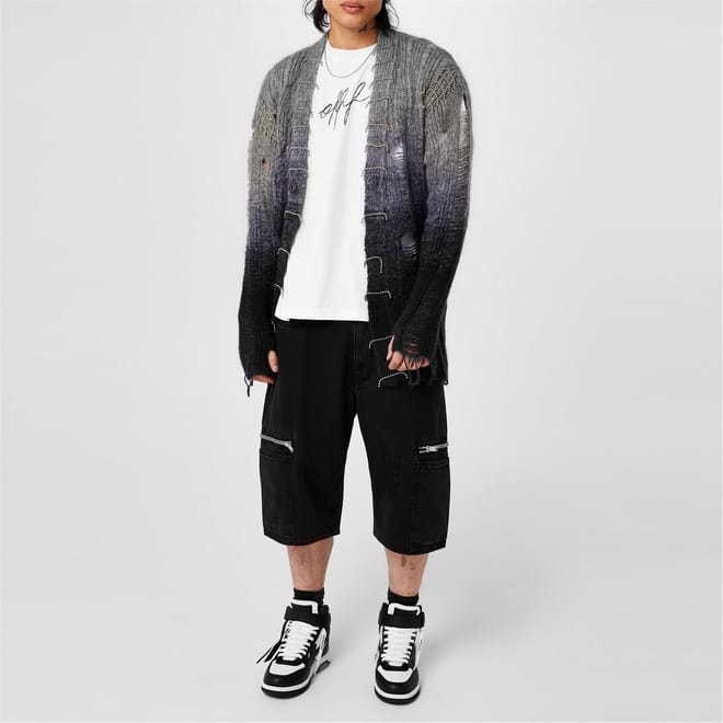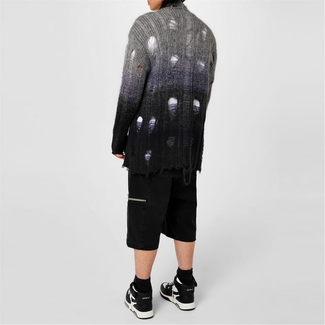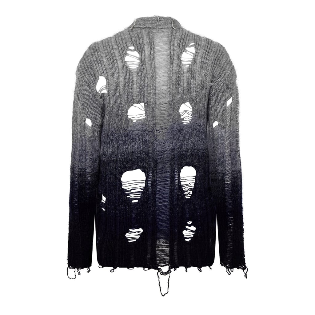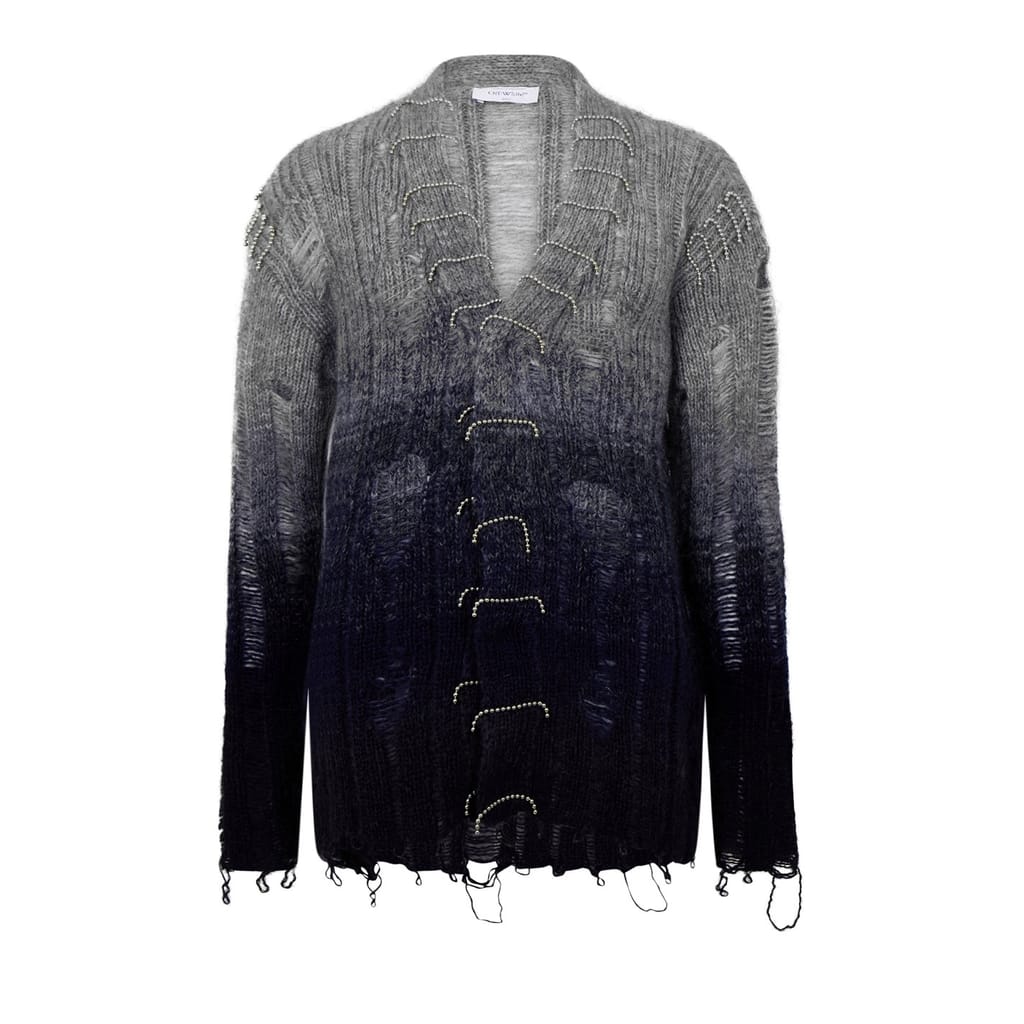 -This Punk Degradé Cardigan effortlessly epitomise the house's melting pot of influences, masterfully constructed in a high-quality mohair blend. Full-length sleeves and glistening ball-bearing appliques frame the classic V-neckline, while three concealed snap fastenings on the front provide a secure fit. All-over distressed and frayed detailing subtly subverts traditional expectations of luxury, and discreet tone-on-tone stitching completes the construction and brings the elements together into a cohesive whole.