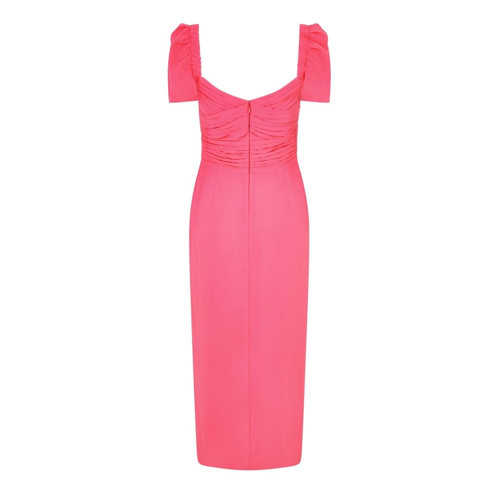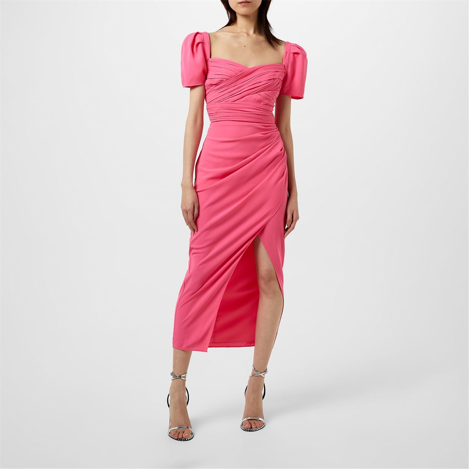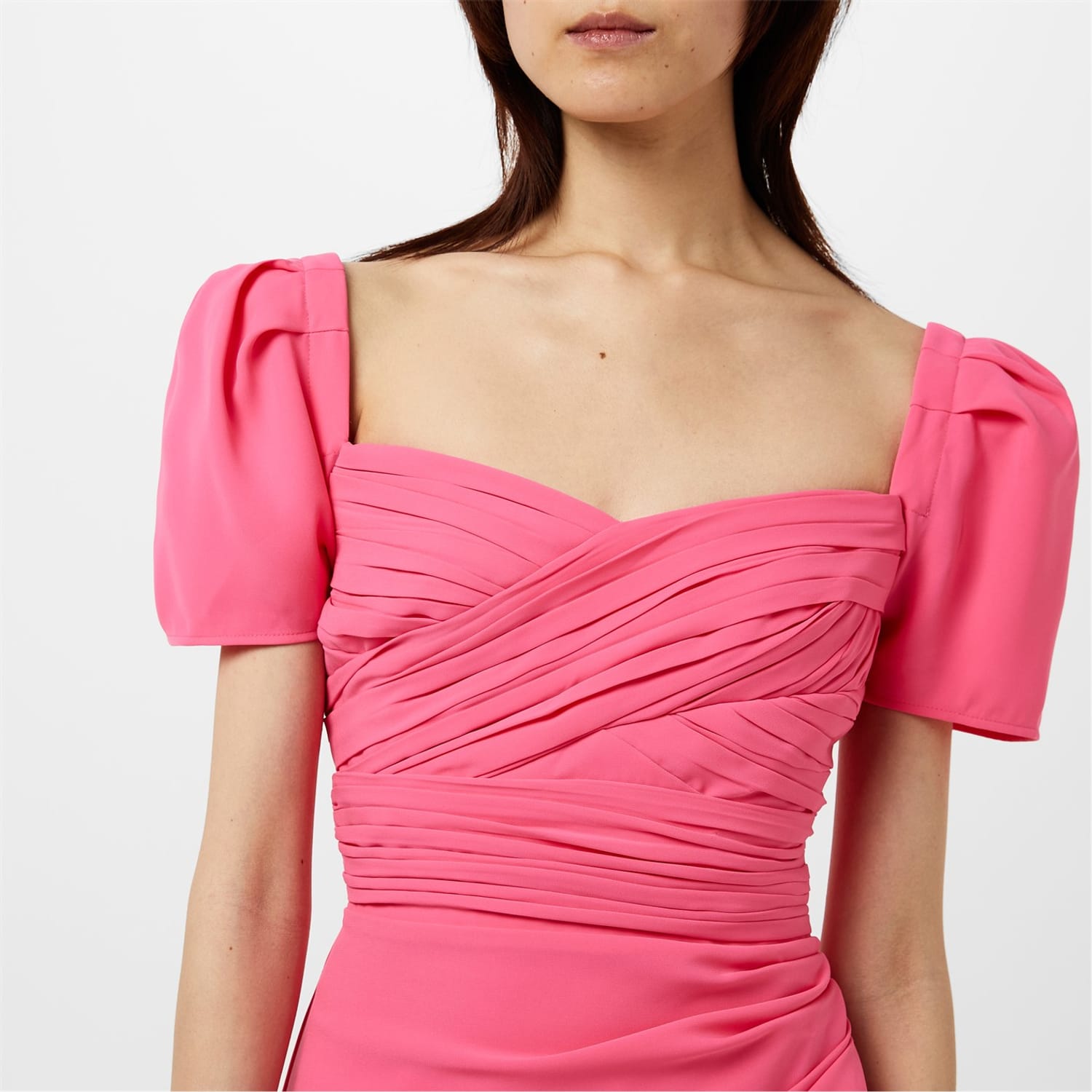 - Crafted from luxurious polyester crepe, this dress embraces the wearer in high comfort and refinement. The fully lined construction ensures a flawless fit, while the rear zip fastening allows for effortless dressing. The sweetheart neckline with a fitted bodice accentuates the feminine silhouette, while the short puff sleeves with slight pleat detailing add a whimsical touch. The gathered waist with a slit detail enhances the dress's allure, while the midi length exudes elegance and grace. Whether attending a glamorous gala or celebrating a special occasion like a wedding, the Ir -