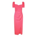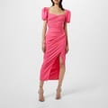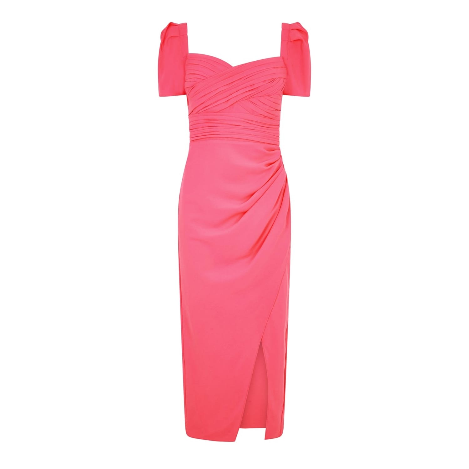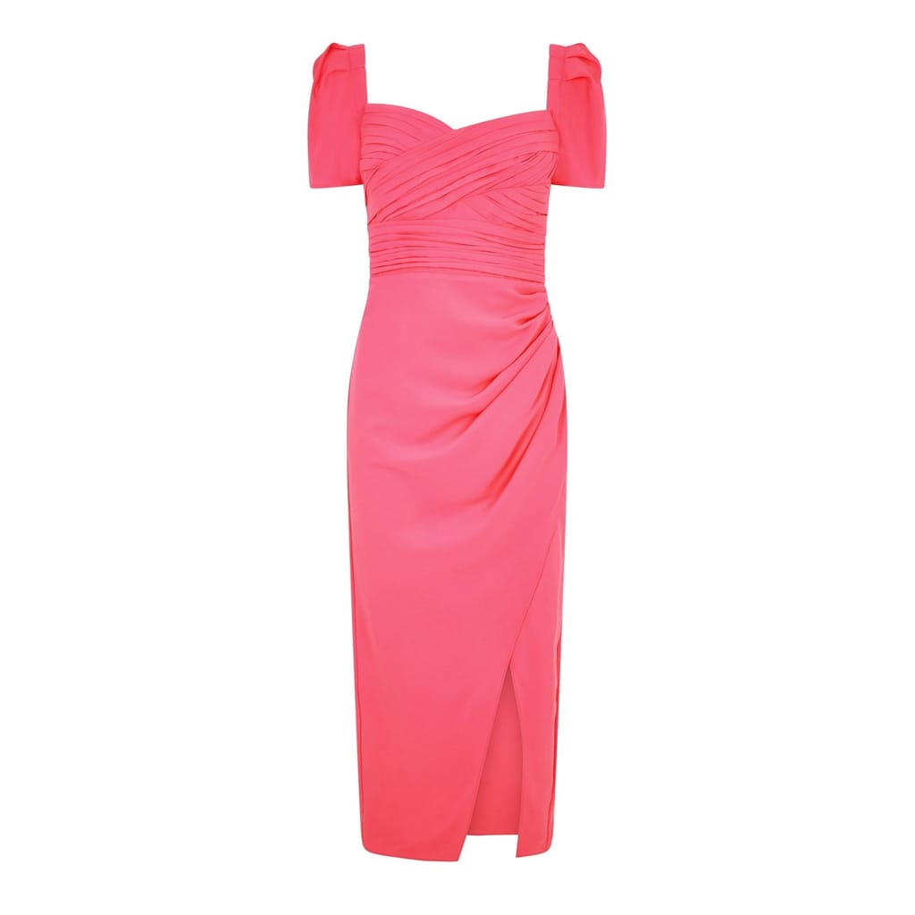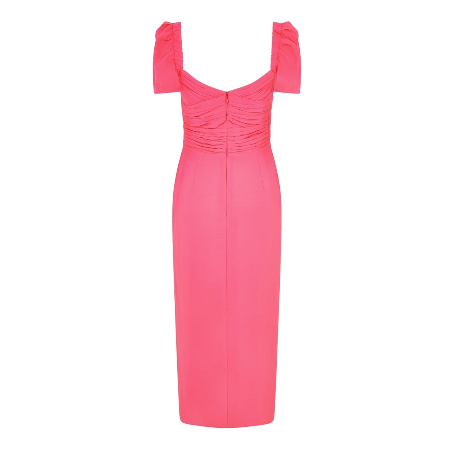 - Crafted from luxurious polyester crepe, this dress embraces the wearer in high comfort and refinement. The fully lined construction ensures a flawless fit, while the rear zip fastening allows for effortless dressing. The sweetheart neckline with a fitted bodice accentuates the feminine silhouette, while the short puff sleeves with slight pleat detailing add a whimsical touch. The gathered waist with a slit detail enhances the dress's allure, while the midi length exudes elegance and grace. Whether attending a glamorous gala or celebrating a special occasion like a wedding, the Ir -