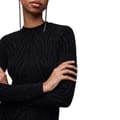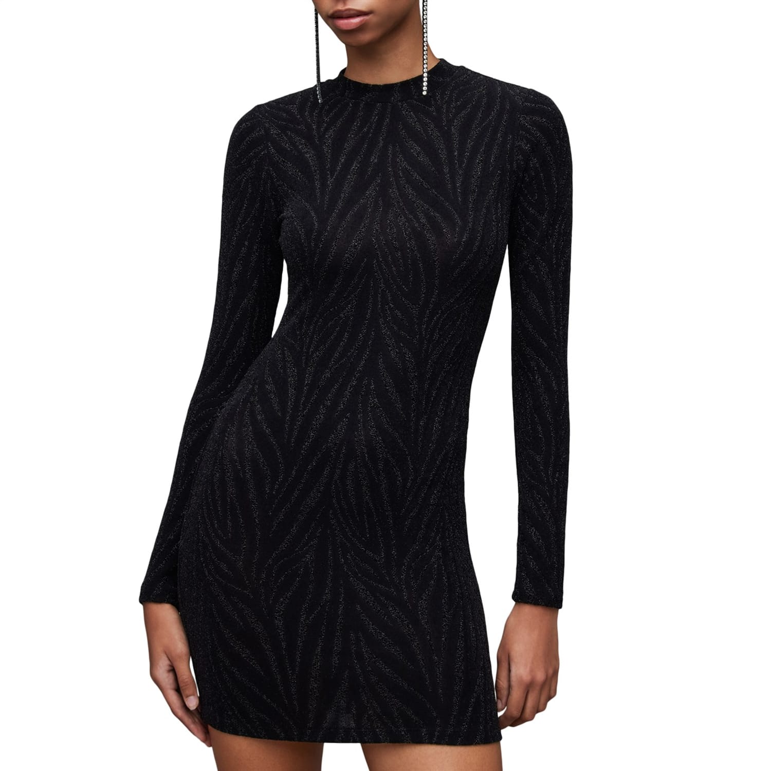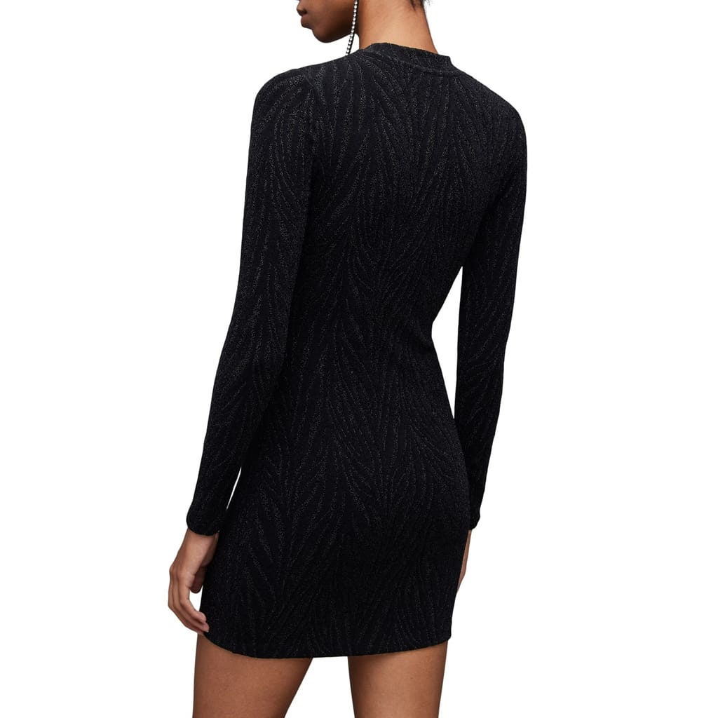 The AllSaints Amaya bodycon dress is a stylish mini-length piece featuring a high neckline and long sleeves. Designed with a slim fit, it boasts an eye-catching animal pattern that adds a bold touch to your wardrobe. -