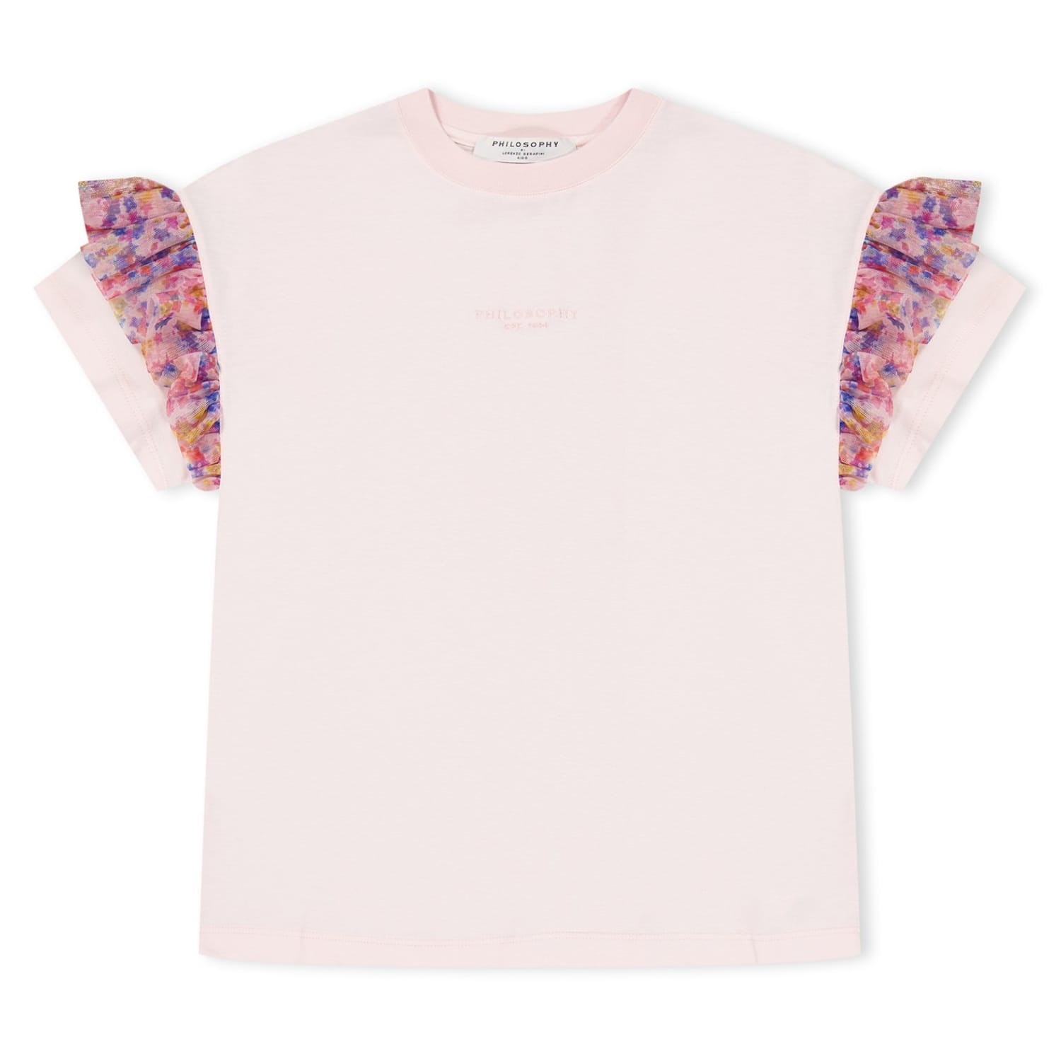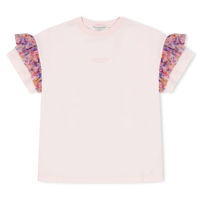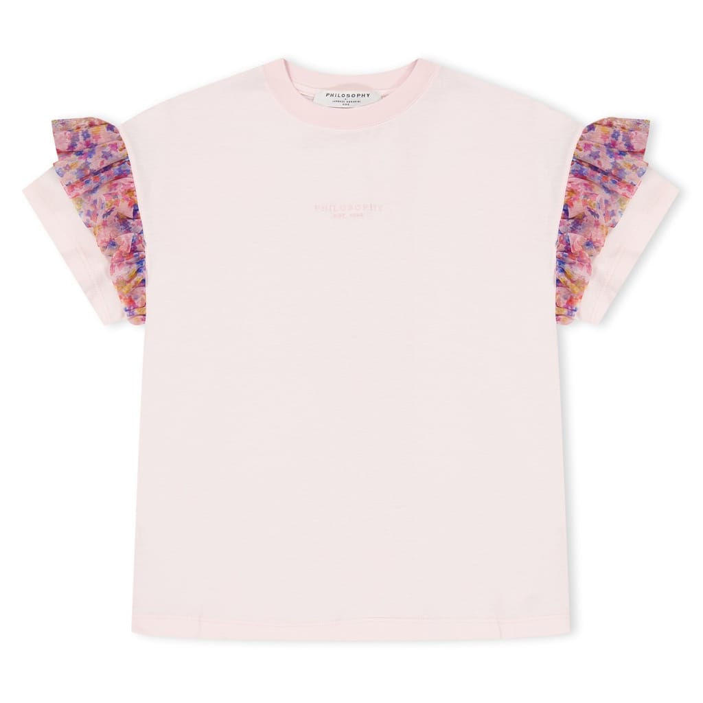 Discover the Philosophy di Lorenzo Serafini T-shirt, a casual top featuring a crew neck and short ruffle sleeves. This regular fit design offers a stylish touch with its ruffle embellishments, making it a versatile addition to your wardrobe. -