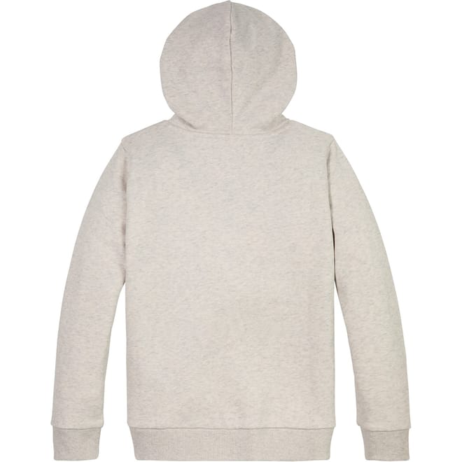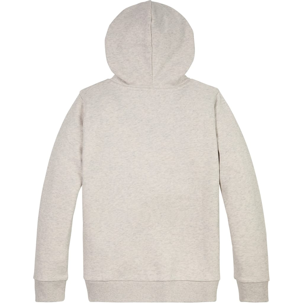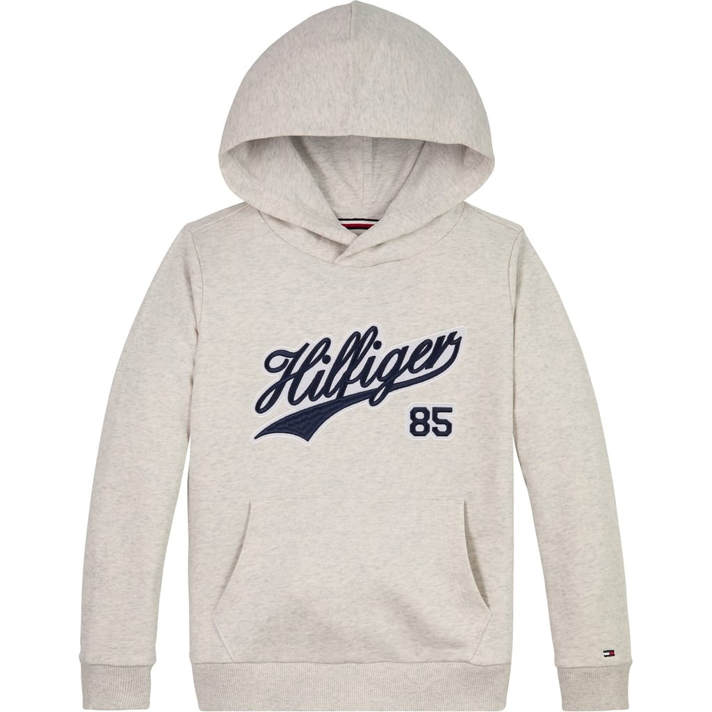 This Tommy Hilfiger sweatshirt features a solid pattern with a hood and long sleeves. It has a regular fit and is embellished with a distinctive graphic and logo. The hoodie style includes a hooded neckline and ribbed cuffs, adding to its casual appeal. -