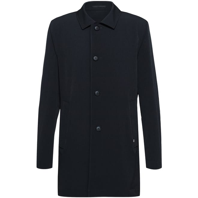 This Boss trench coat features a solid pattern for a timeless look. Designed with a collared neckline and regular fit, it offers both style and comfort. The coat has a button closure and includes a subtle logo embellishment, enhancing its sophisticated appeal. -