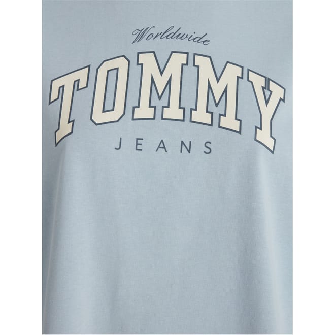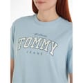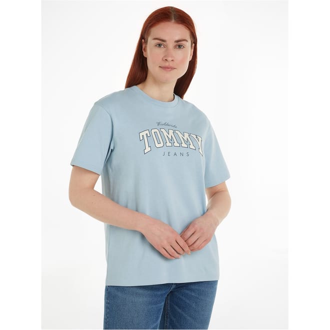 Elevate your casual wardrobe with this Tommy Jeans varsity t-shirt. Featuring a regular fit, this top offers a crew neck and short sleeves for a comfortable wear. The graphic print with lettering adds a stylish touch, highlighted by the iconic logo embellishment. Perfect for a laid-back look. -