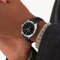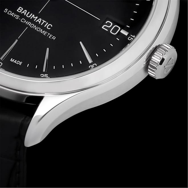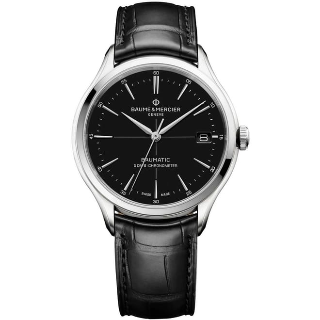 Baume & Mercier present the handsome Clifton Watch. This Swiss-made timepiece features an alligator strap and round polished steel case measuring 40 millimetres. The transparent sapphire glass ensures durability but also provides a glimpse at the hour and minute markers and the baton hands that are powered by the automatic self-winding movement. Practicality is assured with the date aperture at 3 o'clock.