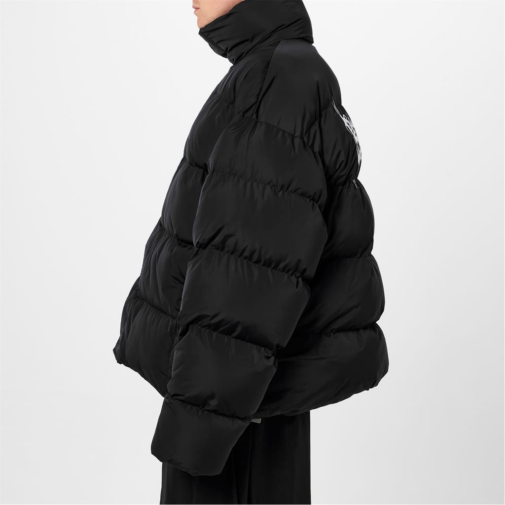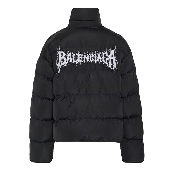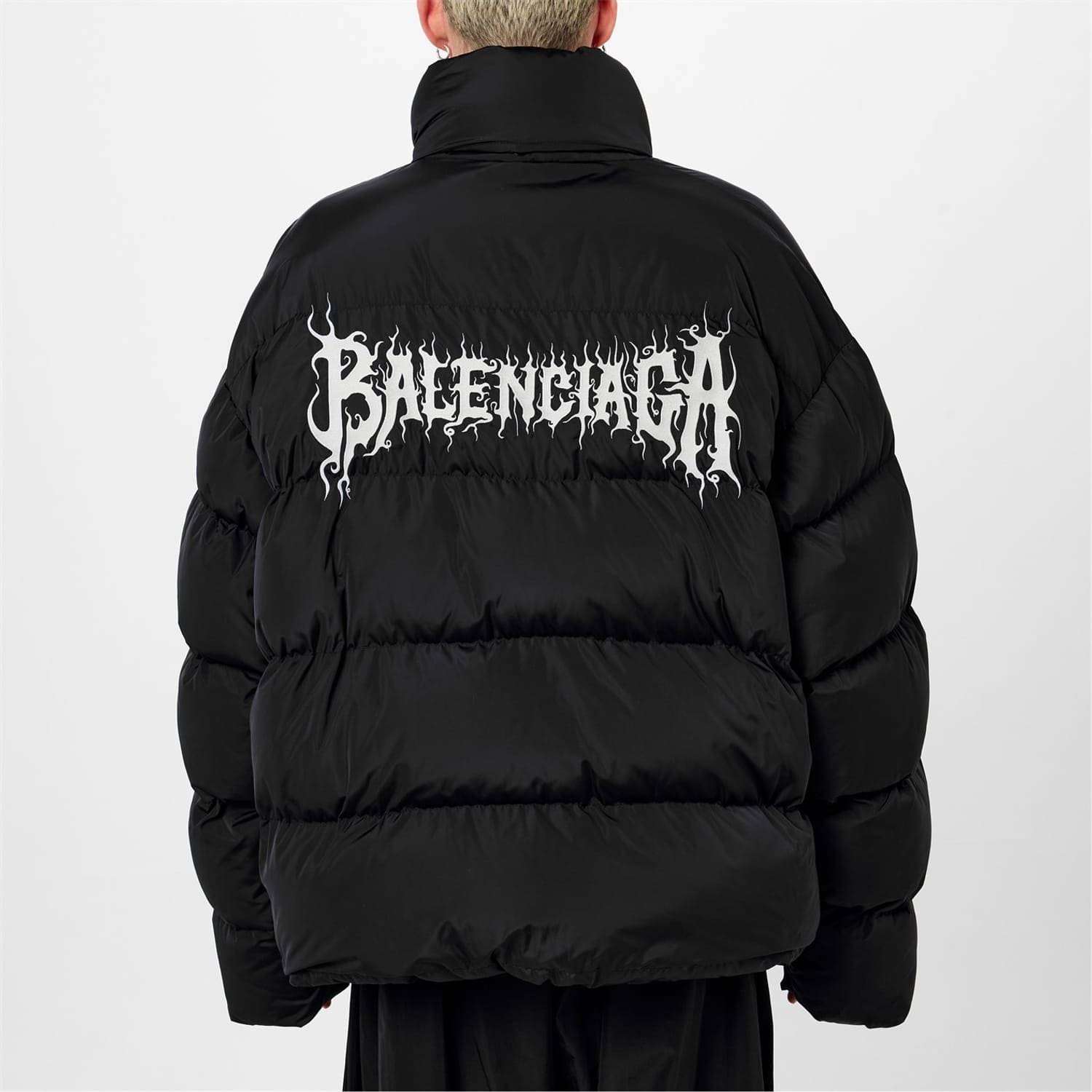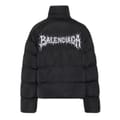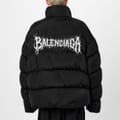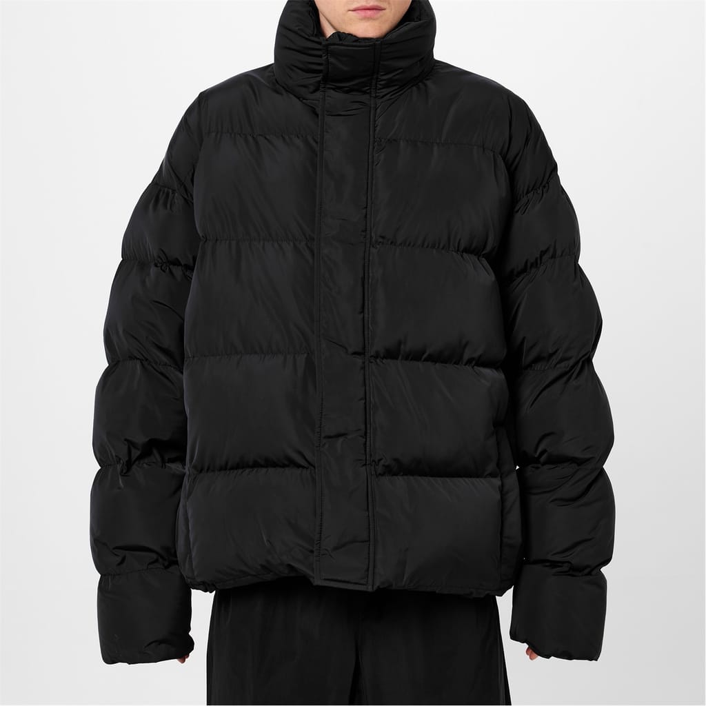 This Balenciaga puffer jacket features a high neck and an oversize fit, offering both style and comfort. The solid pattern and straight hem create a sleek look, while the zipper closure ensures practicality. Embellished with a logo, this short jacket is a standout piece for any wardrobe. -