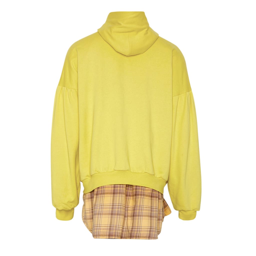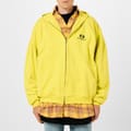 - Boasting a three-layered design, this oversized silhouette exudes a laid-back aesthetic, allowing you to effortlessly make a statement no matter the occasion. The top layer, crafted from a vintage jersey fabrication, takes the form of a hoodie, complete with a double-ended zip fastening, dropped shoulders, and a hood featuring a baseball cap visor. Complemented with elasticated trims to the cuffs and hem, the Unity sports icon artwork is embroidered at the chest alongside Balenciagas branding. The second layer, made from a checked flannel fabrication, adds an element of smart-casual to the look with its seven-button front placket and pointed collar. Made from a medium fleece to the base layer, the full zip fastening and -