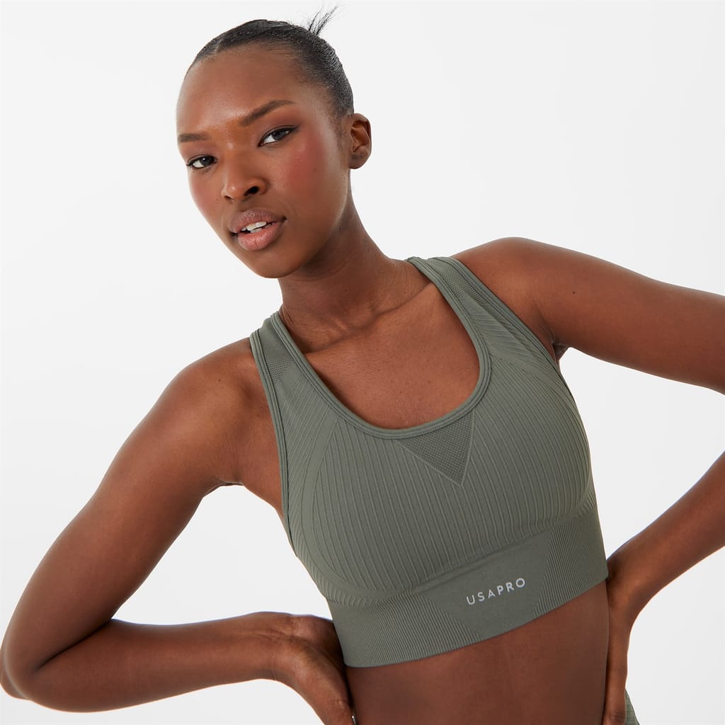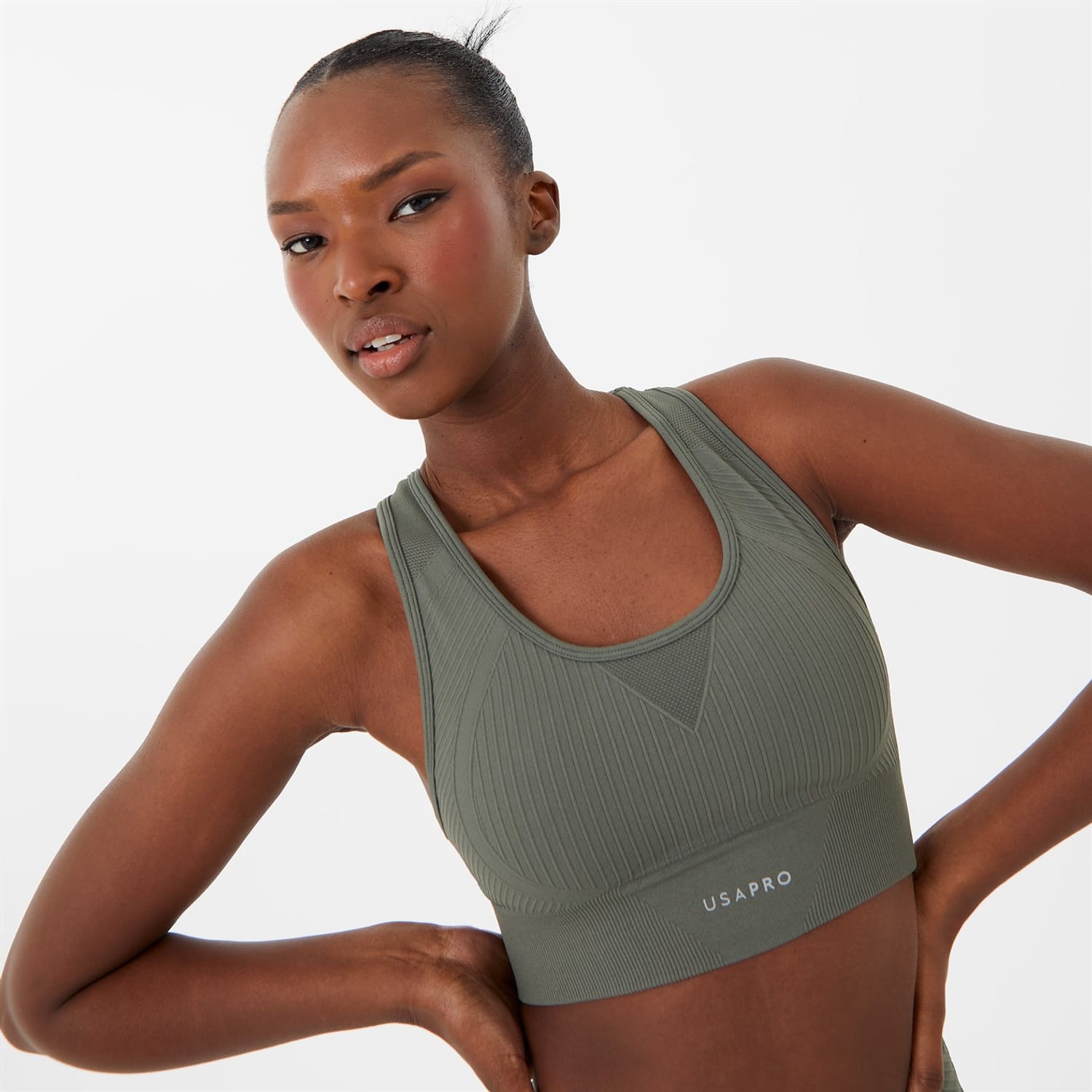 - Crafted from a blend of Nylon and Elastane for a stretchy fit, this cropped silhouette offers ultimate comfort during those intense workouts. With seamless technology to ensure an irritation-free experience no matter your yoga position, the removable cups provide customisable support and shape, catering to your individual needs. Designed with the Pro Dry technology, this bra effectively wicks away sweat, keeping you dry and comfortable during intense workouts. Cut in a racer-back silhouette for additional support, the scoop neckline provides freedom of movement while the USA Pro branding to the elasticated band showcases your dedication to performance and style.