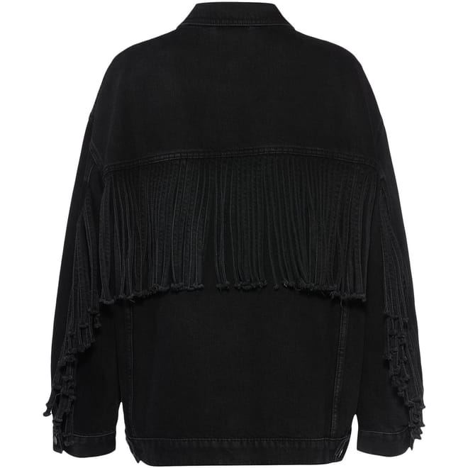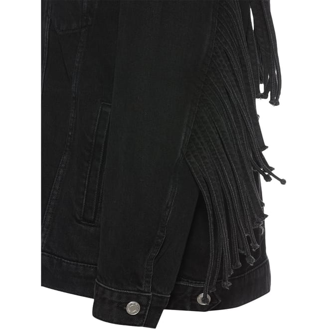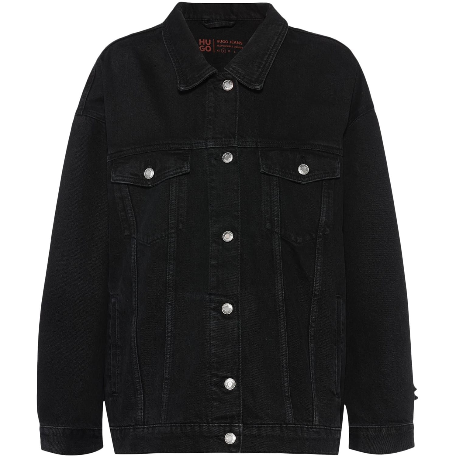 This Hugo trucker jacket from the outerwear collection features a collared neck and a button closure. It has a relaxed fit and a long length, offering comfort and style. The jacket is unlined with a solid pattern and a straight hem. Embellished with fringe and pockets, it’s a versatile addition to your wardrobe. -