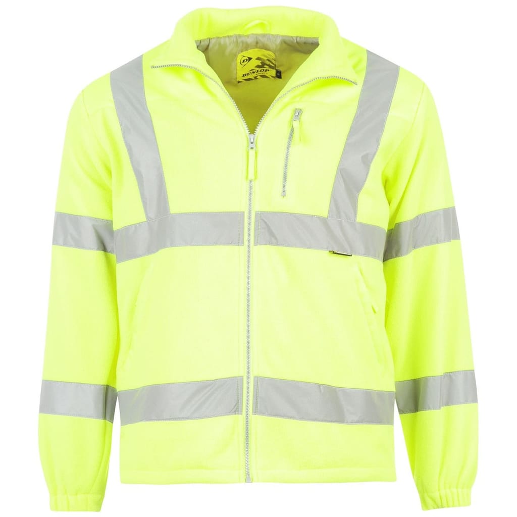 - This Dunlop Hi-Vis Jacket will ensure you stay warm thanks to the fleece design and lined inner with a pull toggle hem for a secure and comfortable fit. The mens hi-vis also features hi visibility strips throughout the jacket and is complete with a full length zip and 3 zipped pockets for your essential items.