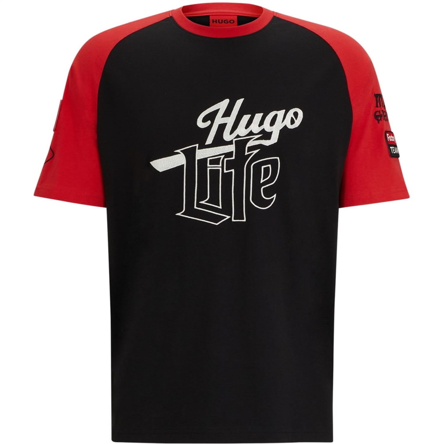 Elevate your casual wardrobe with this Hugo t-shirt. Featuring a crew neck and short sleeves, this regular fit top stands out with a stylish color block pattern and distinctive lettering graphic. The logo patch adds a touch of brand identity, making it a perfect addition to your collection. -