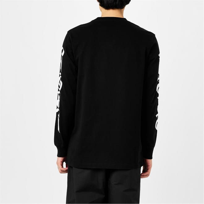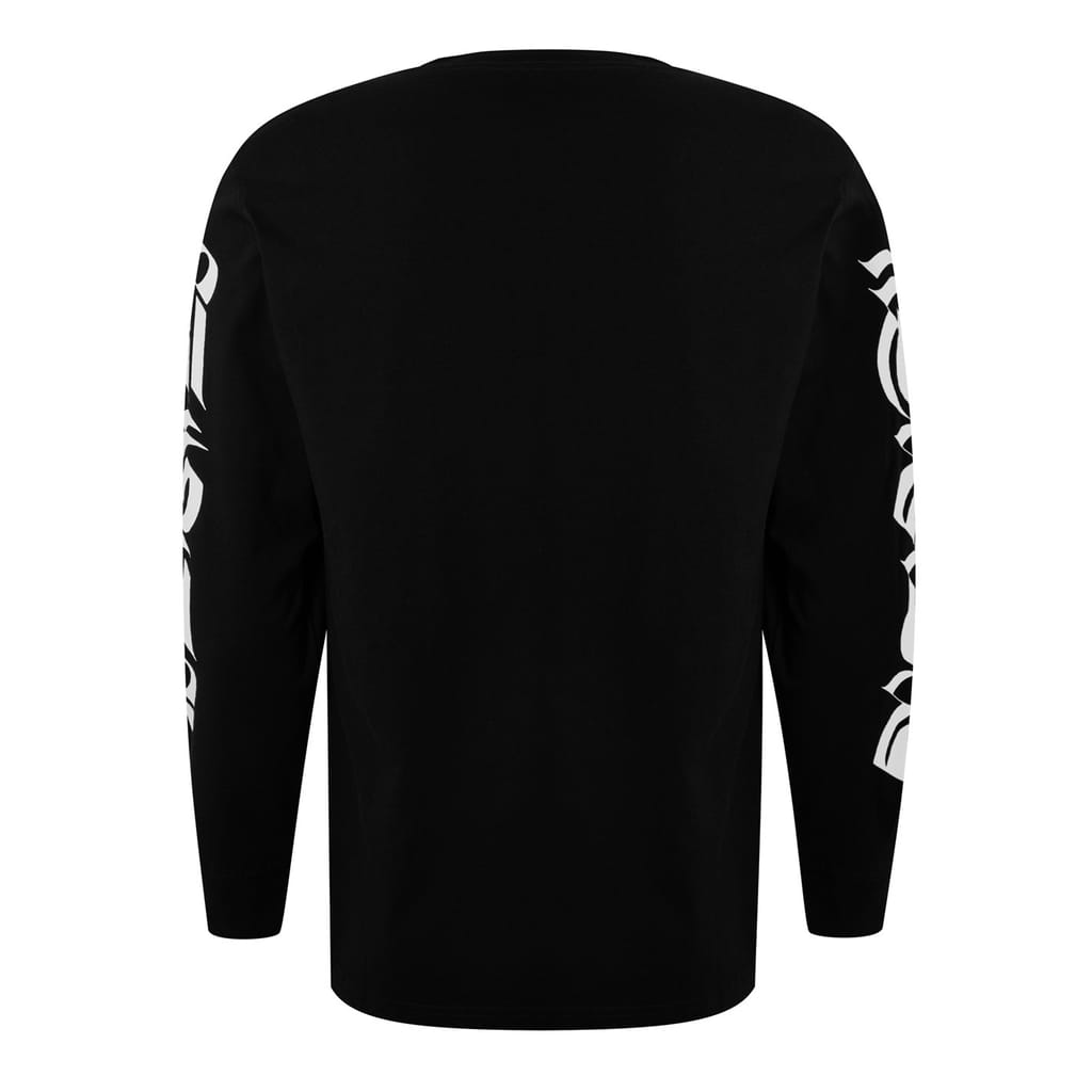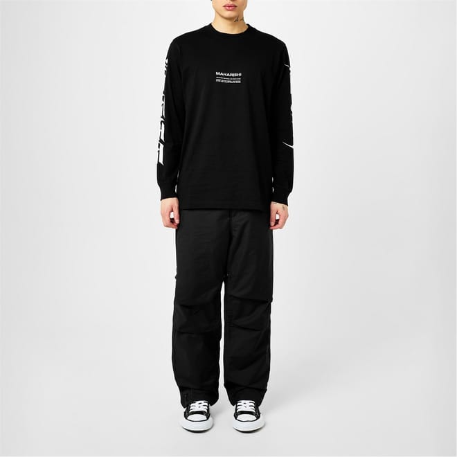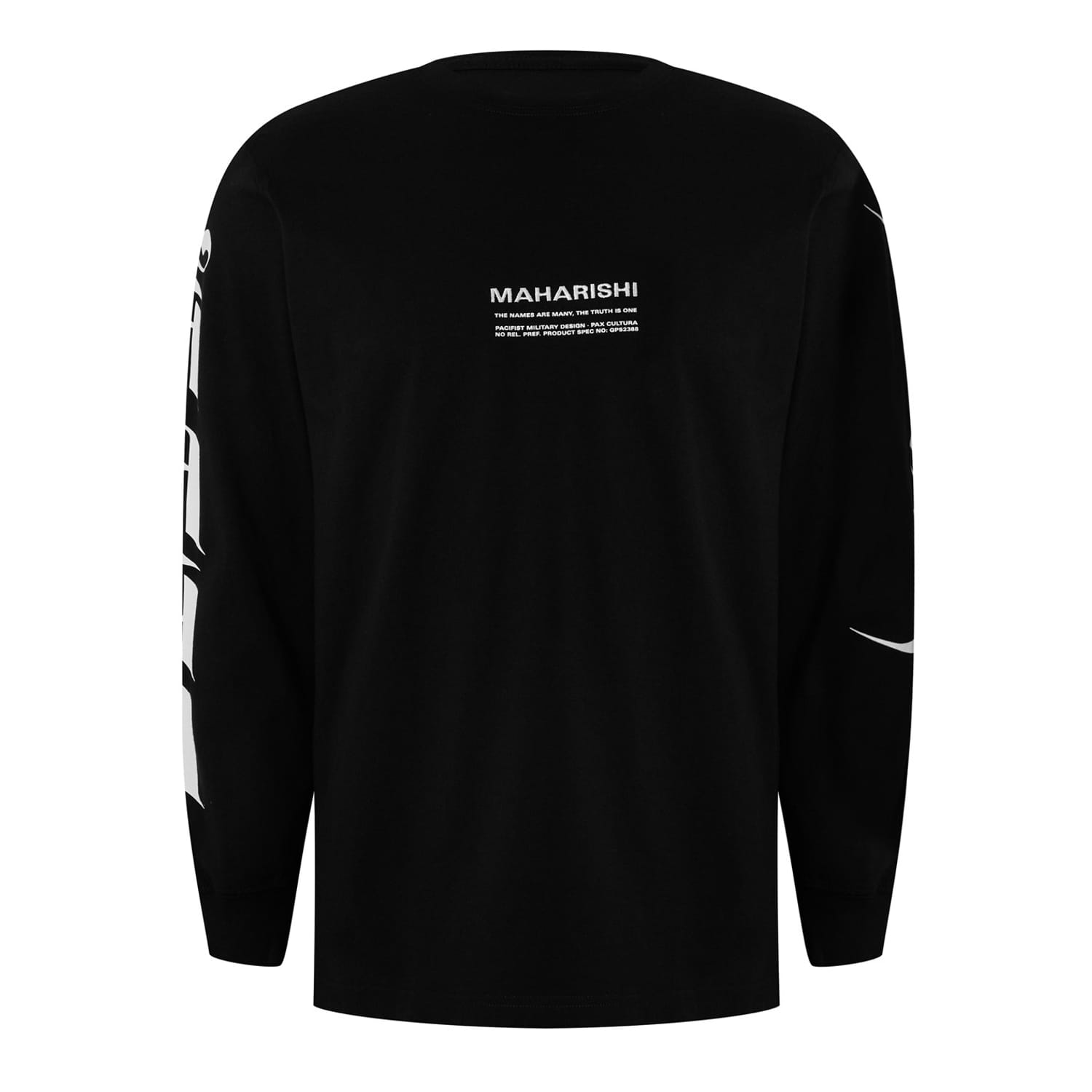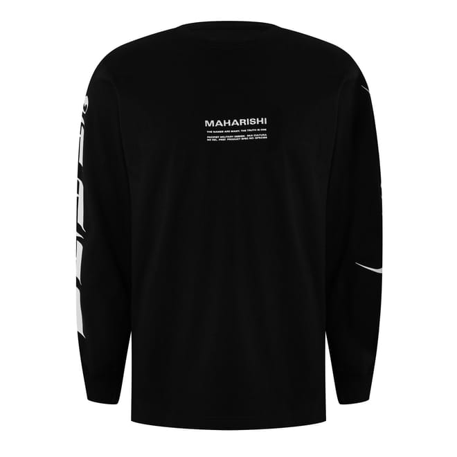 Black long sleeve graphic t-shirt with Sanskrit sleeve print and MILTYPE chest branding. Tibetan style calligraphy by guest artist Tashi Mannox in celebration of the lunar new year and Maharishi's 30th anniversary.