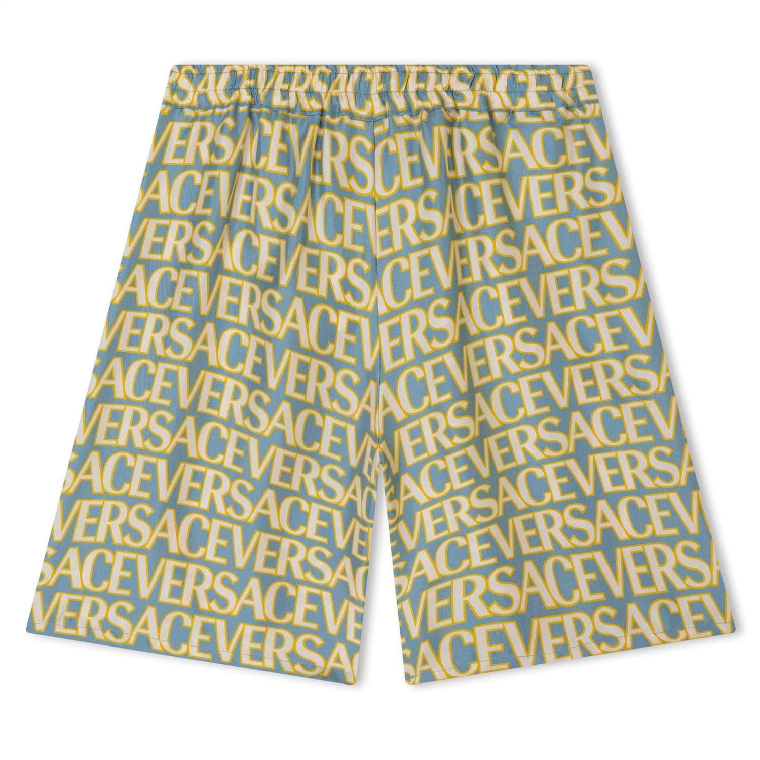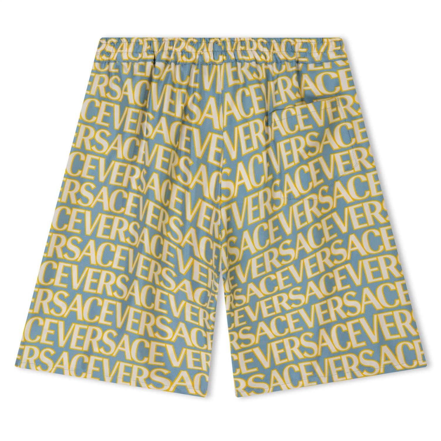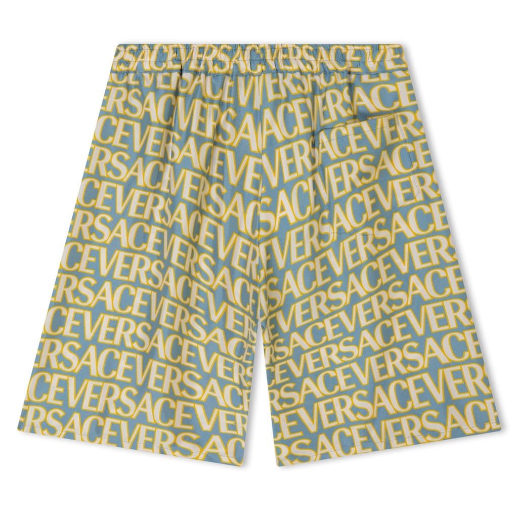 - Expertly crafted in Italy from sumptuous silk twill, these shorts embody the essence of Versace's unparalleled luxury. Featuring an elasticated waistband, they ensure the perfect fit for your little one, while accommodating change as they grow. Emblazoned with a bold all-over logo print, these shorts make a statement like no other, proudly showcasing Versace's luxury prestige with every wear. Complete with a back patch pocket, your child can carry small essentials effortlessly.