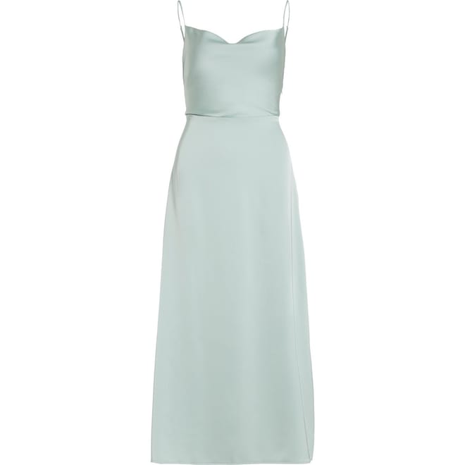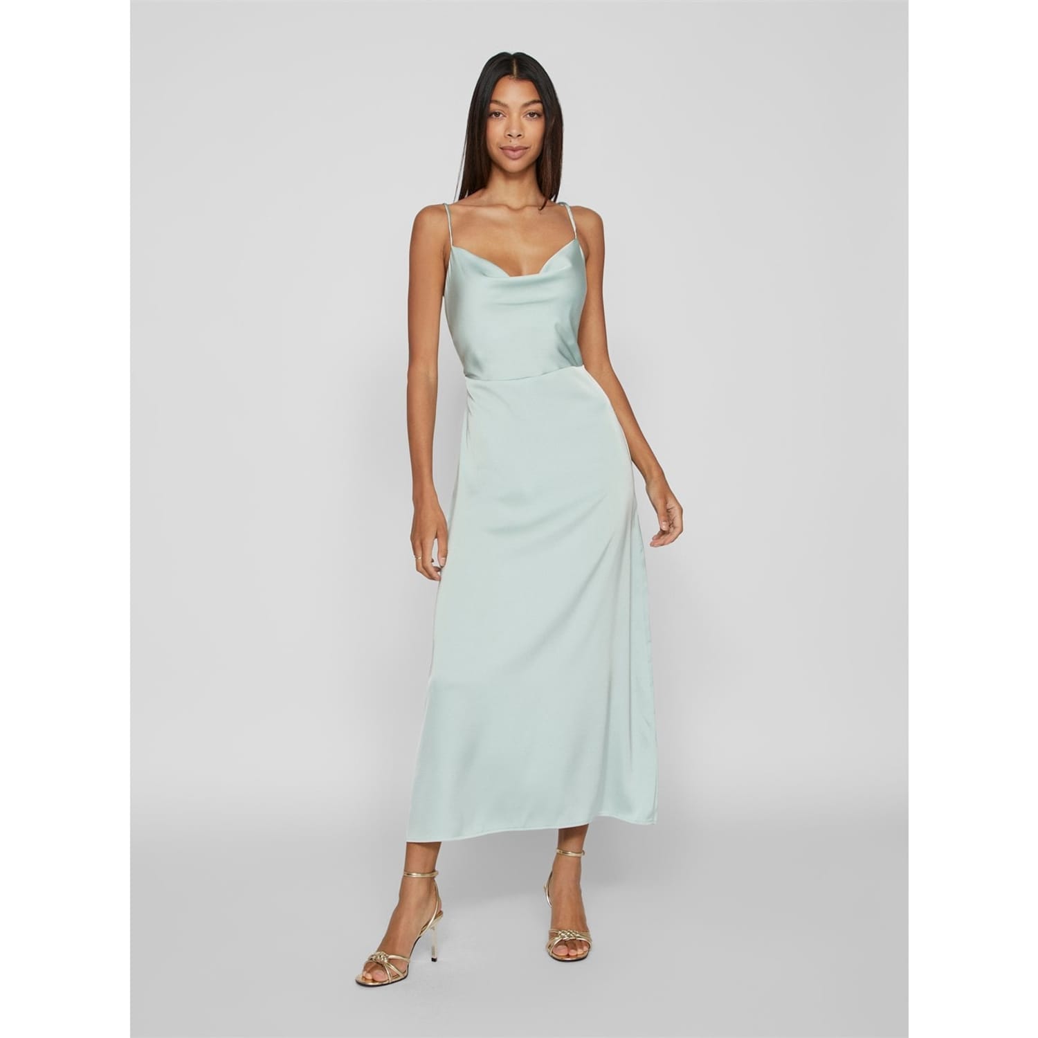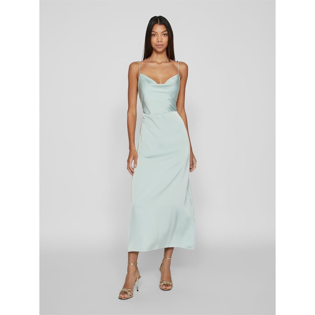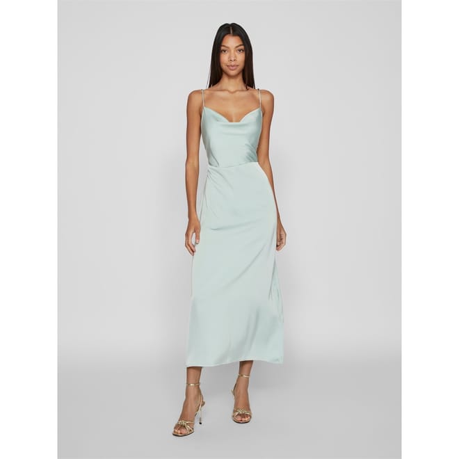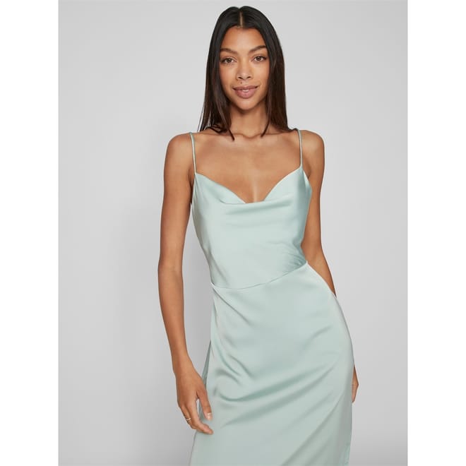 Add to your occasion wear with this dress from Vila. Designed with a cowl neckline leading to a sultry low back, this dress offers adjustable spaghetti straps to customise your look. Cut to a maxi length with a defined waist to flatter your figure, this dress is finished in a chic sheen satin to create the perfect party dress. -