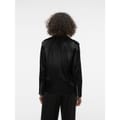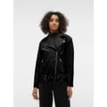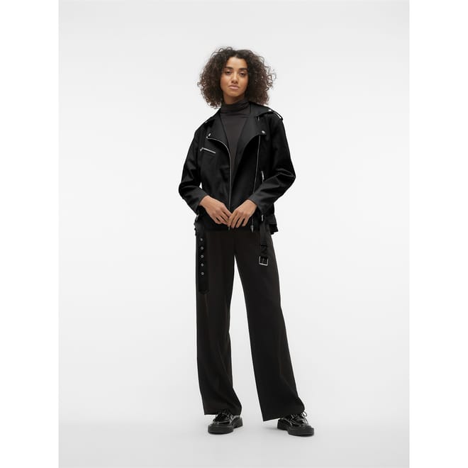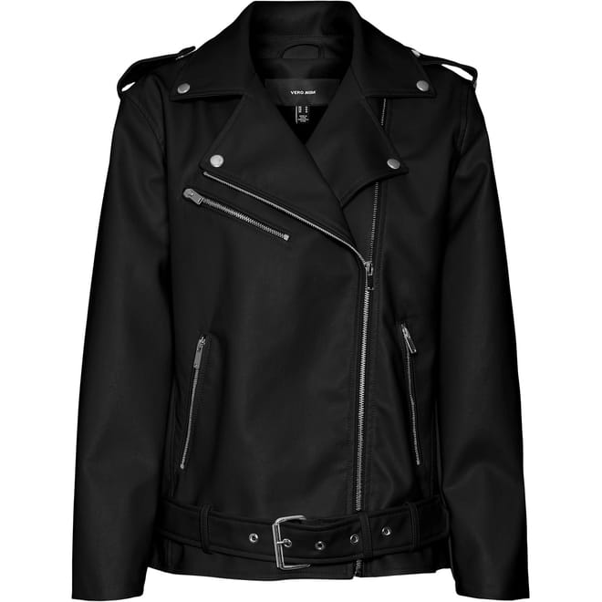 This Vero Moda moto jacket from the outerwear collection features a long, solid design with a collared neckline. It offers a relaxed fit and includes a zipper and snap button closure for added versatility. -