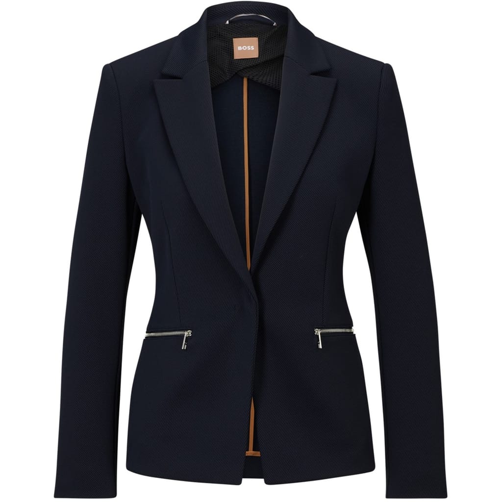 A single-breasted regular-fit jacket by BOSS Womenswear, crafted in stretch twill blended with cotton and featuring modern zipped pockets.