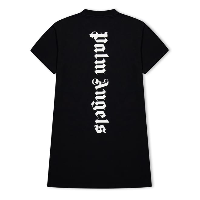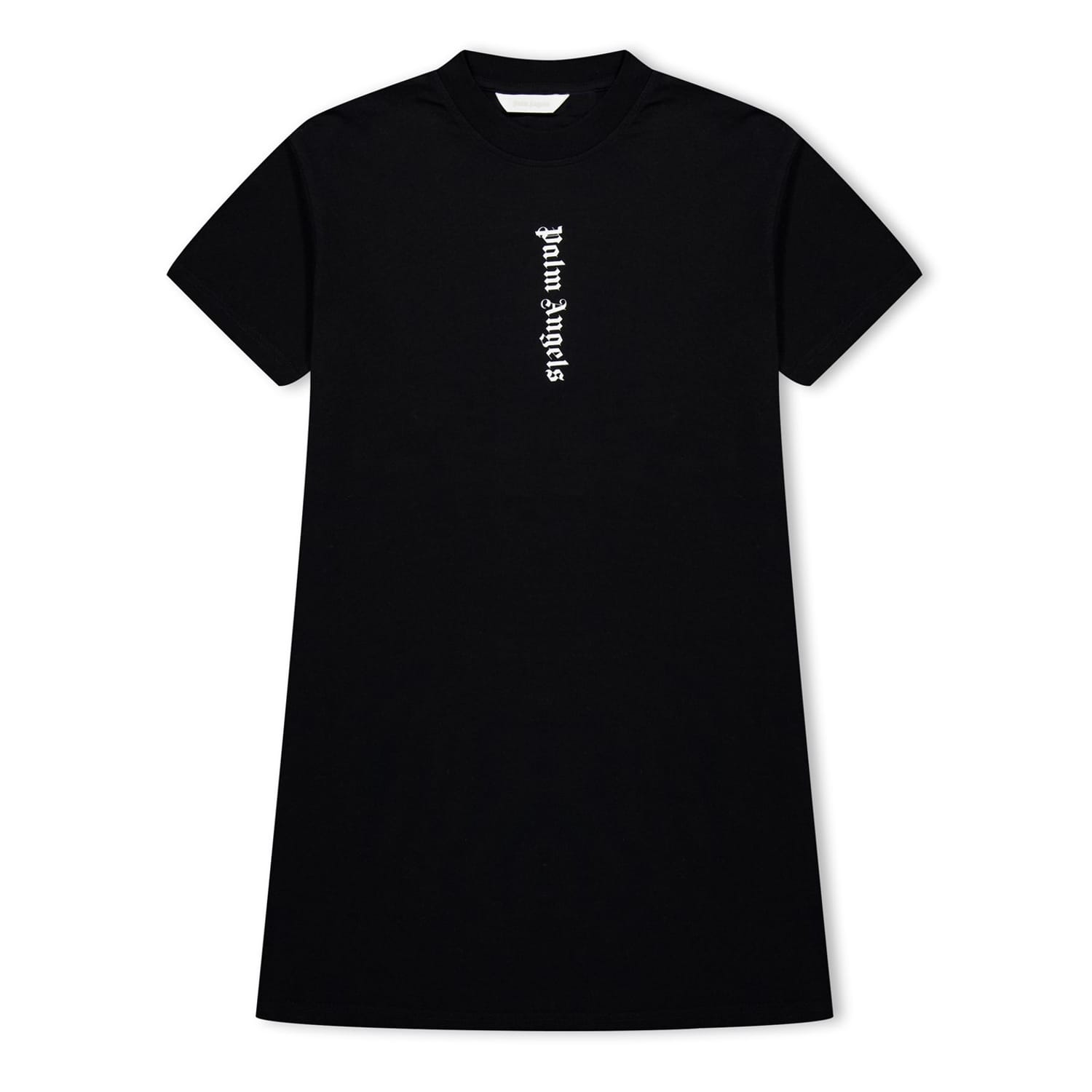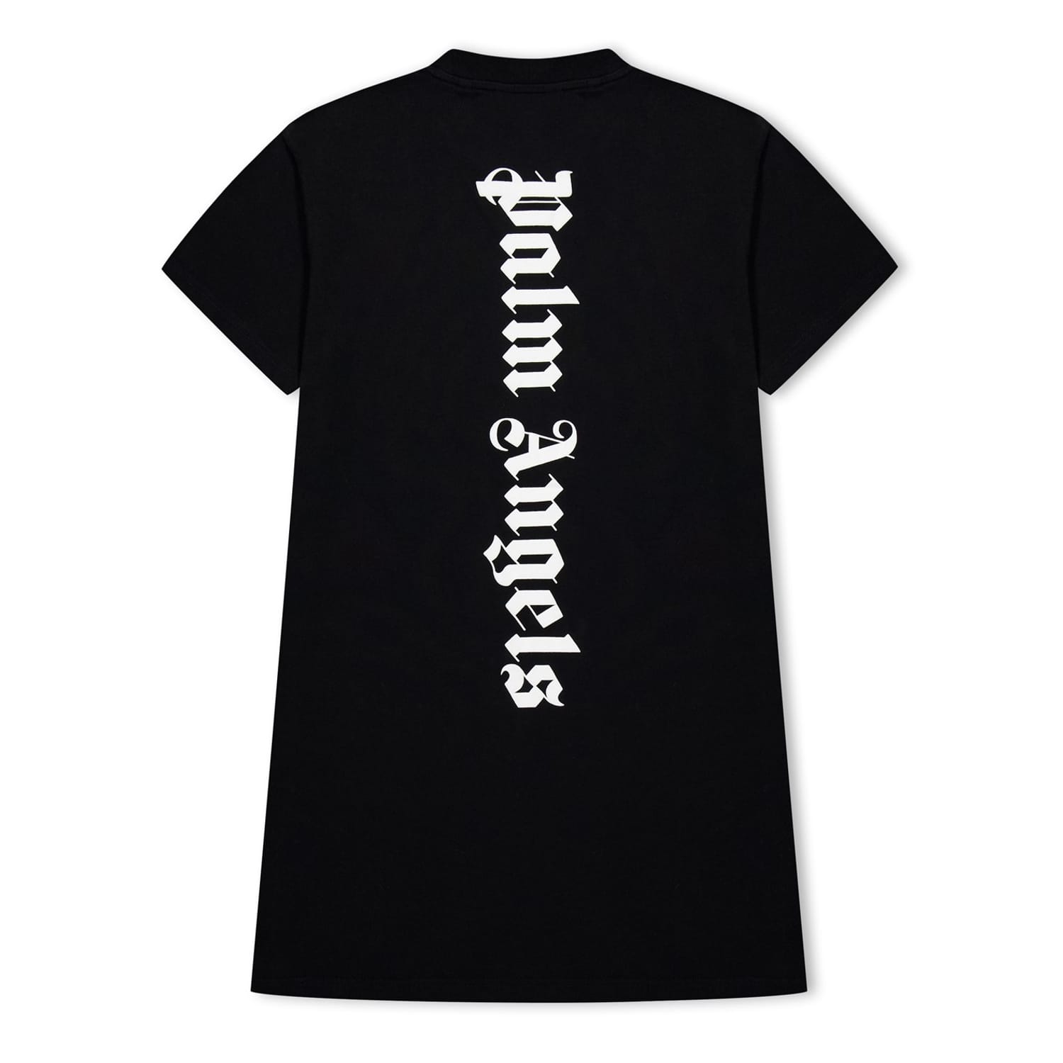 - Crafted from pure cotton, this t-shirt dress offers a comfortable and breathable feel, perfect for all-day wear. The small Palm Angels logo printed vertically on the front adds a touch of subtle branding, while the oversized logo on the backside creates a bold statement of designer exclusivity. Featuring short sleeves and a crew neckline, this below-the-knee length dress offers a timeless and casual aesthetic. The dropped shoulders create a relaxed and effortlessly cool silhouette, allowing your little one to move with ease.