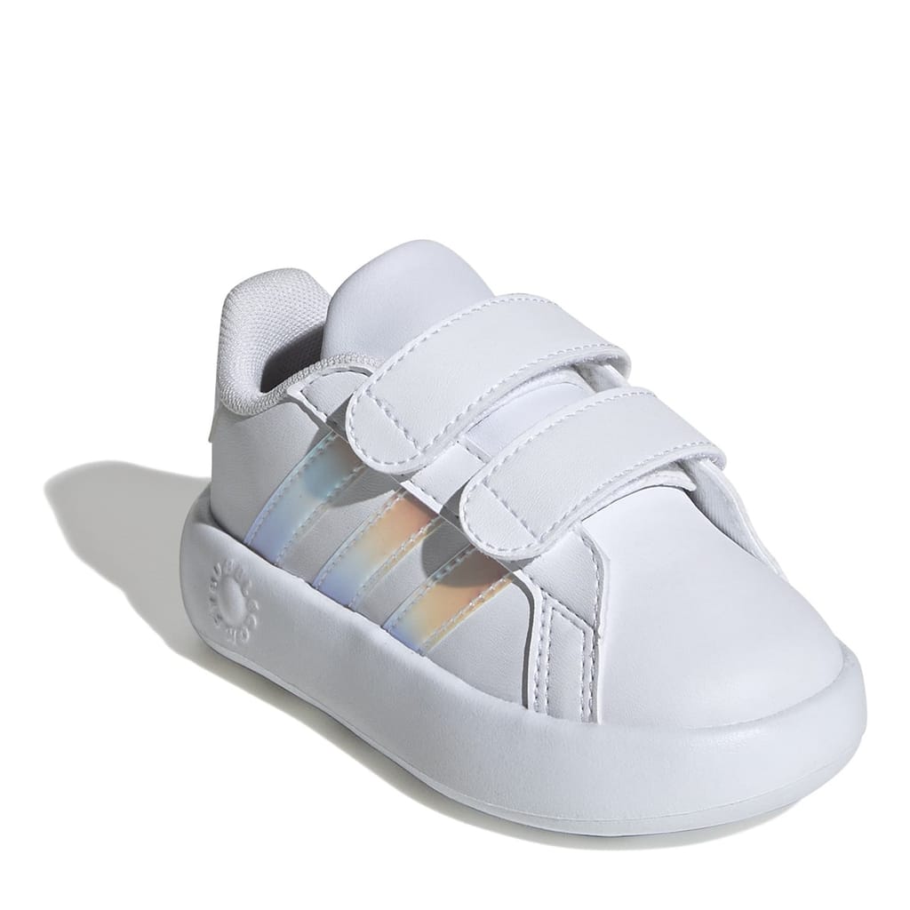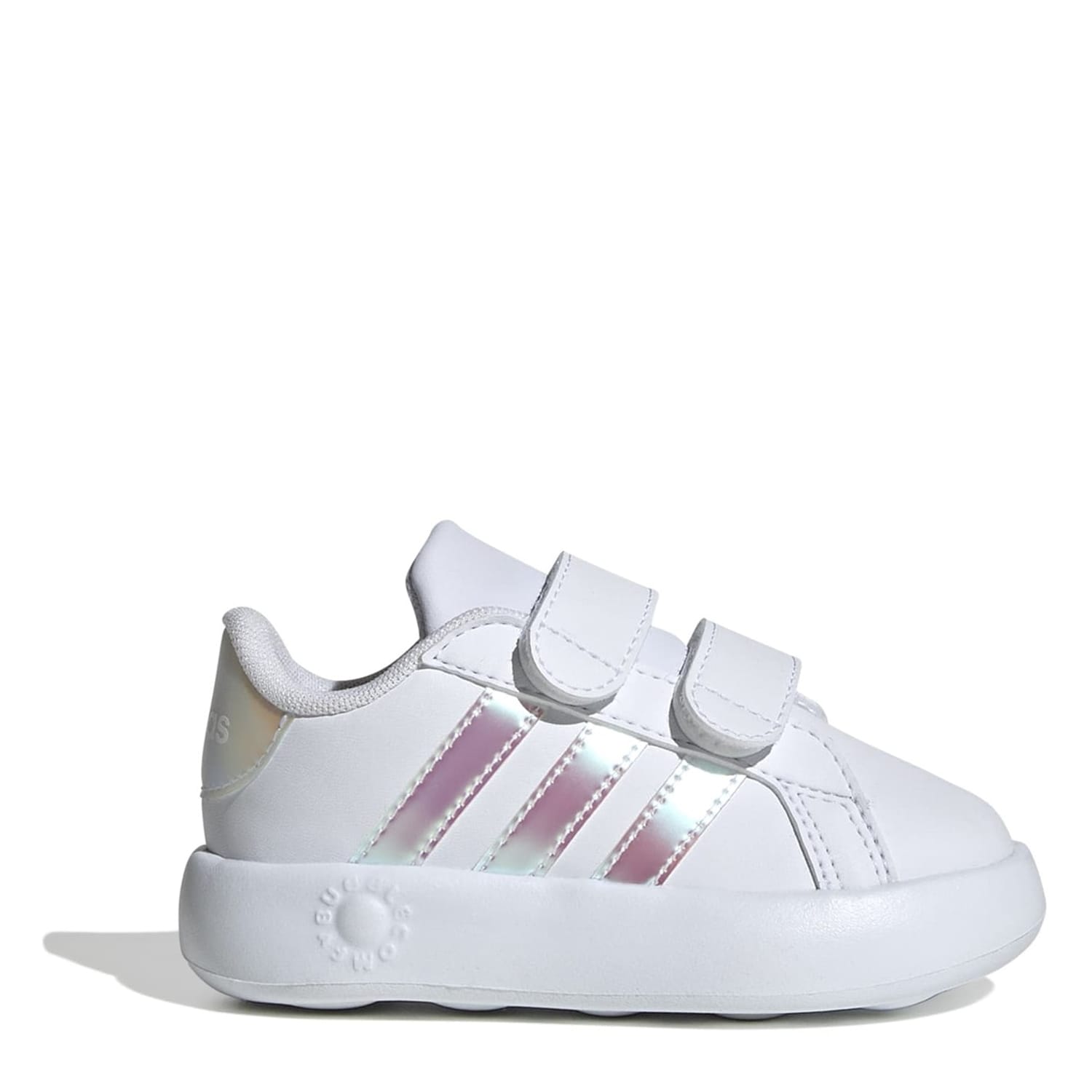 - Featuring convenient hook and loop straps, slipping these trainers on and off your little one is effortless, ensuring dressing time is as seamless as possible. Complete with iridescent iconic 3-stripes on the sides and a logo heel cap, adidas' athletic prestige will be proudly showcased with every wear.
