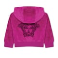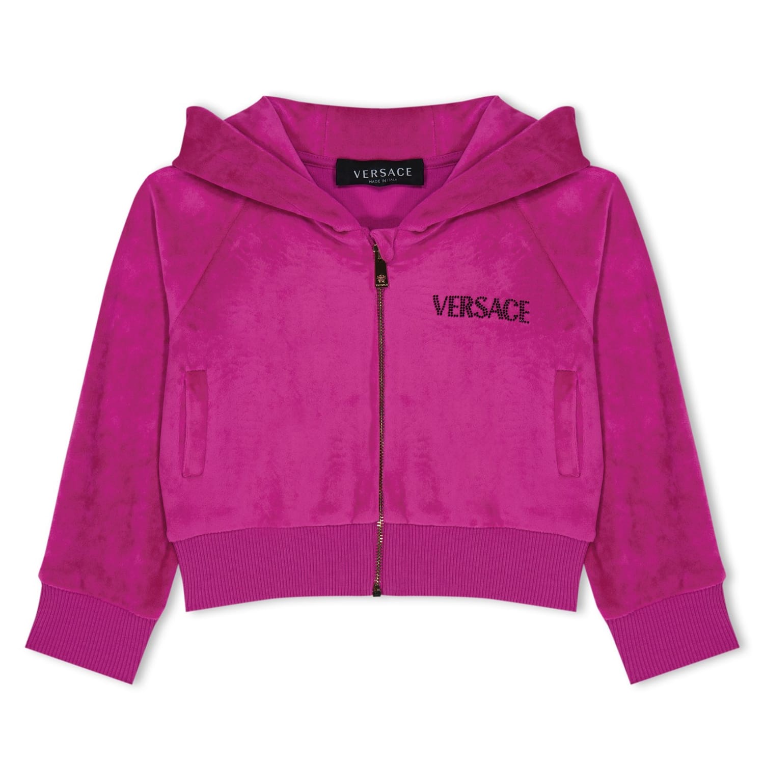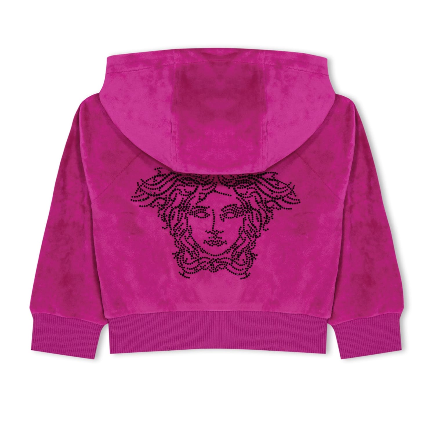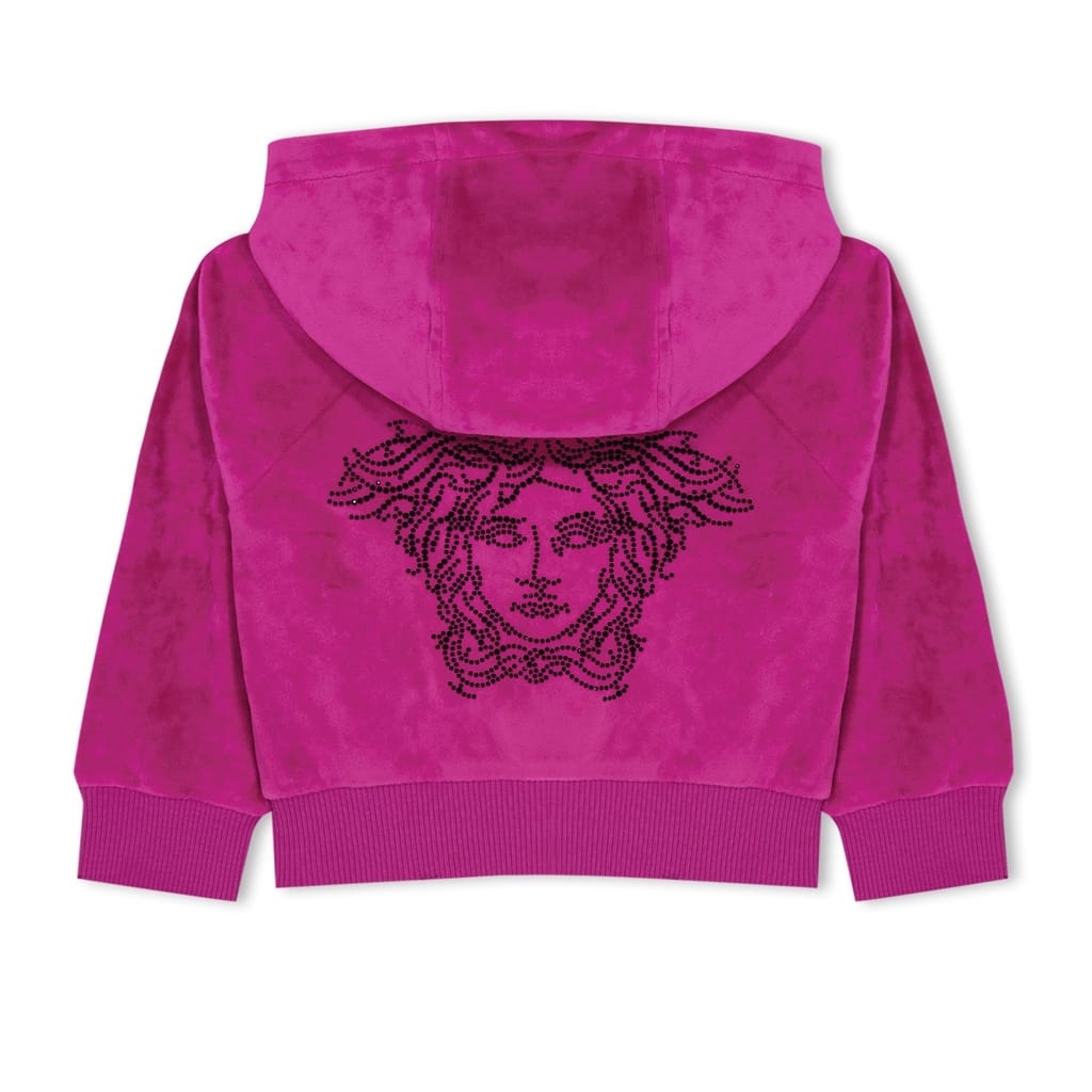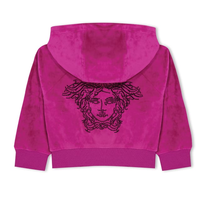 Synonymous with highly coveted designs and elegant ensembles Versace understands luxury, expertly presented in this embellished Velour Hoodie made for your little one. Intricately crafted from a super soft and stretchy polyester blend to create a comfortable feel whilst adding an eye-catching element to their ensemble. With its zip fastening, hooded neck, and long sleeves, it offers both comfort and style. Practicality meets luxury, as this hoodie features two side pockets for added convenience. Designed in a classic colourway this hoodie is elevated by Versace's iconic Medusa emblem, a symbol of opulence and allure. Inspired by the ancient ruins in founder Gianni Versace's home region of Calabria, the emblem is meticulously crafted in crystals, creating a shimmering embellishment that captivates the eye. Whether you're strolling through city streets or embracing a relaxed evening, this hoodie effortlessly combines versatility and sophistication.