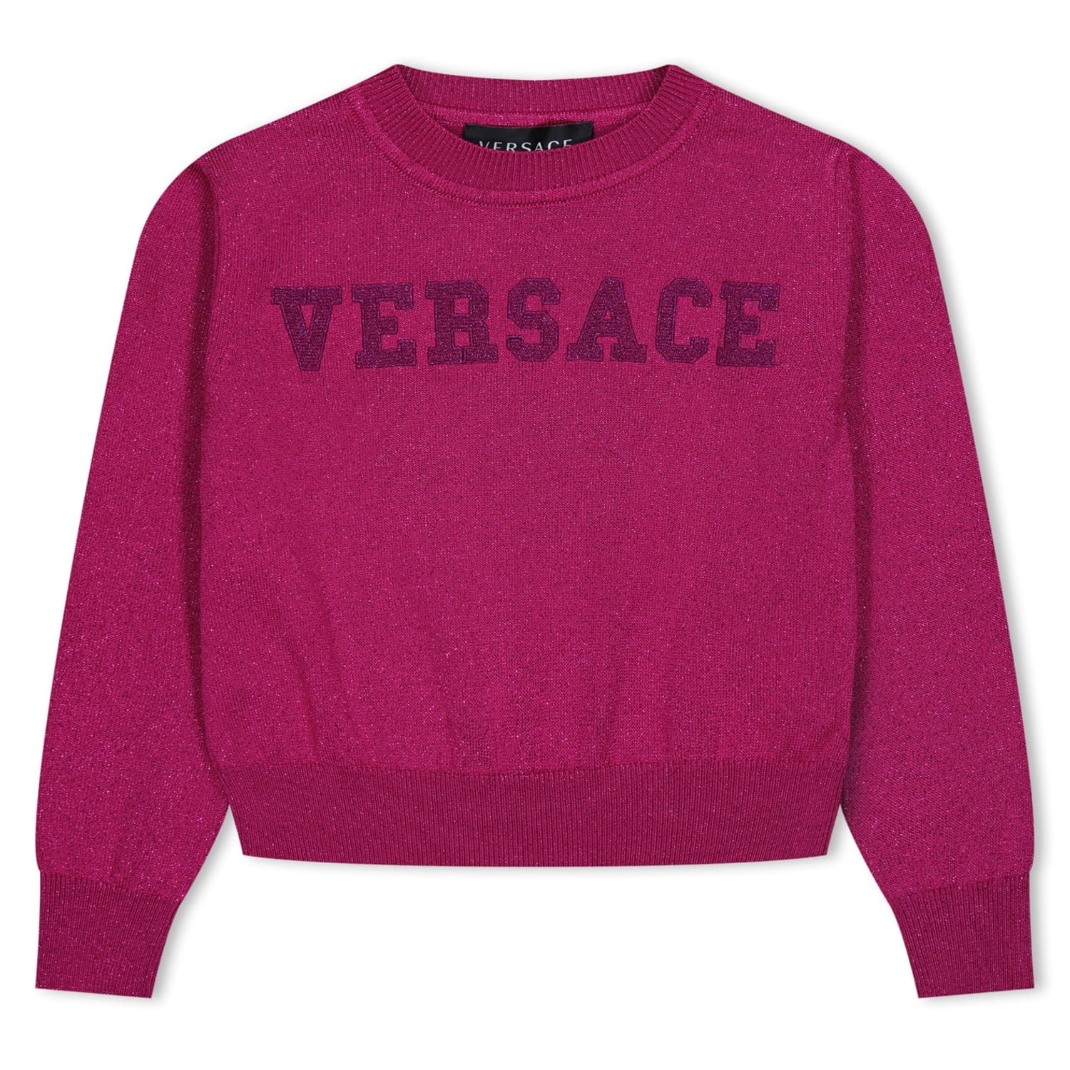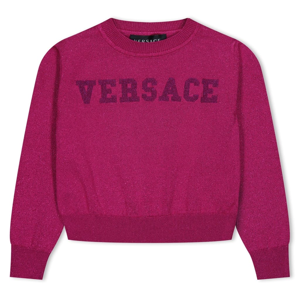 - Crafted from a sumptuous acetate blend, this jumper boasts a regular fit and a stylishly short length, ensuring both comfort and grace. The ribbed crew neck detail adds a touch of sophistication, while the long sleeves, complete with ribbed cuffs and trim, exude a sense of refined luxury. The metallic marl design creates a mesmerising visual appeal, perfect for catching admiring glances. Additionally, the front embroidered logo lettering showcases the brand's unmistakable identity, elevating the charm of this jumper to new heights. Ideal for a myriad of occasions, from family gatherings to everyday wear, this versatile piece embodies both practicality and fashion-forwardness. Versace's Logo Knit Jumper for girls is truly a testament to the brand -