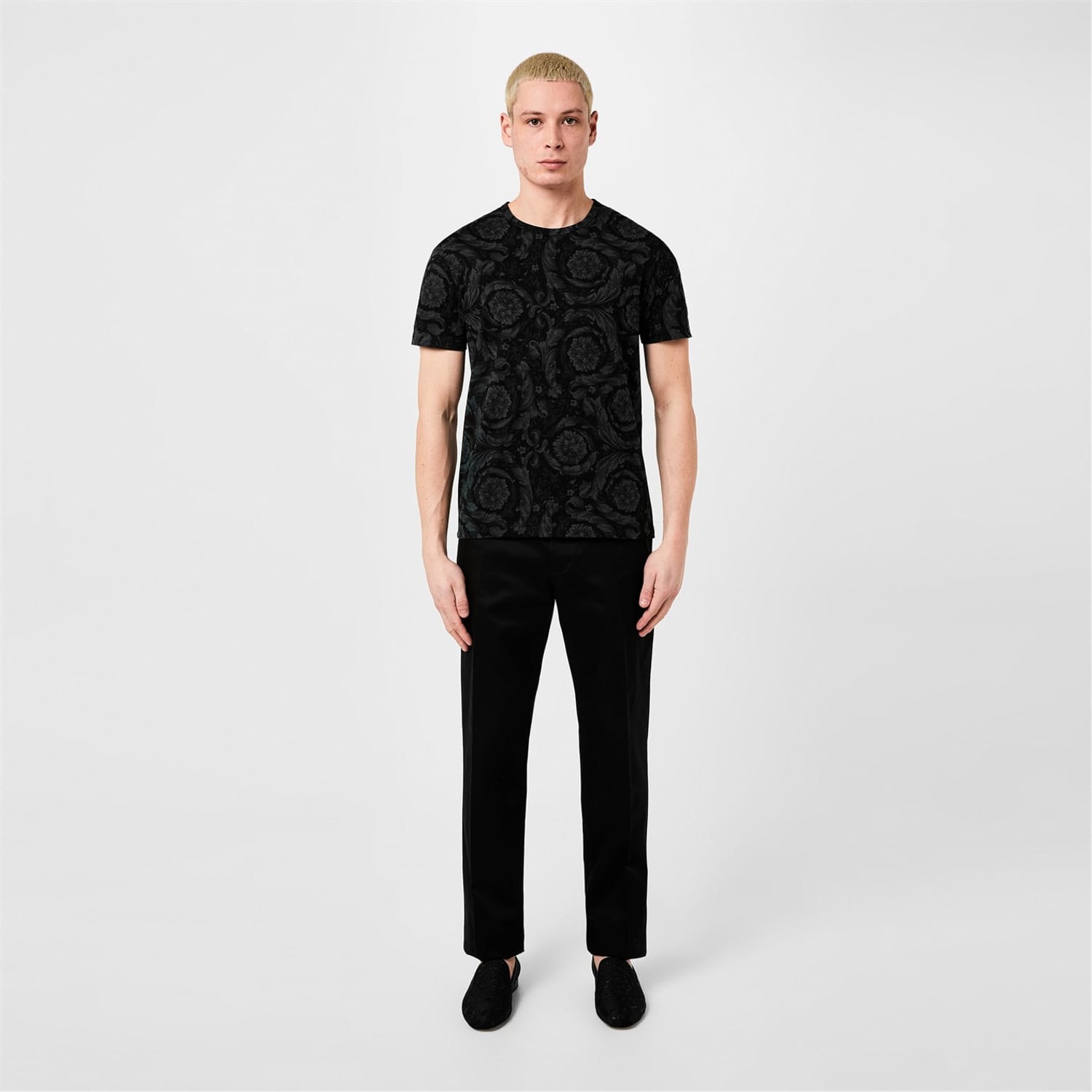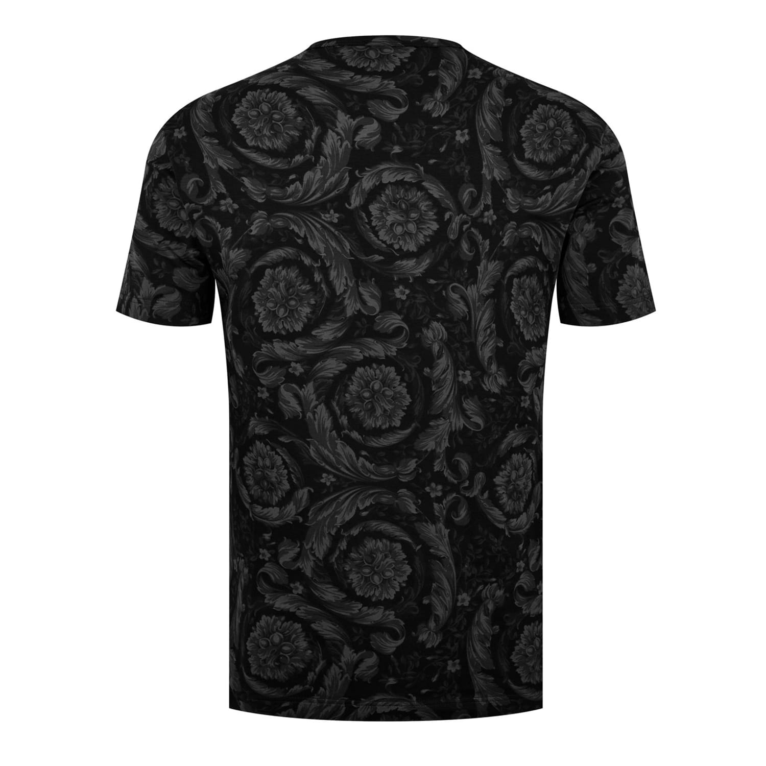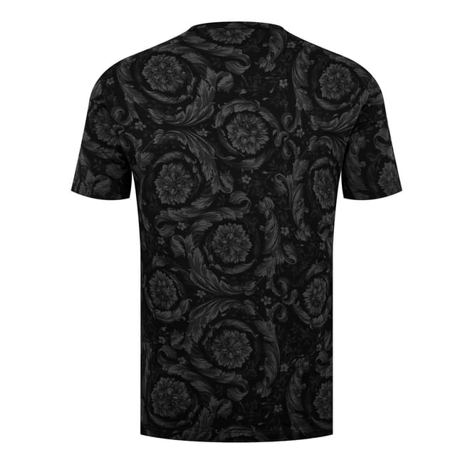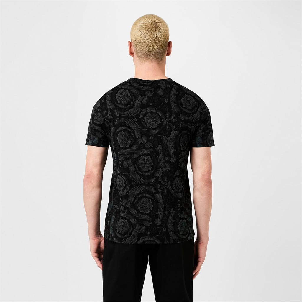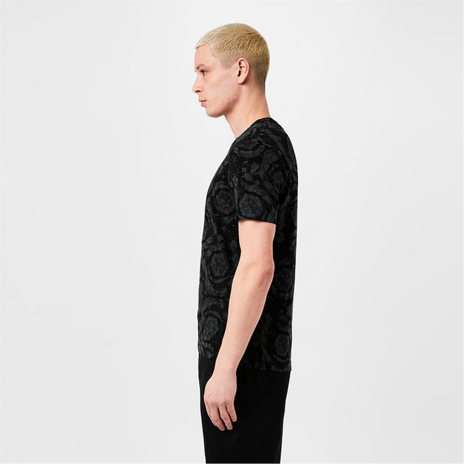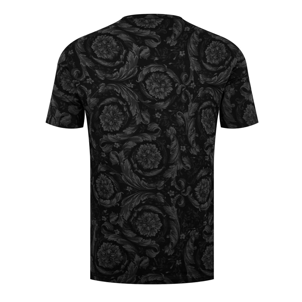 - Crafted with meticulous attention to detail, this t-shirt boasts a luxurious blend of cotton that creates high comfort. Its jersey knit construction ensures a supple drape that gracefully accentuates the wearer's silhouette. With a regular fit and a straight hem, this impeccable piece offers a flawless and streamlined appearance. The classic crew neck and short sleeves enhance its versatility, allowing it to become a layering piece with a leather jacket or on its own in the summer months. Extraordinary beauty with the all-over baroque print design, a signature of Versace's iconic aesthetic, intricate and mesmerising, this bold pattern imbues the t-shirt with an air of the highest grandeur. Delighting the senses and trans -
