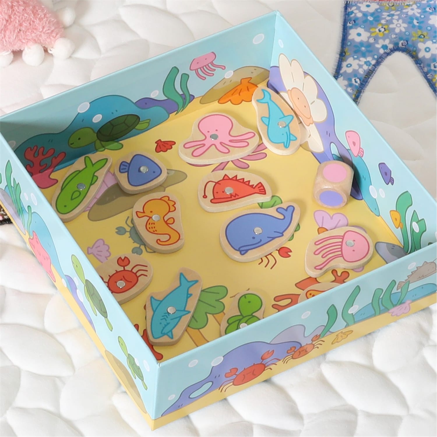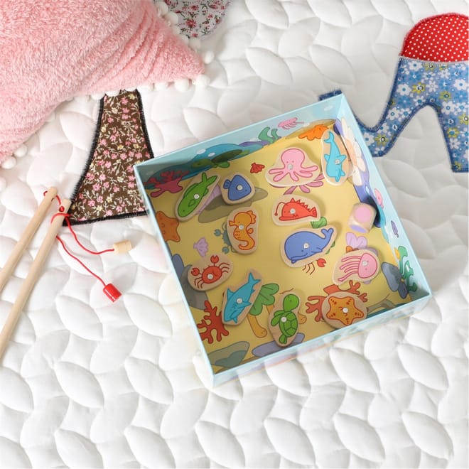 Watch as children use the magnetic fishing rods to catch the wooden fish, developing hand-eye coordination and fine motor skills in the process.
