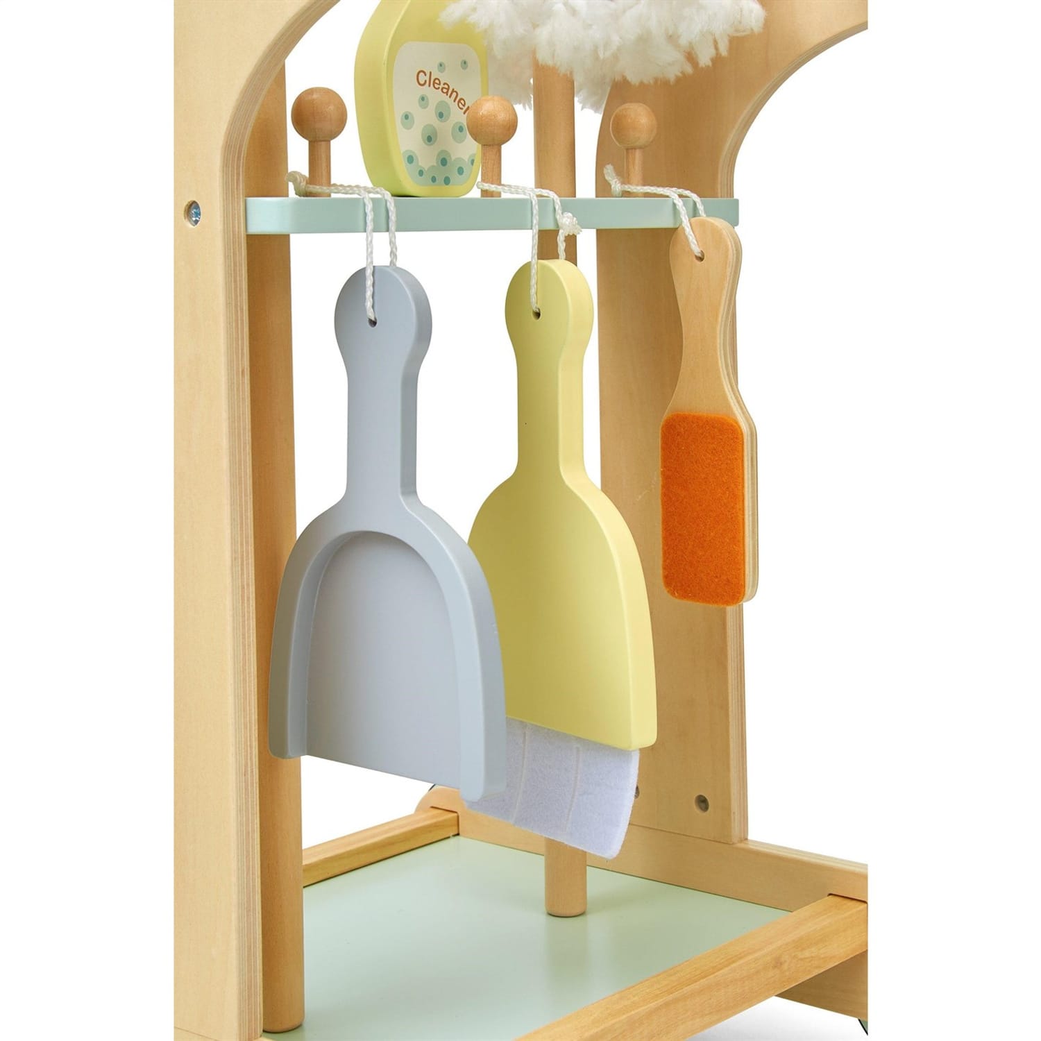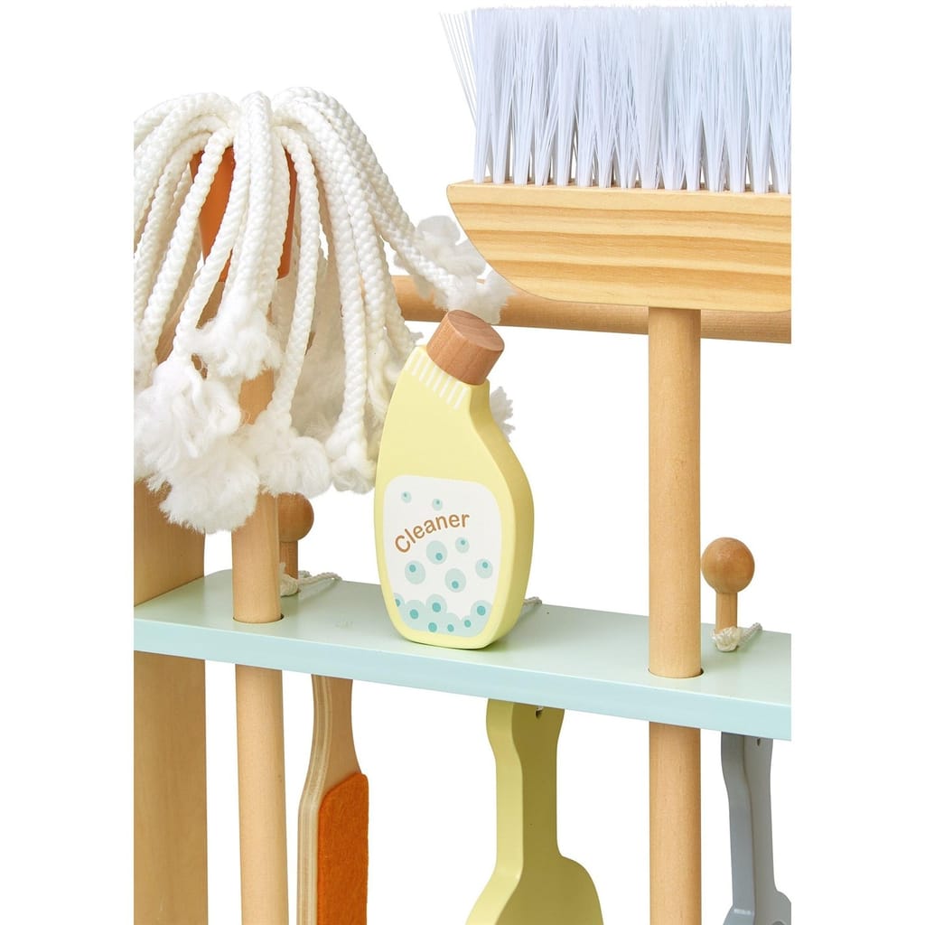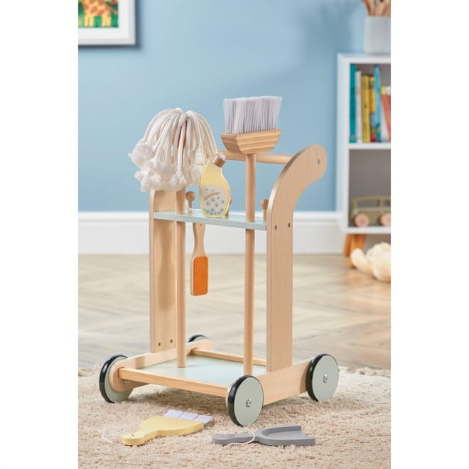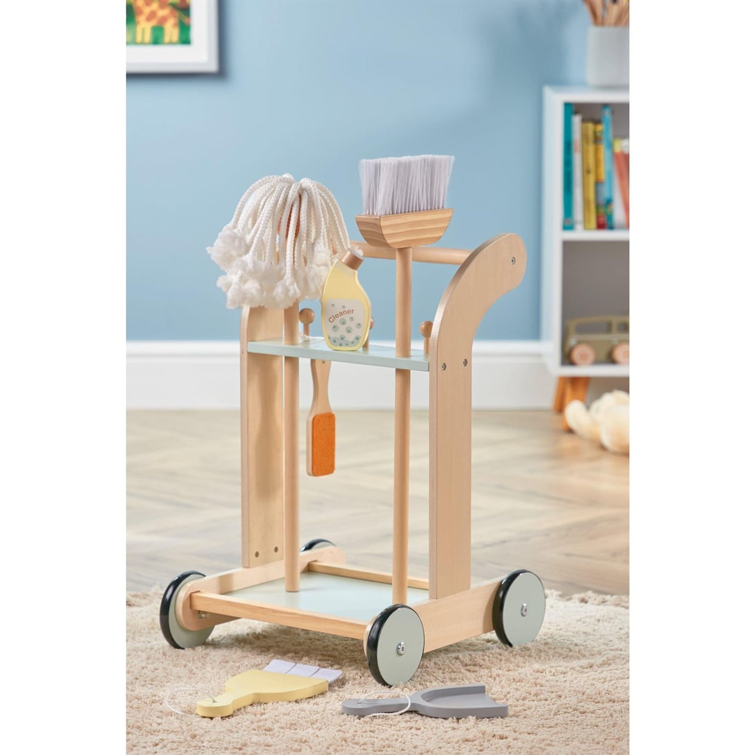 - Including cart, broom,cleanser, duster, dustpan and brush , all cleaning tools and toys can be hung on the cart, easy for children to move around and play house games, allowing children to carry out hours of chores in the pretend play. - Wooden 7-Piece Cleaning Set Toys
