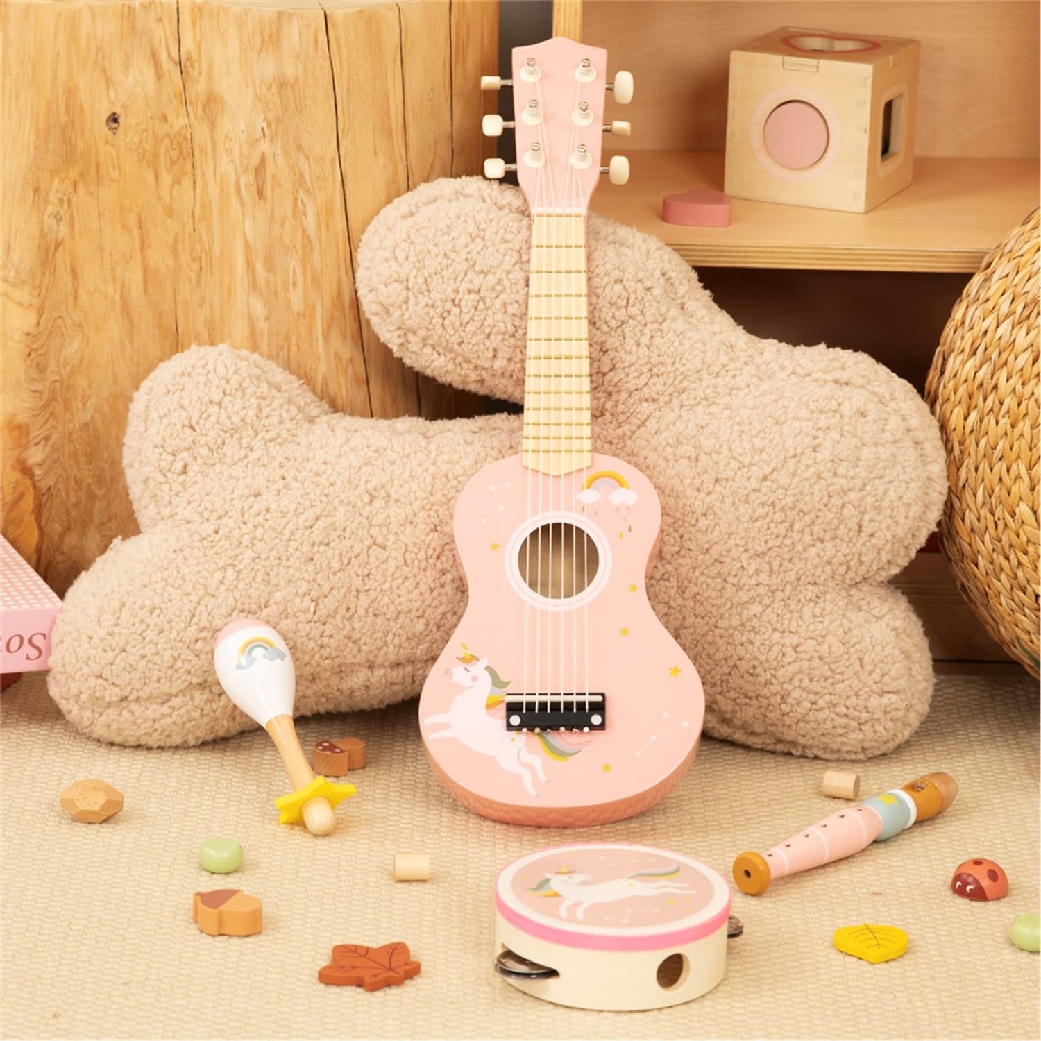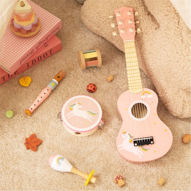 - The fully tunable pink guitar with nylon strings lets kids play their favorite tunes, while the other instruments develop rhythm, coordination, and auditory skills. It's a great way to nurture creativity and a love for music. - Durable and Eco-Friendly Construction