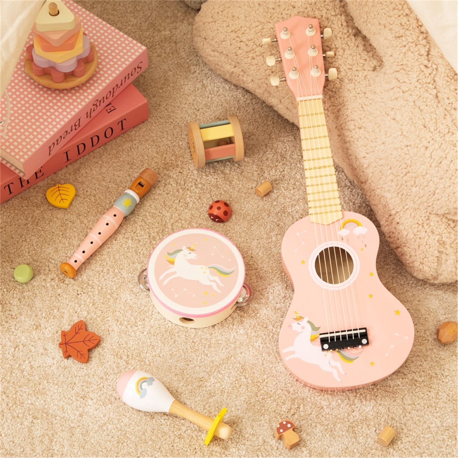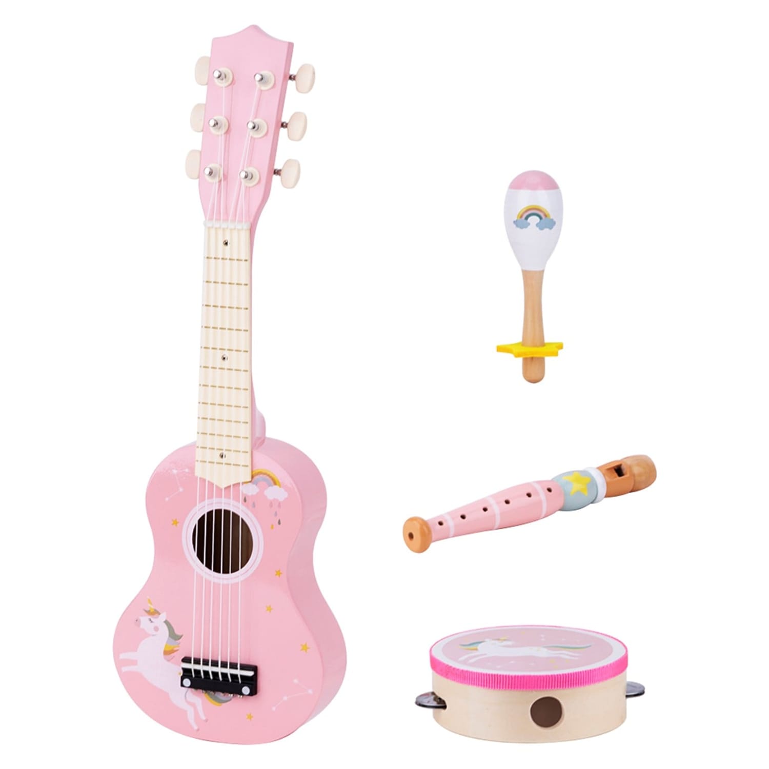 - This delightful set includes a wooden guitar, tambourine, recorder, and maraca, providing children with an engaging introduction to music. Crafted from durable, child-safe materials, it ensures both fun and safety during playtime. - Encourage Musical Exploration