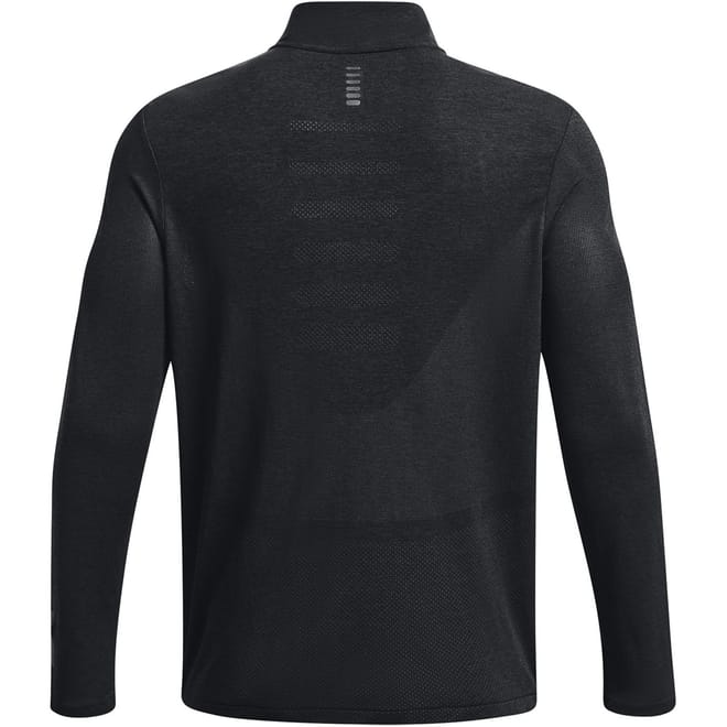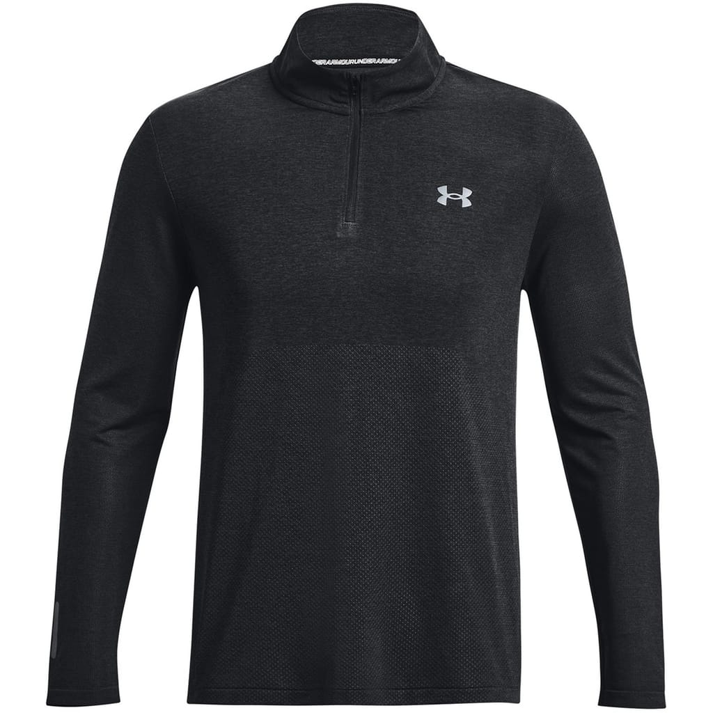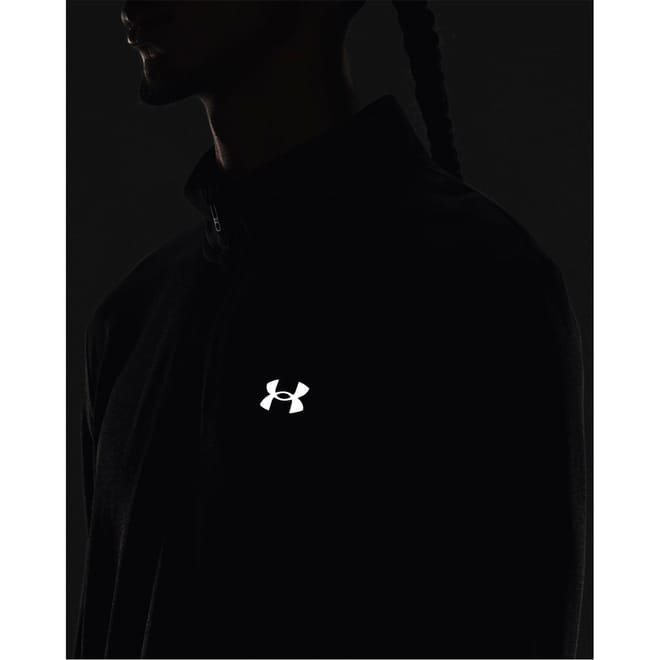 This Under Armour Stride sweatshirt from the activewear collection is perfect for running. It features a solid pattern with a zip neck and long sleeves. The quarter zipper closure and regular fit offer comfort and style. The sweatshirt is adorned with a logo and has ribbed cuffs for added detailing. Ideal for sports enthusiasts. -