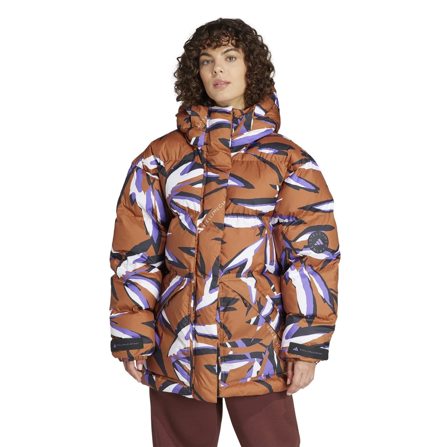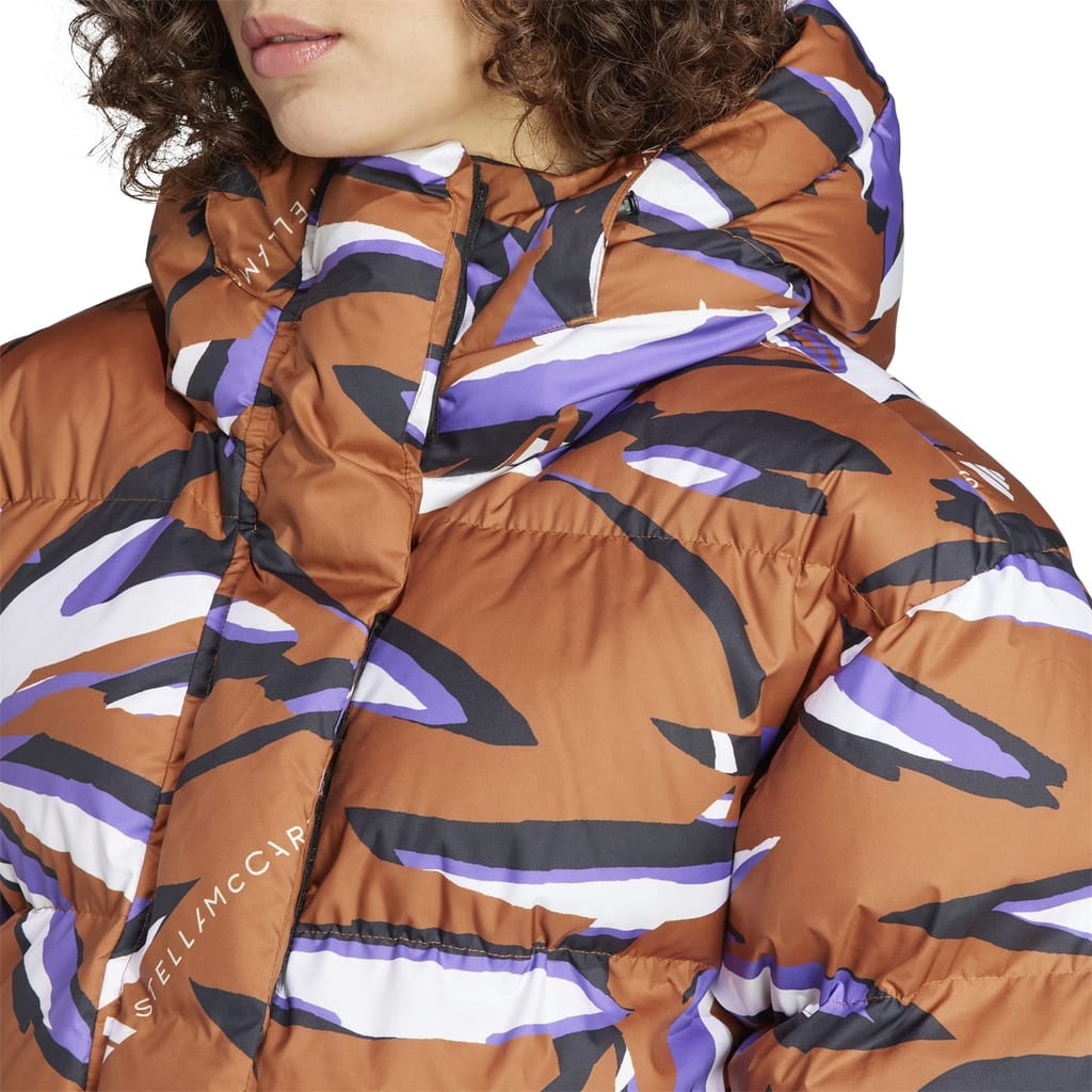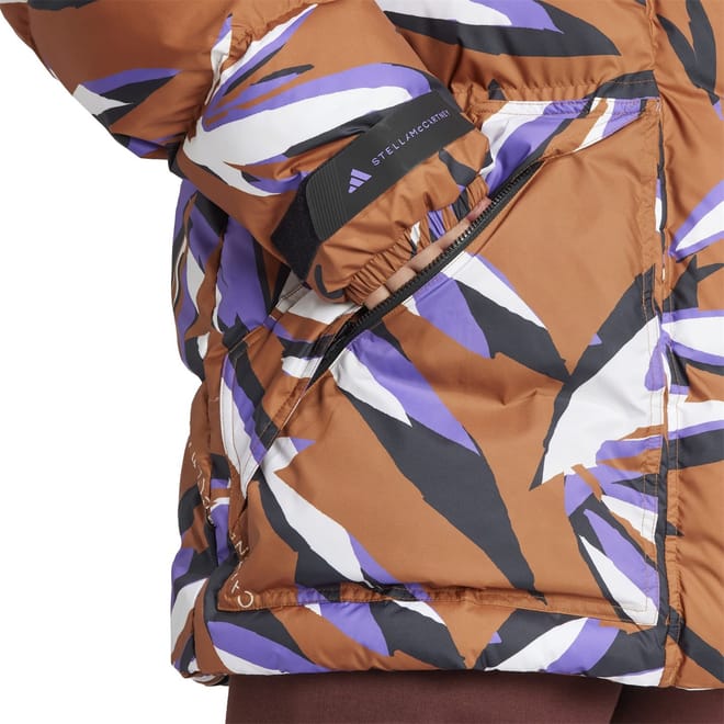 Stay warm with the adidas by stella mccartney jacket. This heavy weight puffer jacket features a hooded neckline and a relaxed fit. It has a stylish abstract pattern and is adorned with a logo embellishment. The zipper closure ensures easy wear. -
