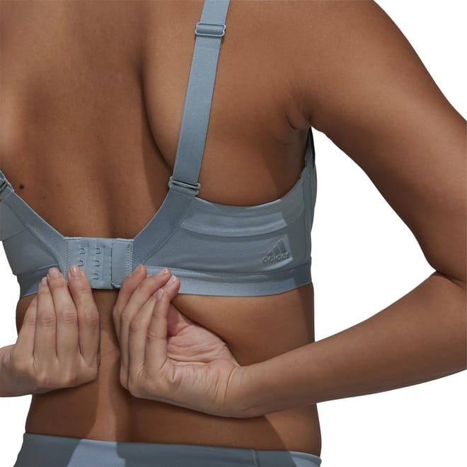 The adidas sports bra is a must-have for activewear collections. Designed for training, it features a compression fit and a scoop neck for optimal support. The sleeveless, cropped top has a hook and eye closure and showcases a solid pattern with a subtle logo embellishment. -