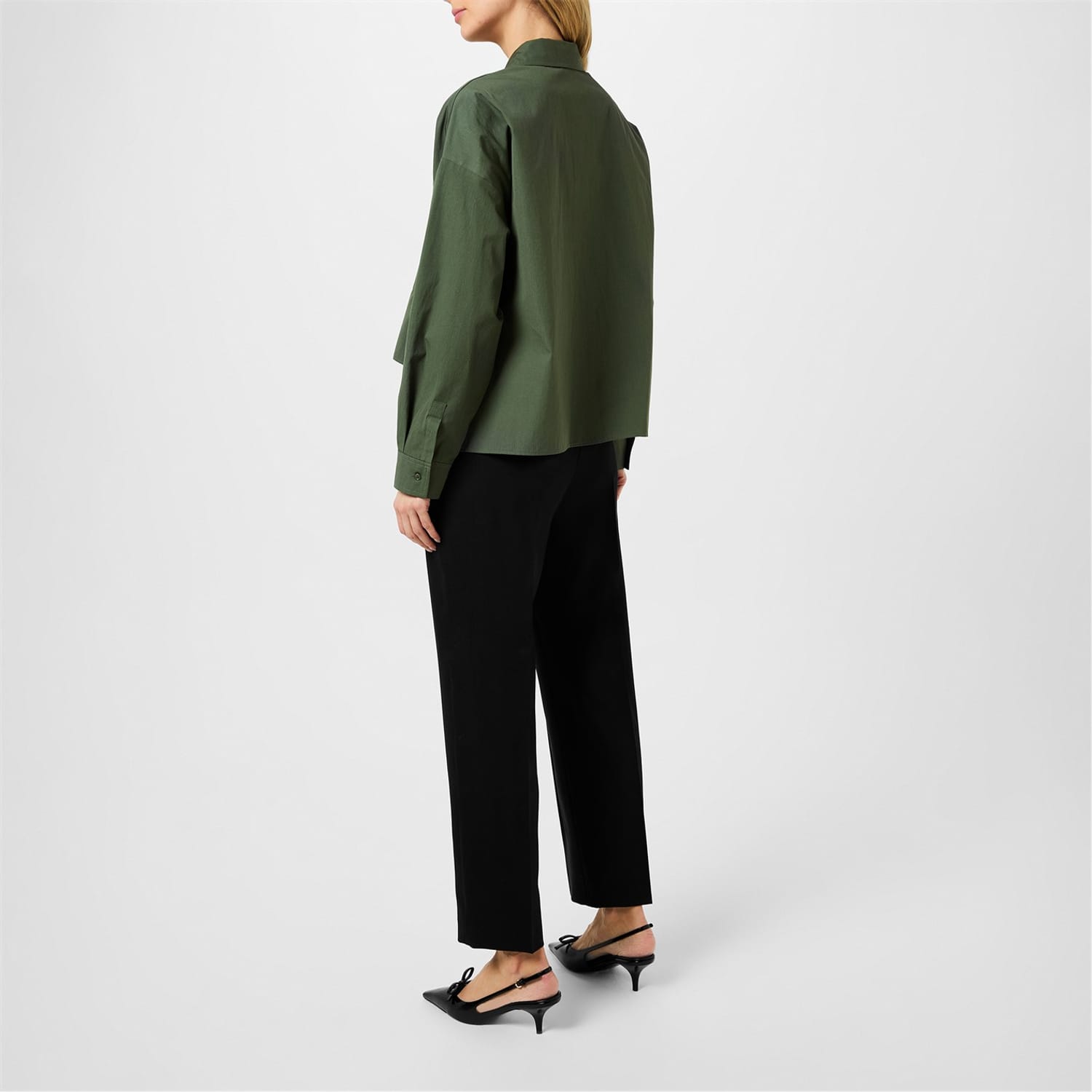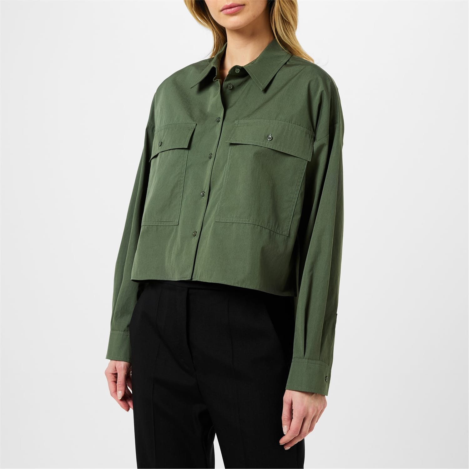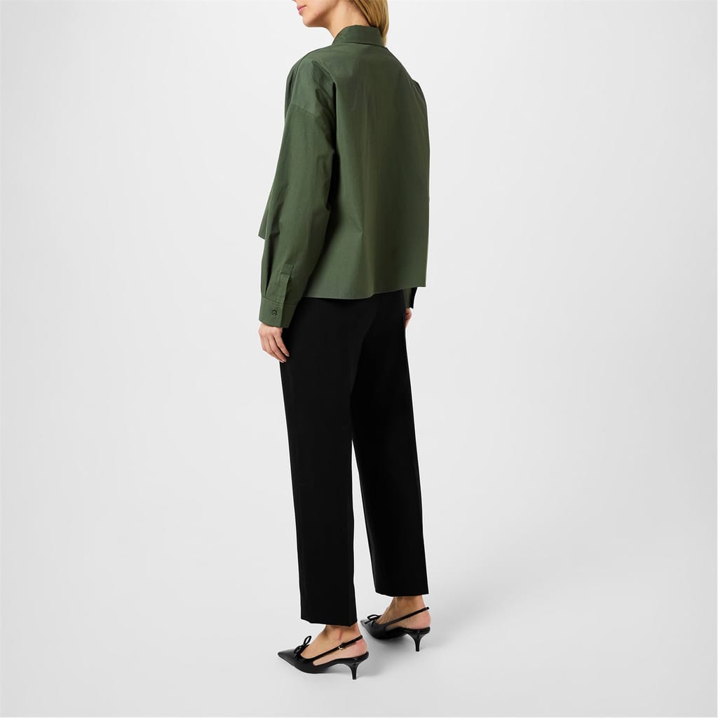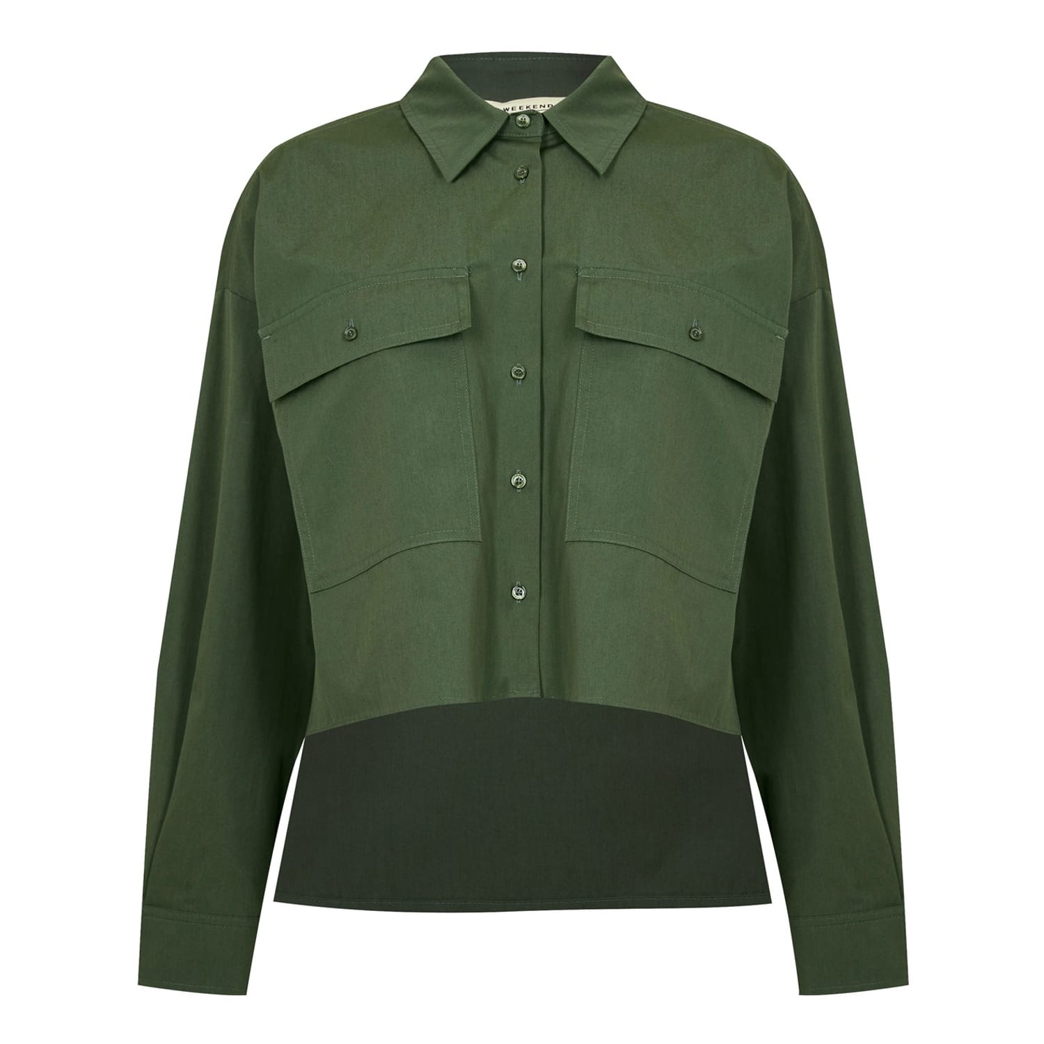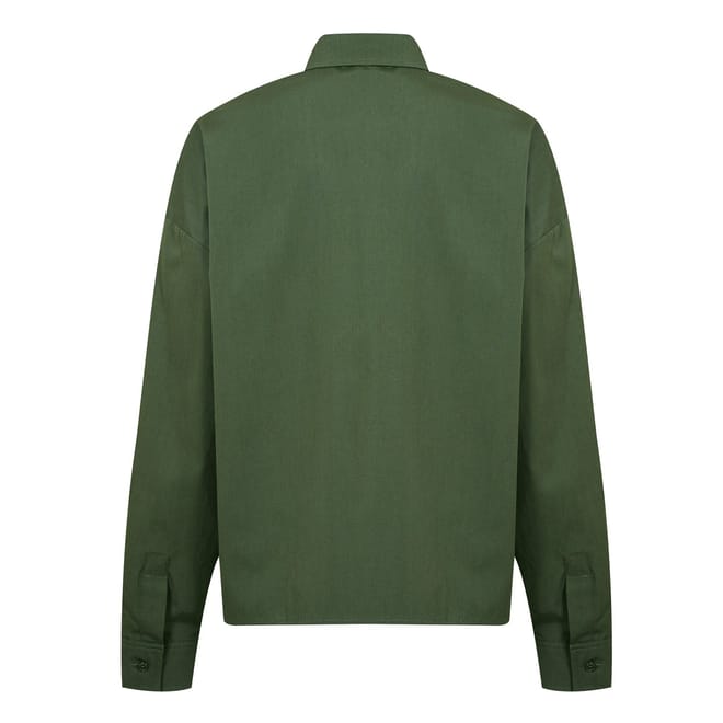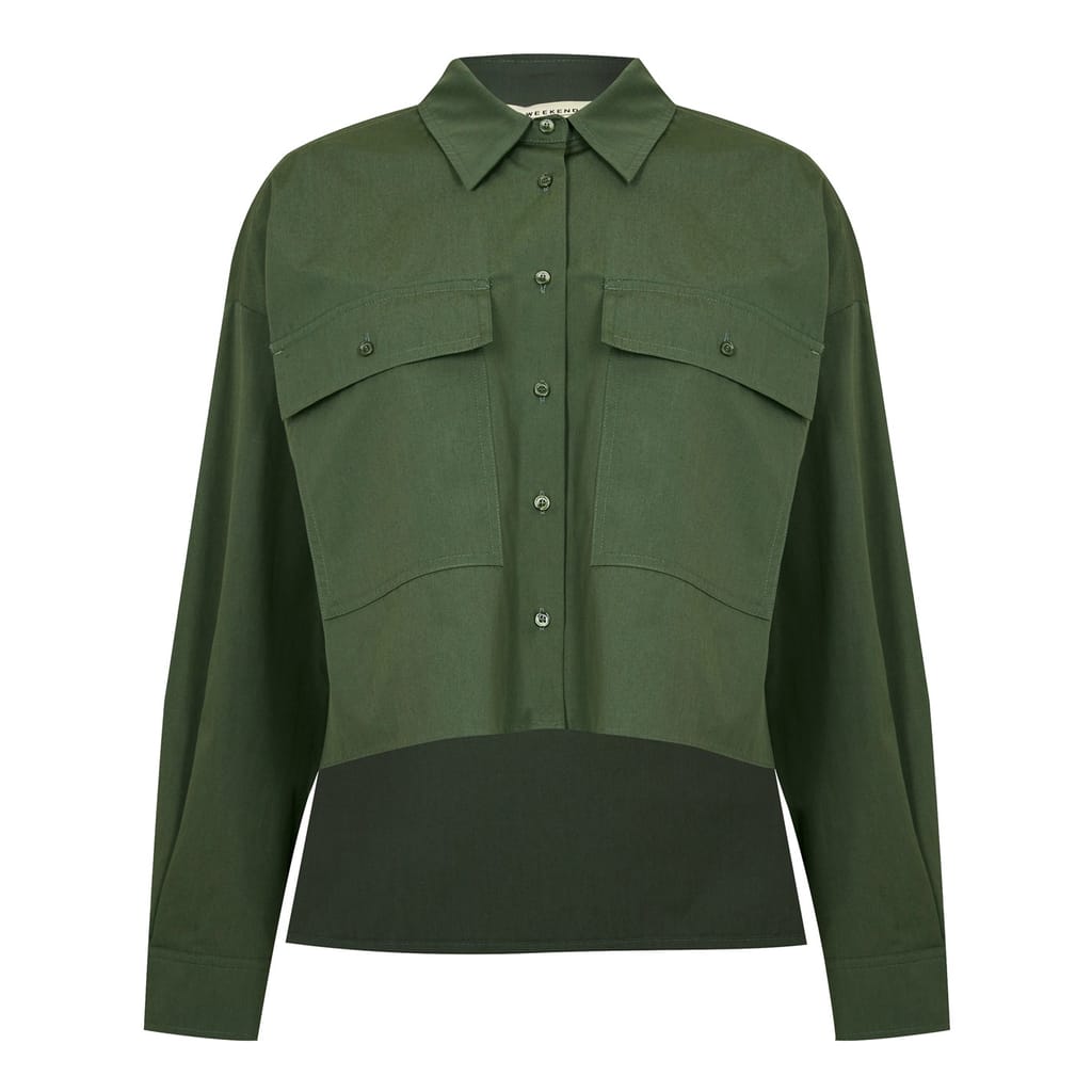 This Max Mara Weekend utility shirt features a solid pattern and long sleeves. Designed with a shirt collar and button closure, it offers a relaxed fit. The cropped length adds a modern touch to this versatile top. -