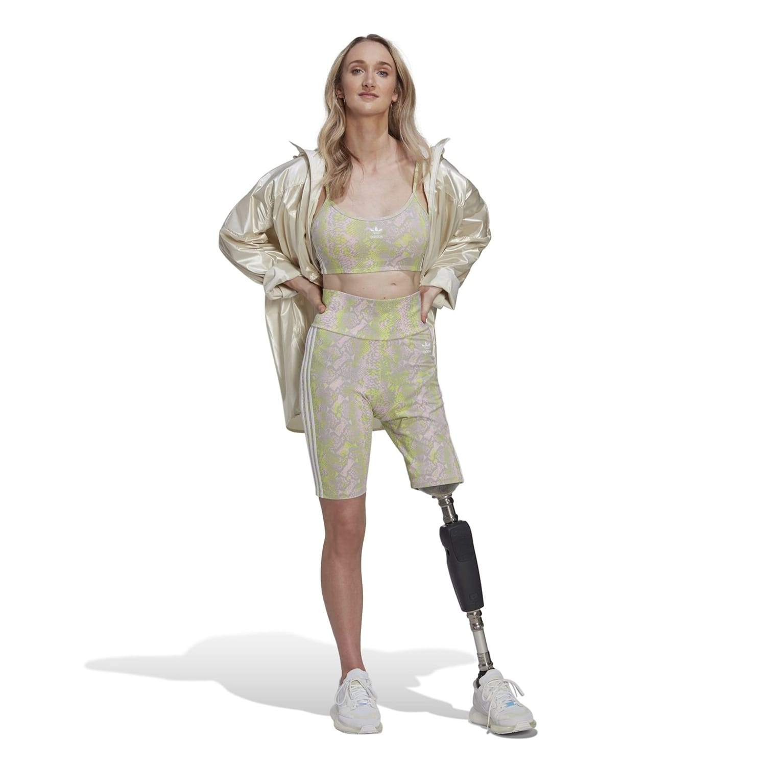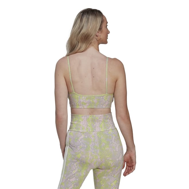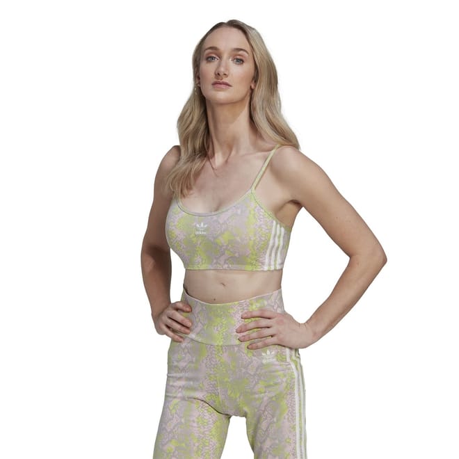 Elevate your workout with the adidas Originals sports bra. This slim-fit, sleeveless top features a stylish snake skin textured pattern and a scoop neckline, perfect for training sessions. The spaghetti strap design and cropped length offer both comfort and a modern look. Part of the activewear collection, it includes a logo embellishment for a touch of brand flair. -