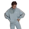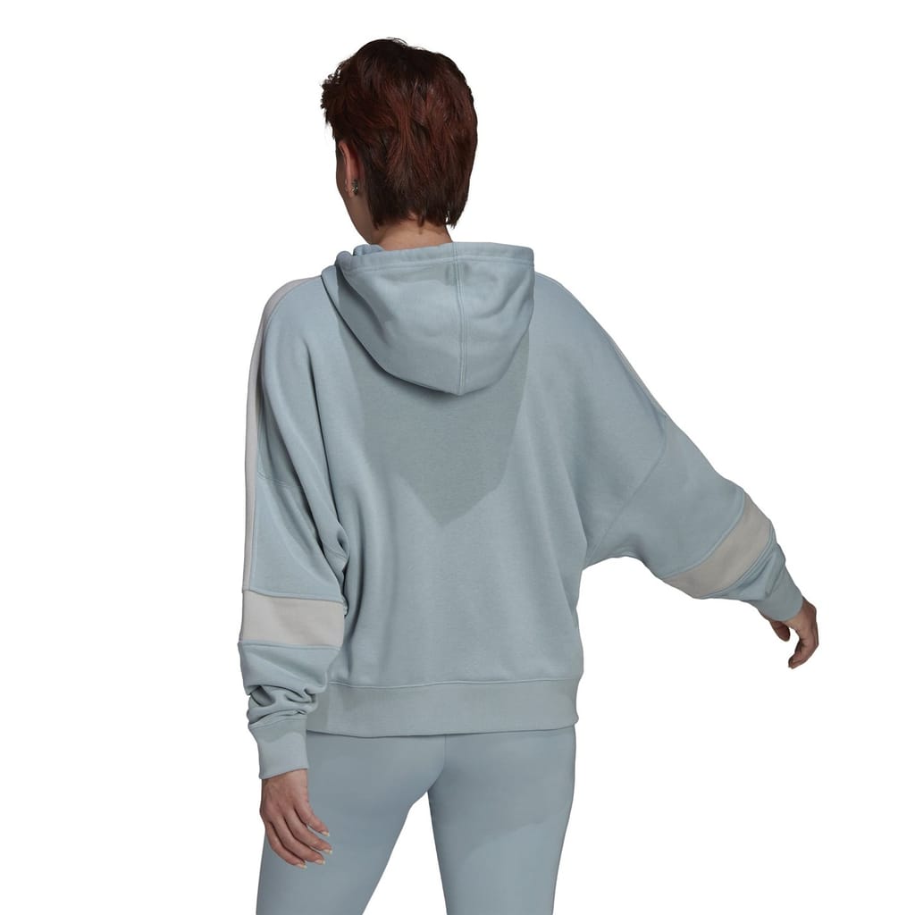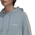This Adidas Originals jacket from the outerwear collection features a hooded neckline and long raglan sleeves. Crafted in an oversize fit with a drawstring closure and ribbed cuffs, it offers both comfort and style. The waist-length design showcases a color block pattern and a distinctive logo embellishment. -